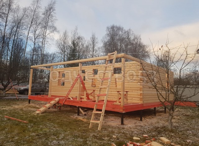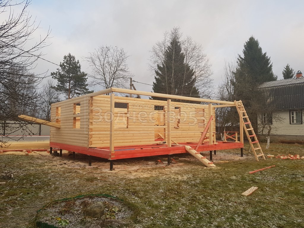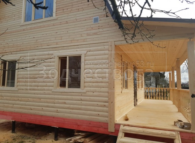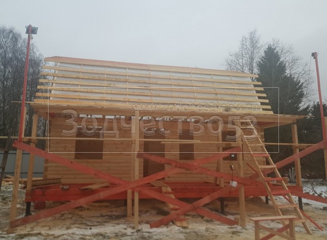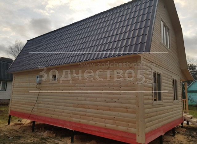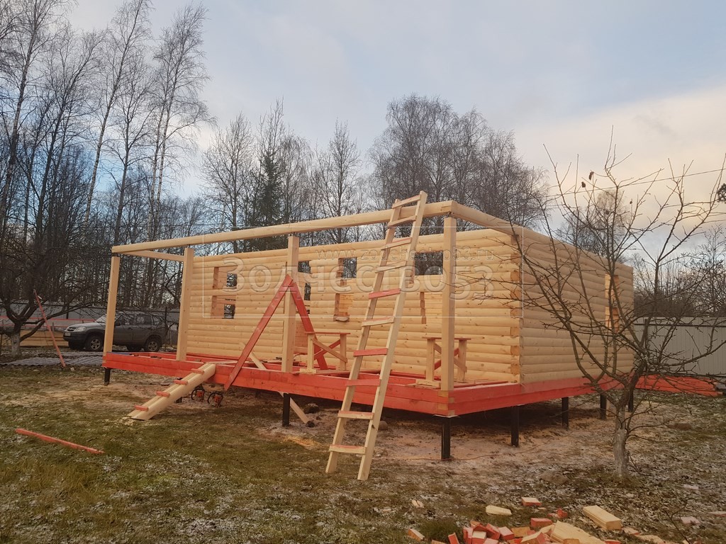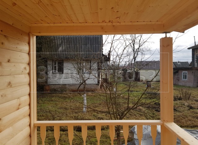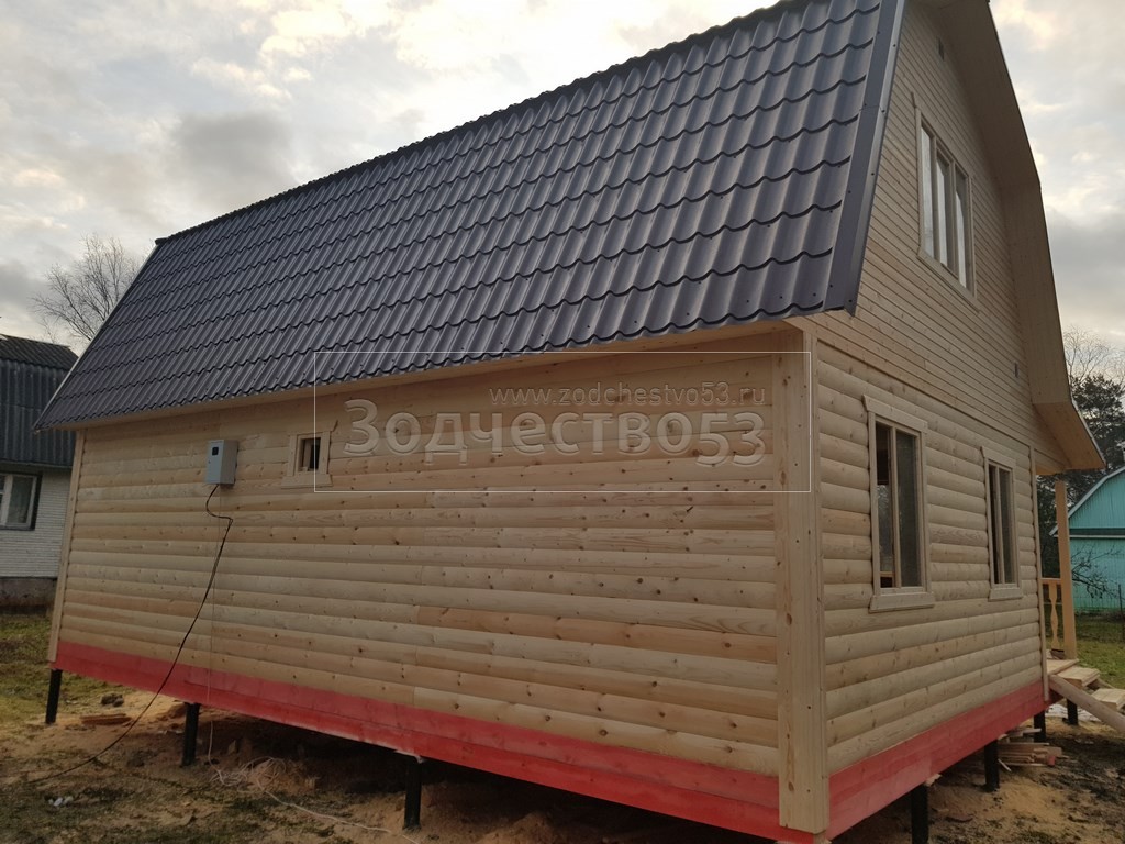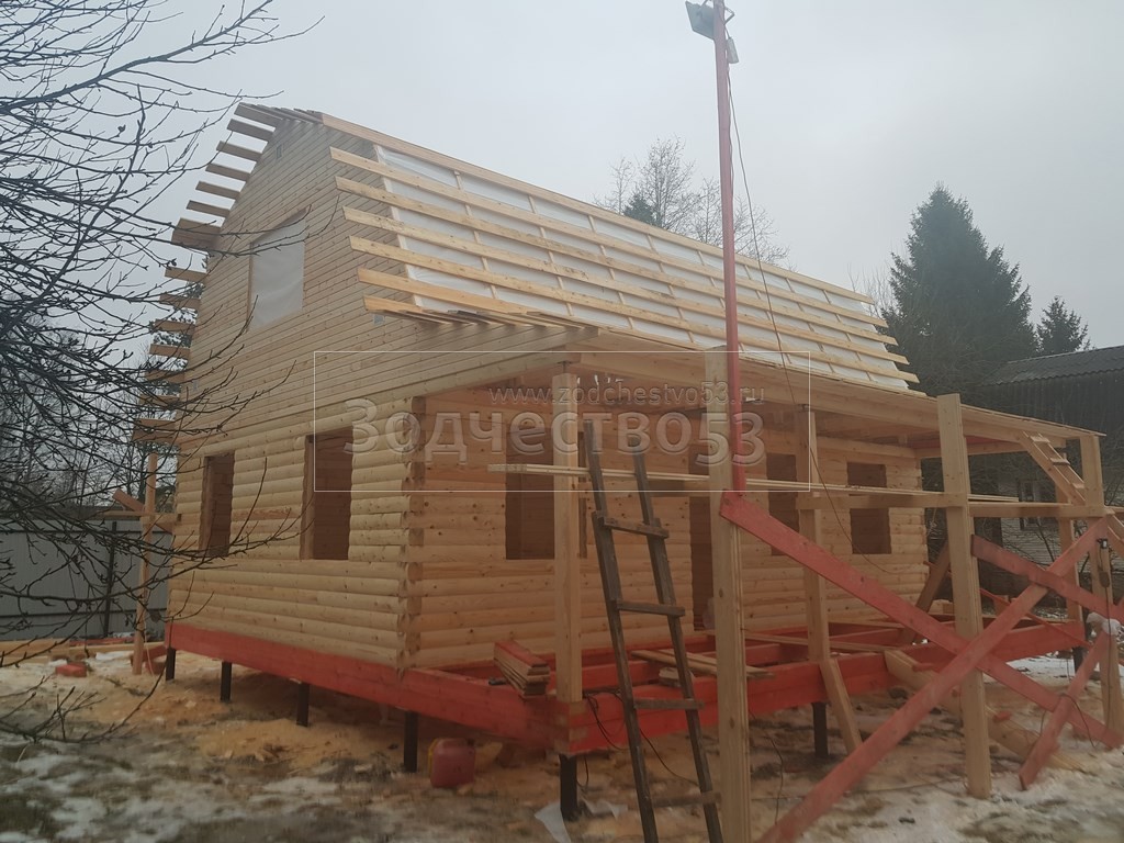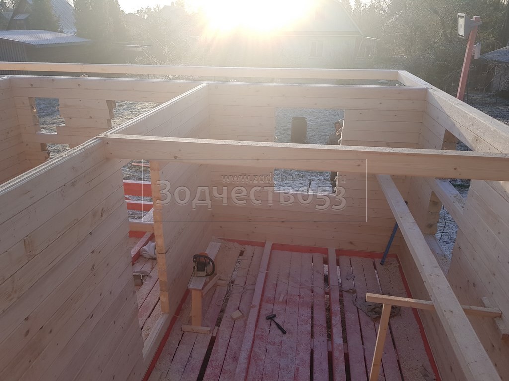 Дом общими размерами 8.0*9.0 (6.0*9.0 из профилированного бруса 140*140, под ломаной крышей и 2.0*9.0 открытая терраса под отдельной односкатной крышей). Построен: Ленинградская область, Кировский район, СНТ Восход 4, улица Детская 1.