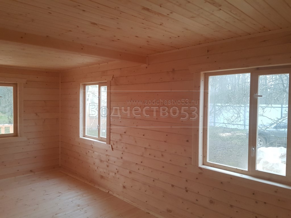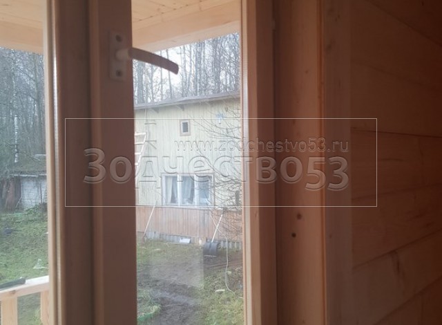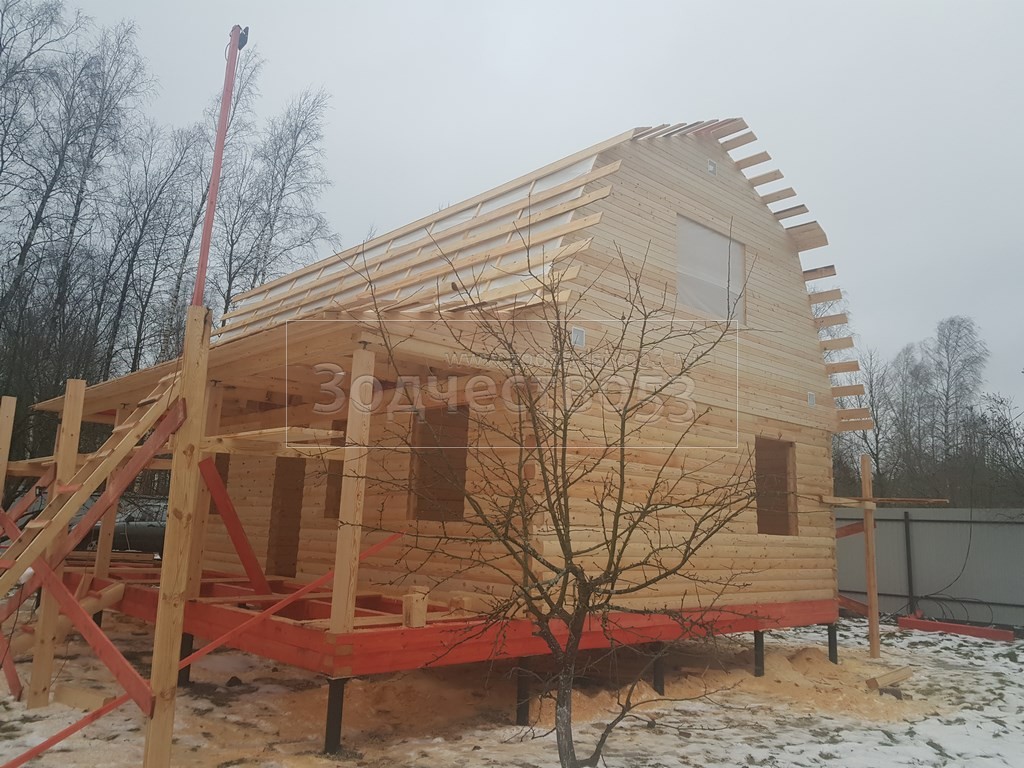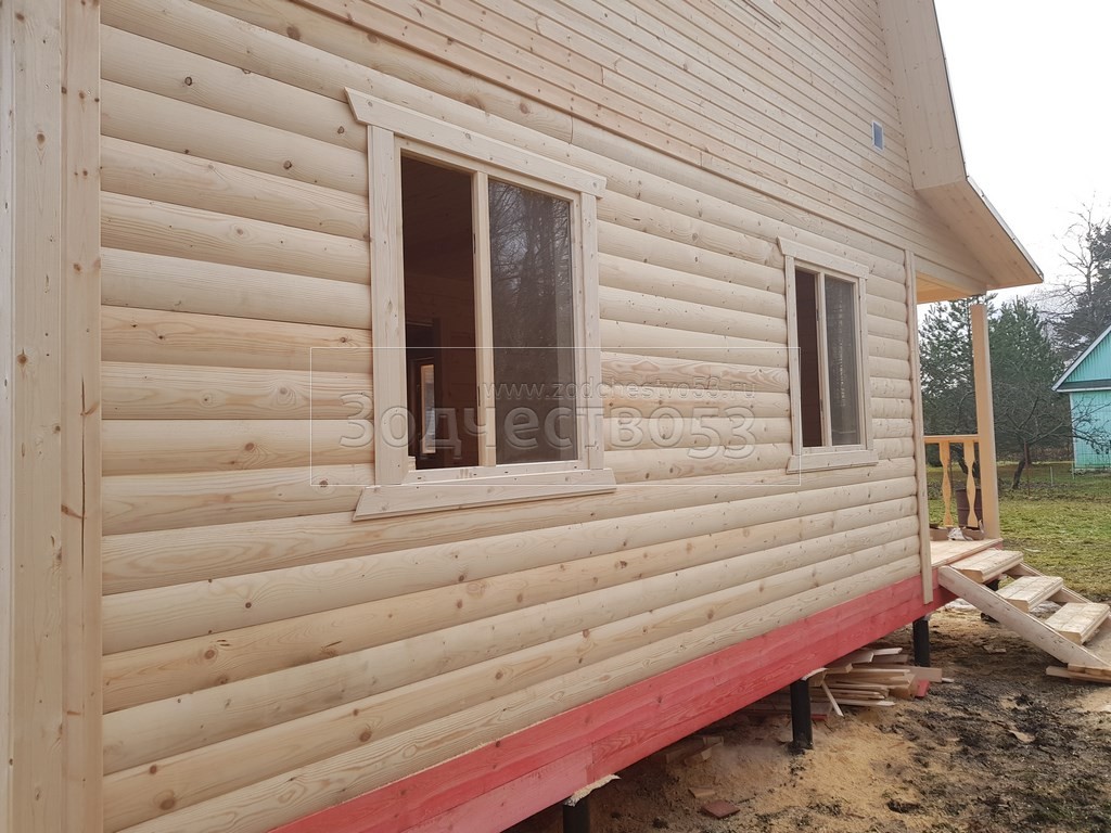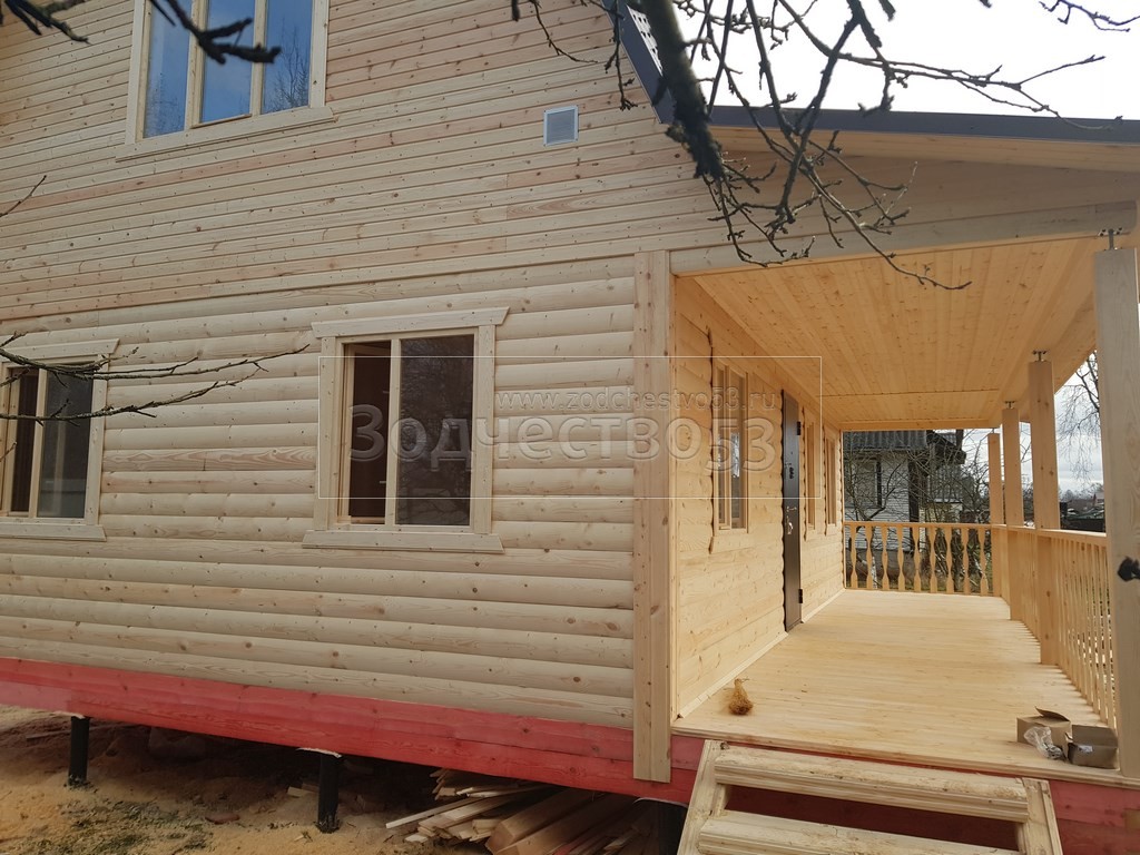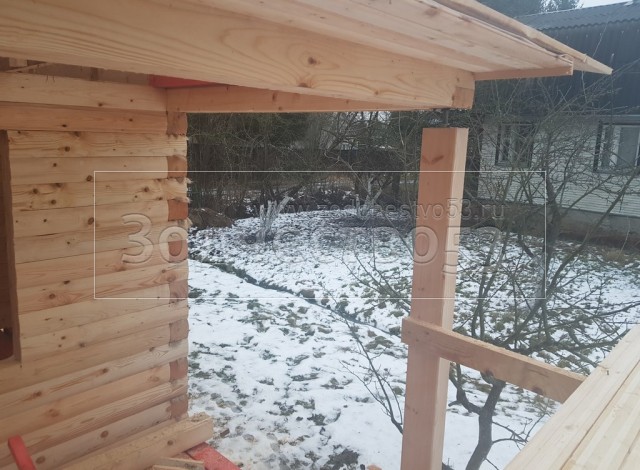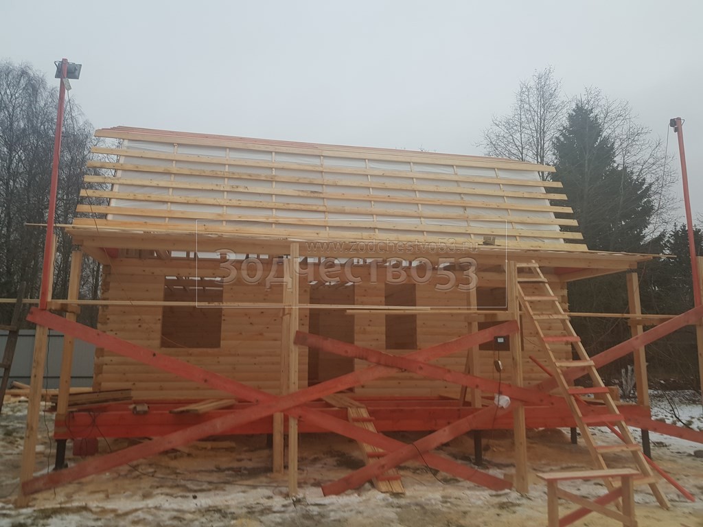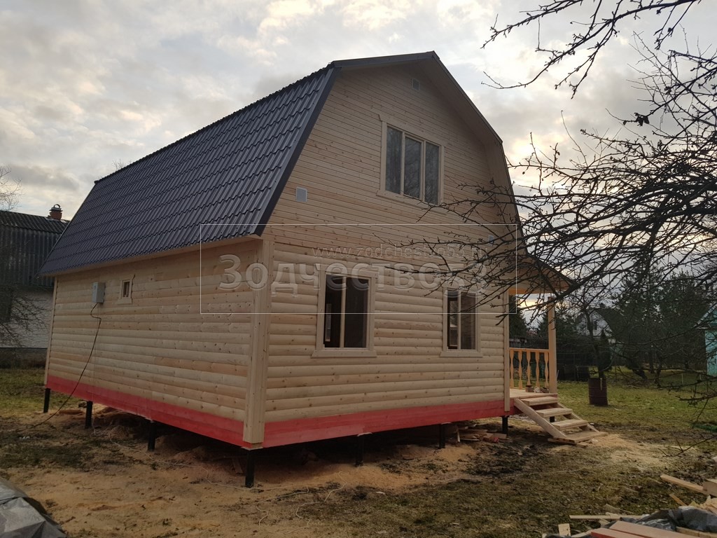 Дом общими размерами 8.0*9.0 (6.0*9.0 из профилированного бруса 140*140, под ломаной крышей и 2.0*9.0 открытая терраса под отдельной односкатной крышей). Построен: Ленинградская область, Кировский район, СНТ Восход 4, улица Детская 1.