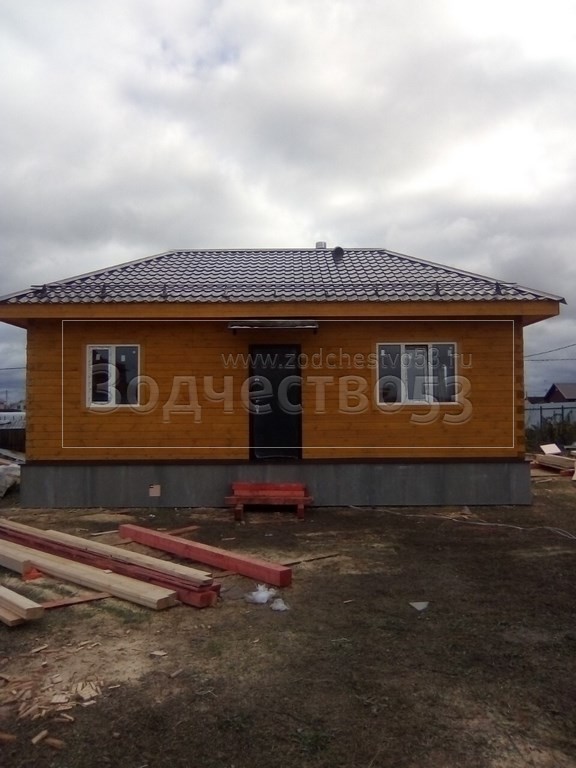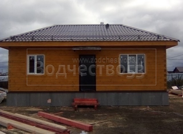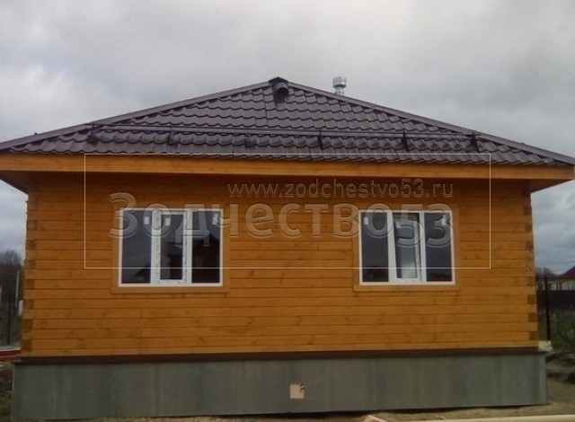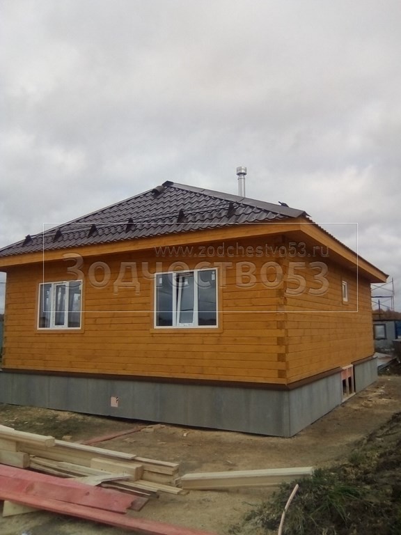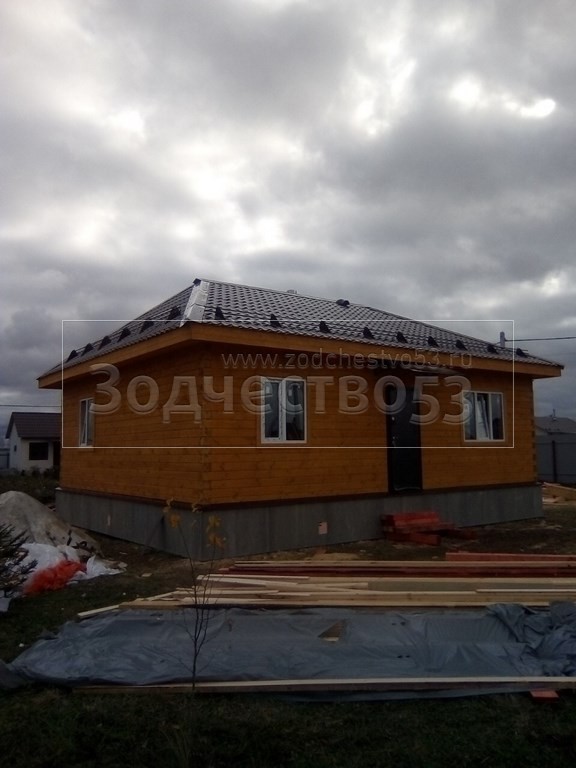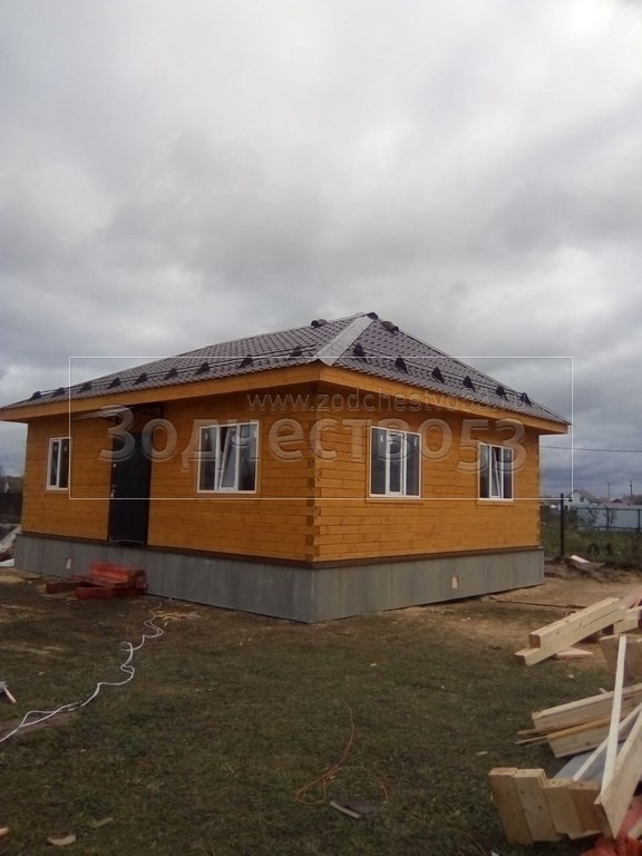 Одноэтажный дом, общими размерами 9.0х7.50 из профилированного бруса 140х140 под вальмовой четырехскатной крышей(тип конверта. Объект построен: Московская обл., Чеховский р-он, КП Южный причал.