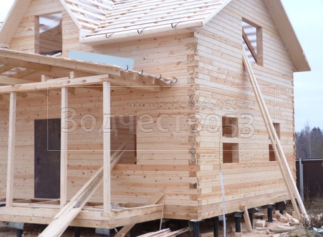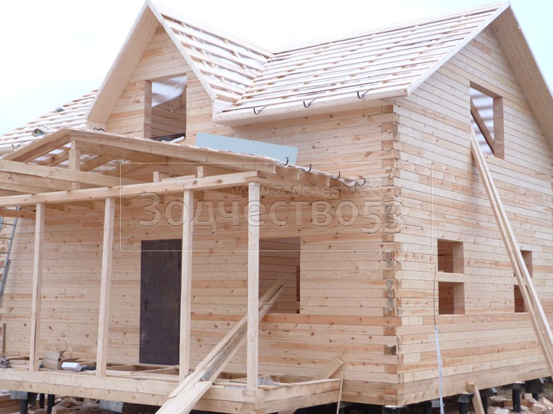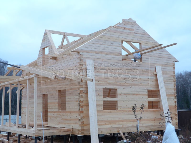 Сруб дома общими размерами 9×9. Полутороэтажный сруб дома 7×9 с брусовыми фронтонами и кукушкой из профилированного бруса 200×150 и открытая терраса 2×7 под отдельной крышей. Построен в Волоколамском районе, д. Себенки