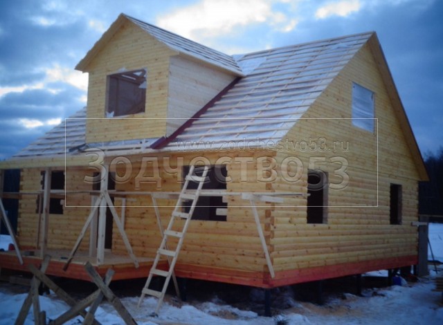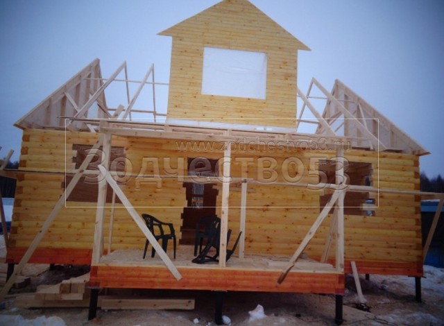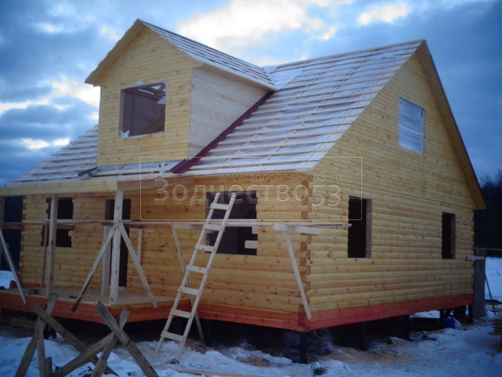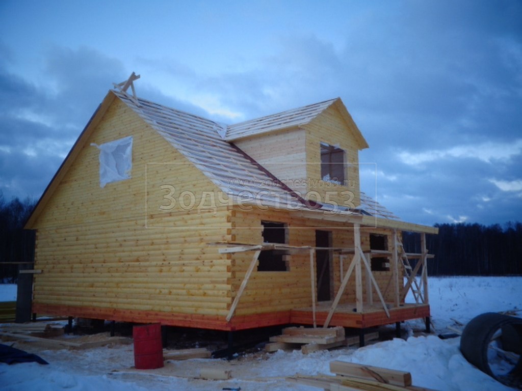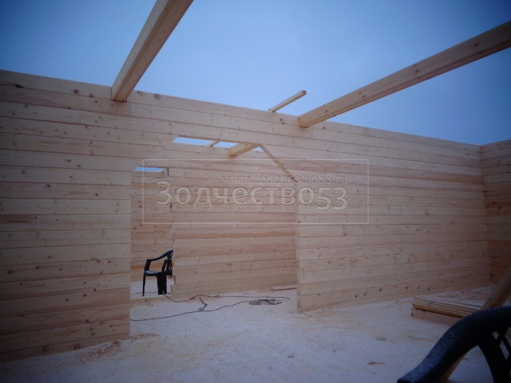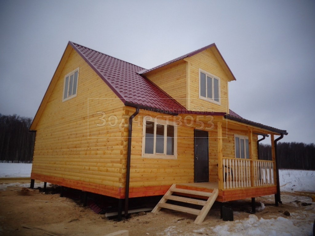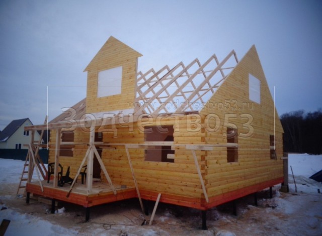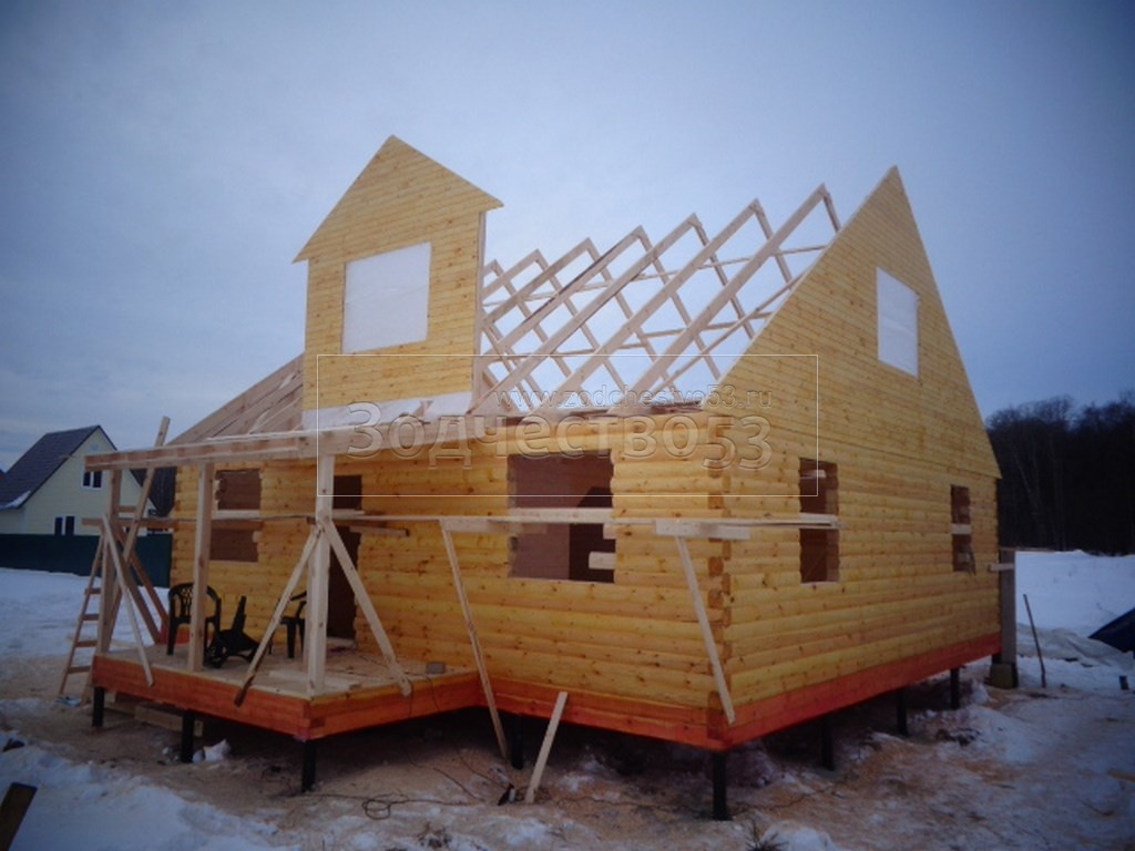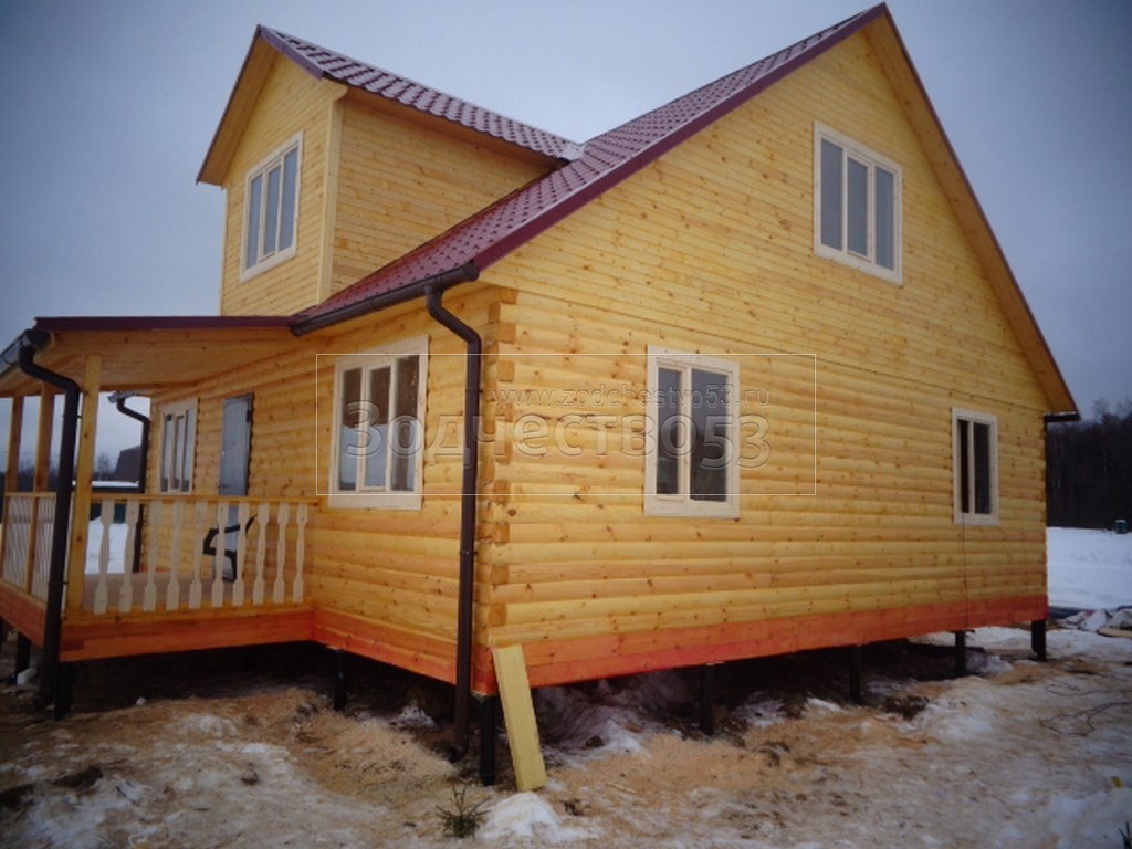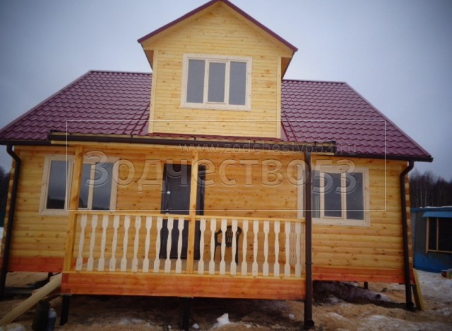 Дом 9,0х9,0 из профилированного бруса 150х150 под двухскатной крышей и открытой террассой 2,0х4,0 под отдельной односкатной крышей. Построен в Московской области, Чеховский р-н.