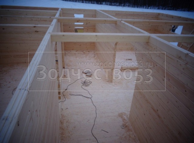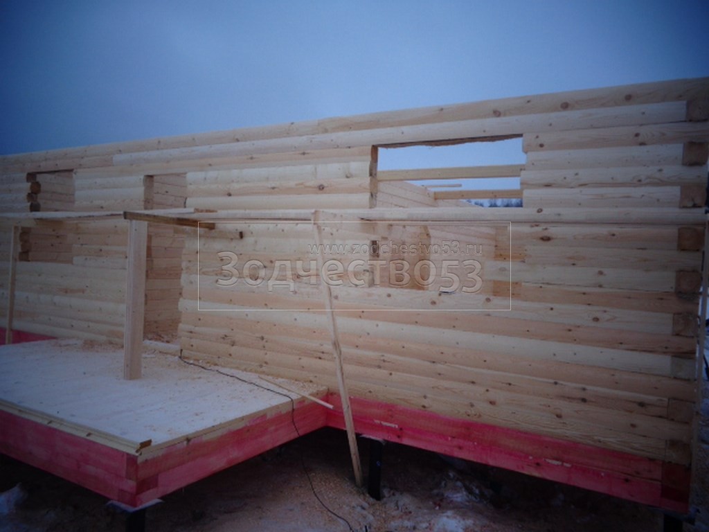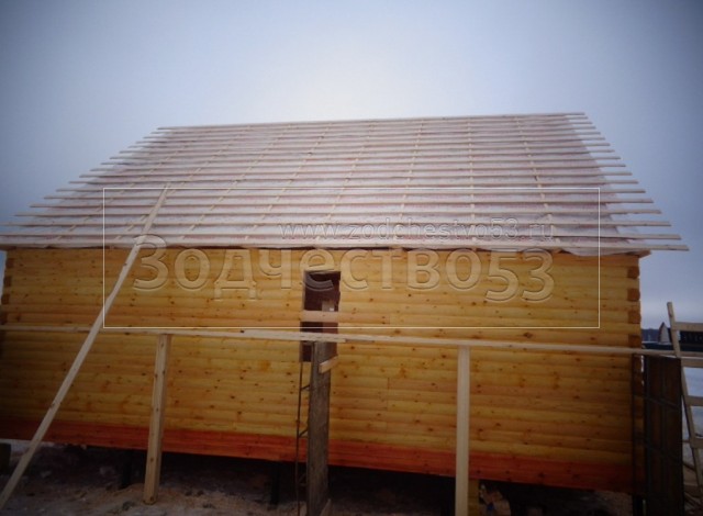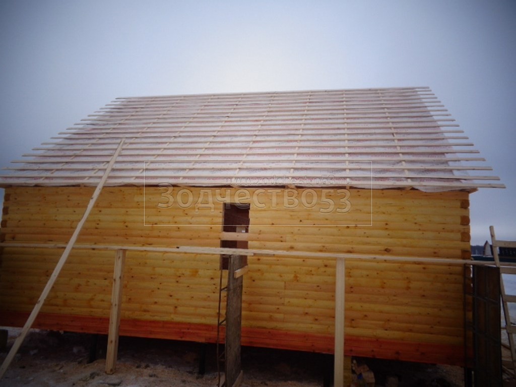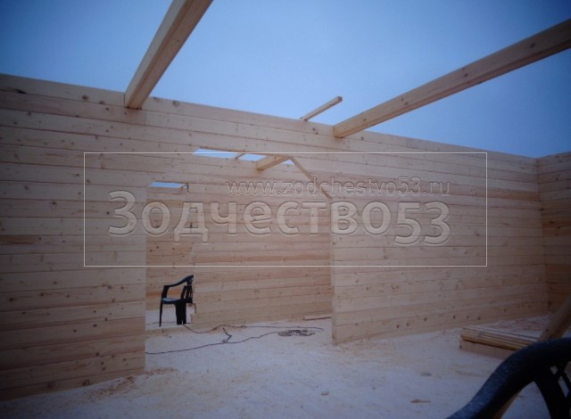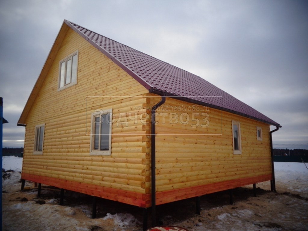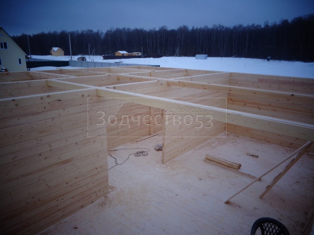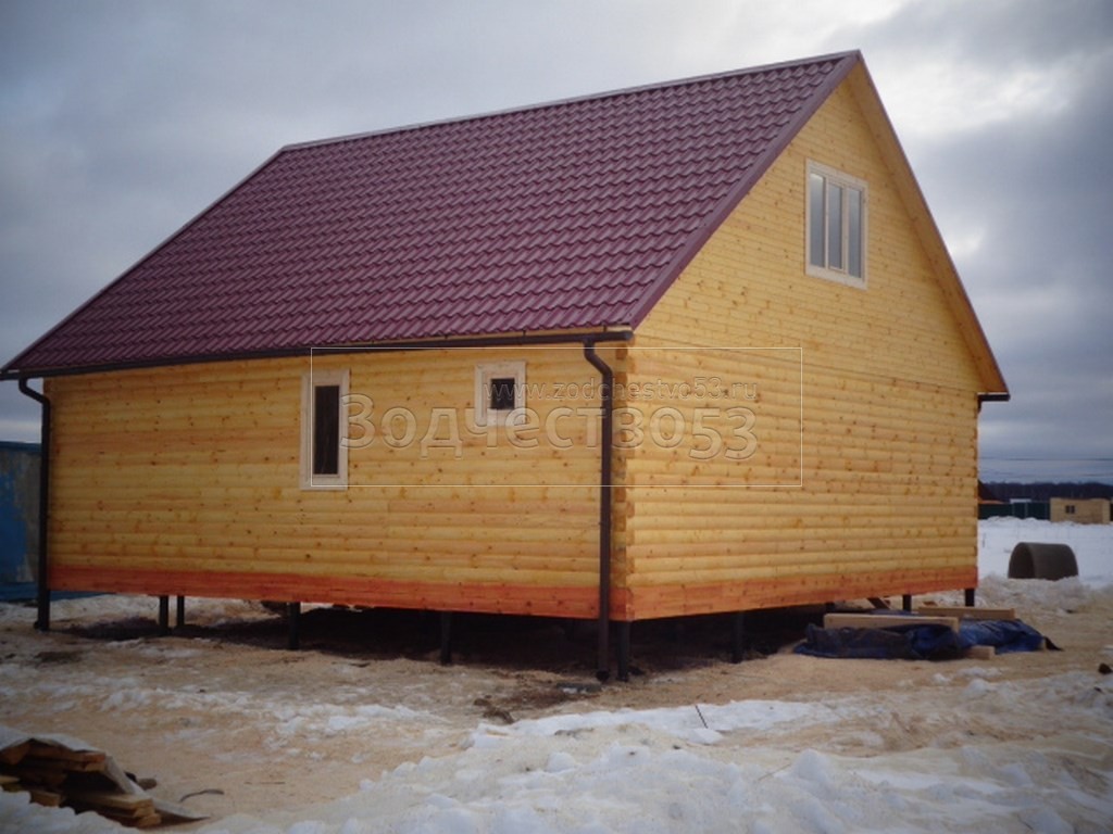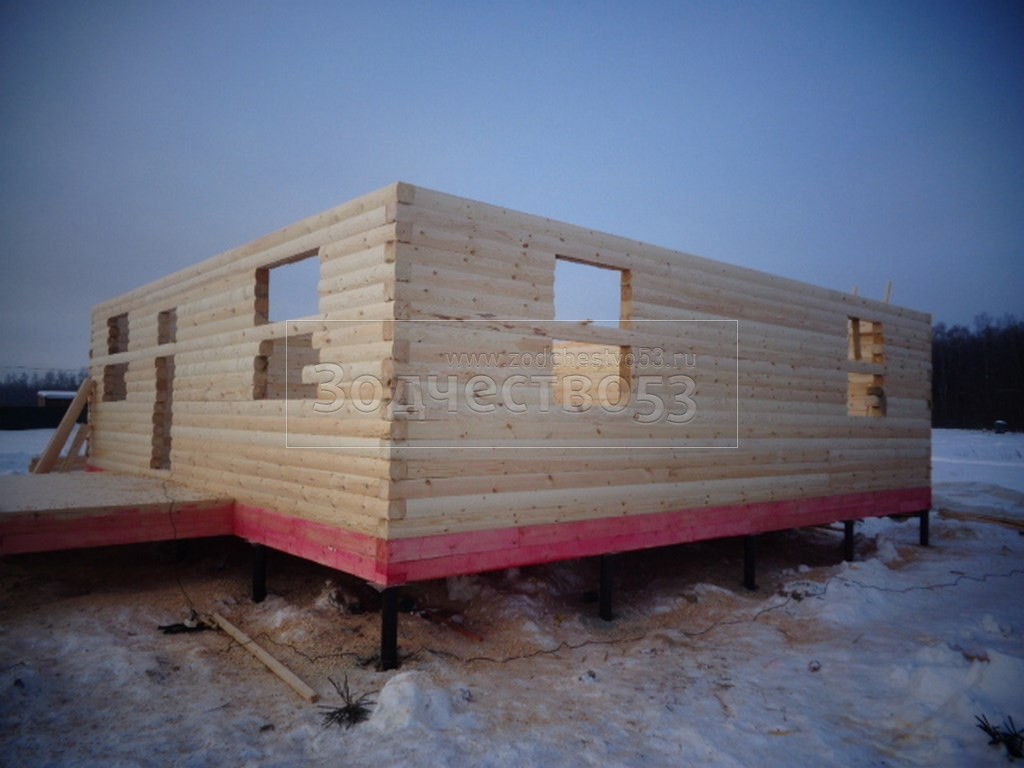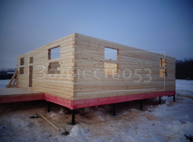 Дом 9,0х9,0 из профилированного бруса 150х150 под двухскатной крышей и открытой террассой 2,0х4,0 под отдельной односкатной крышей. Построен в Московской области, Чеховский р-н.
