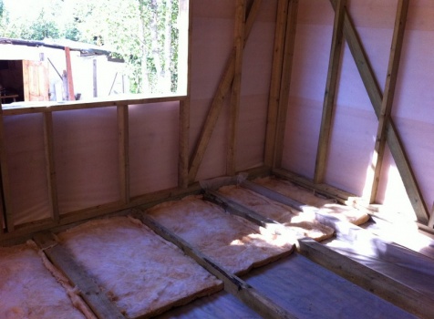 Полы: первый этаж — 36мм., второй этаж — 28мм., шпунтованная доска с утеплением в 100 мм. (Изовер ) с проложкой парогидроизоляции в два слоя.