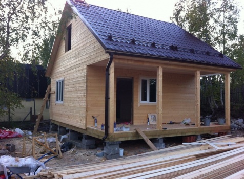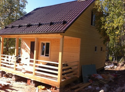 Стены первого этажа высотой 2.4 метра каркасно-щитовые, со сборкой на металлические углы и пластины, каркас из обрезной доски 40×100 с утеплением в 100 мм., ( Роквул) с двойной проложкой парогидроизоляции. Снаружи стены обшиты имтацией бруса, внутри — вагонкой 16 мм.