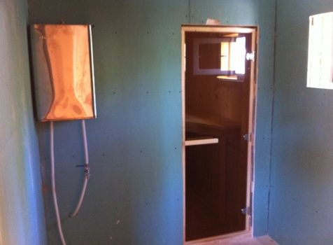 Парная обшита осиновой вагонкой с проложкой из фольги с установкой полков. В парной установлена печь Ермак 12 (Элит ПС) со всеми комплектующими с обложкой печи из кирпича.