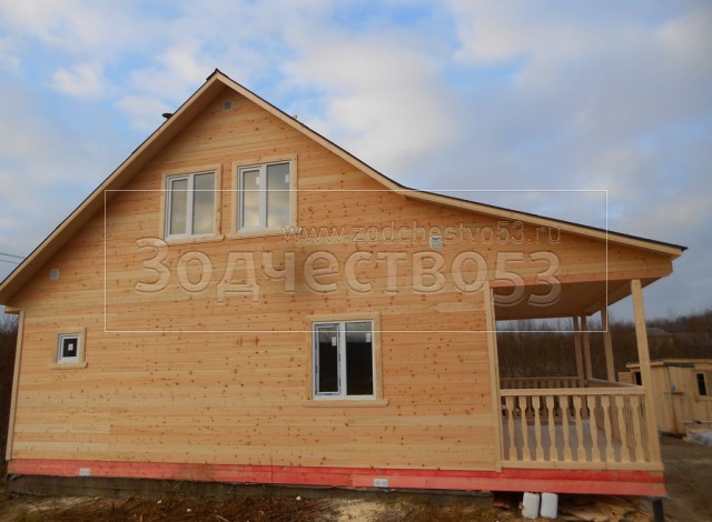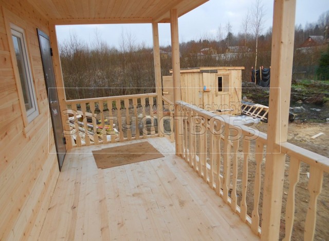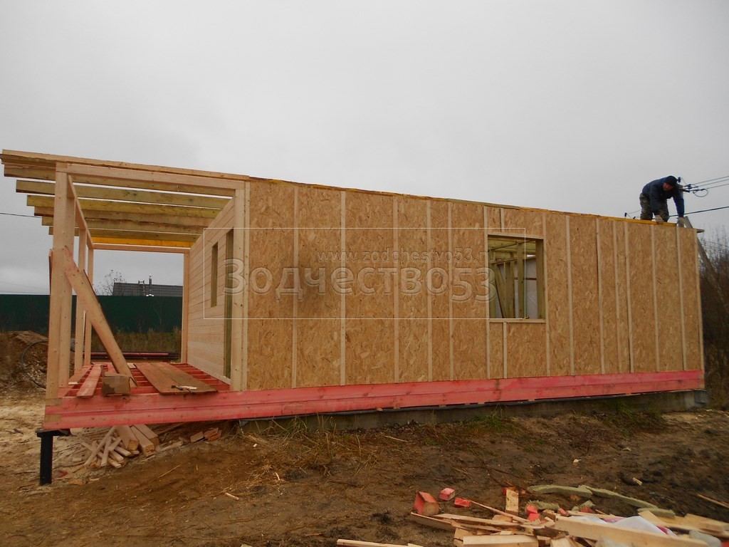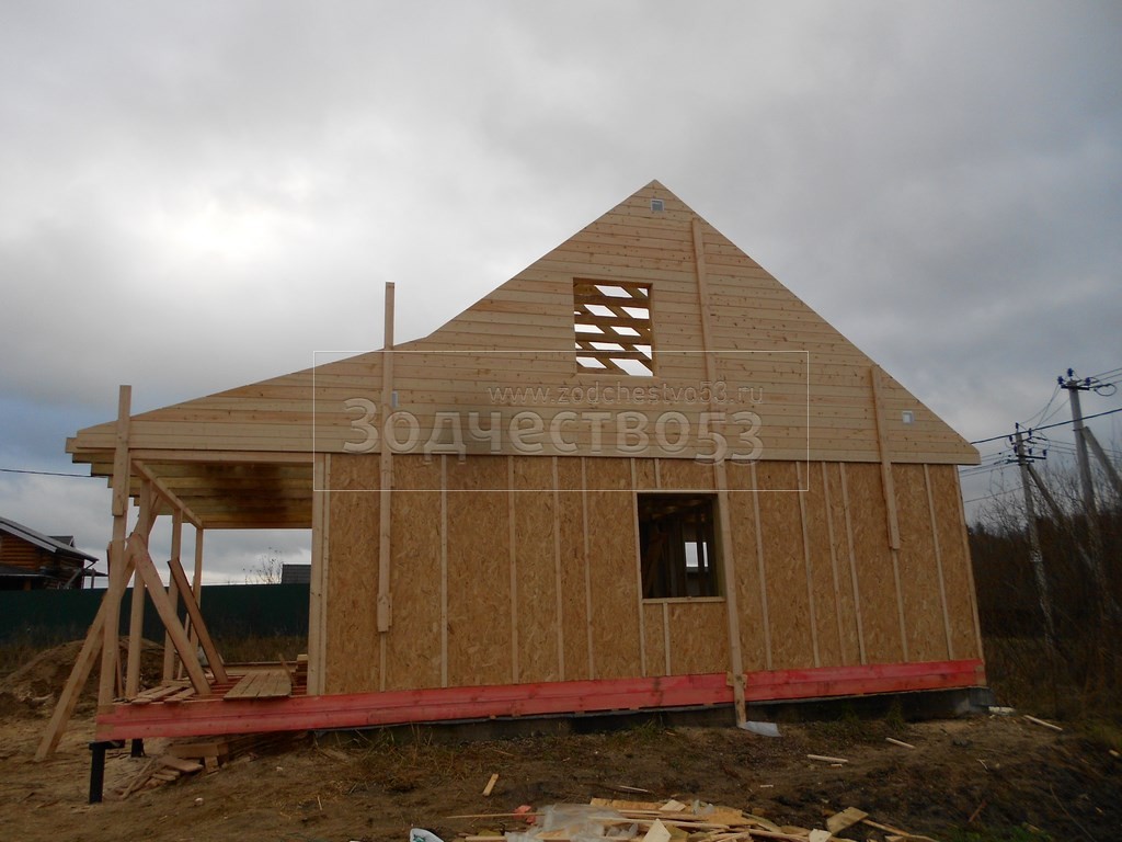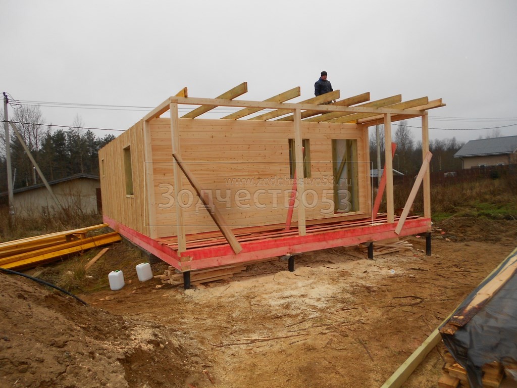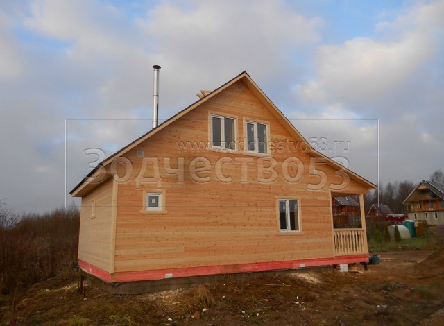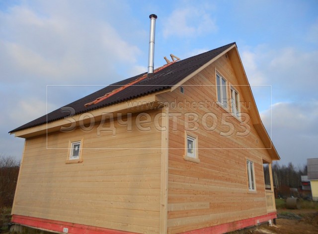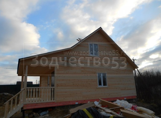 Дом-баня общими размерами 6×10 м. (6×8 каркасно-щитовая дом-баня, и открытая терраса 2×6) построена в Ленинградской обл., Кировский р-н, ЗАО «Мгинское»