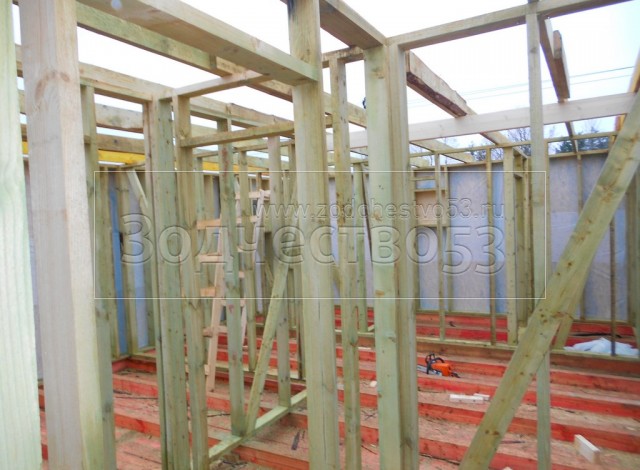 - стены каркасно-щитовые 40×150, снаружи обшиваются OSB 9мм и имитация бруса, внутри- имитация бруса. Утепление 150 мм.