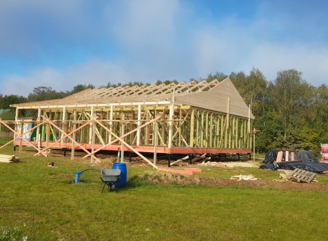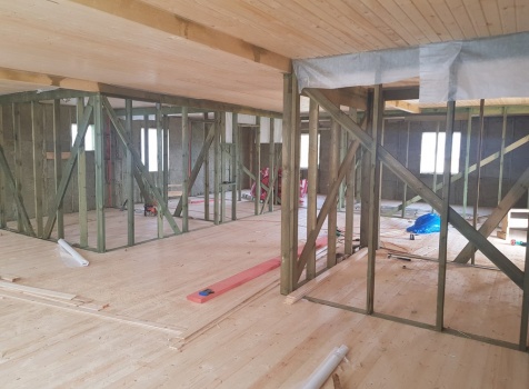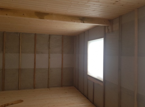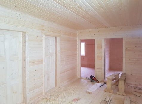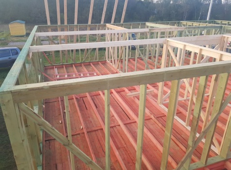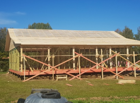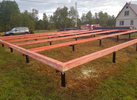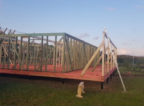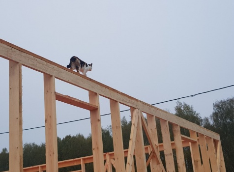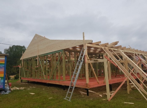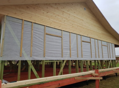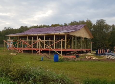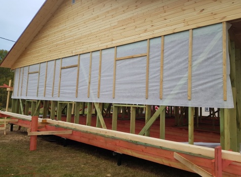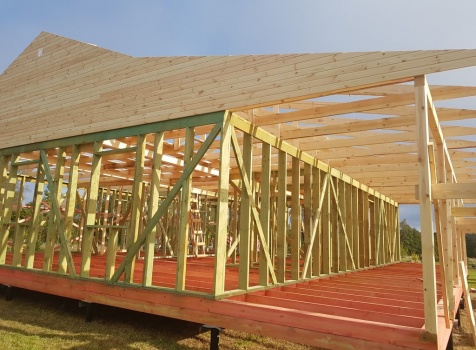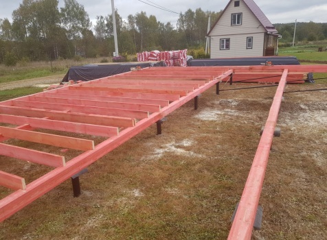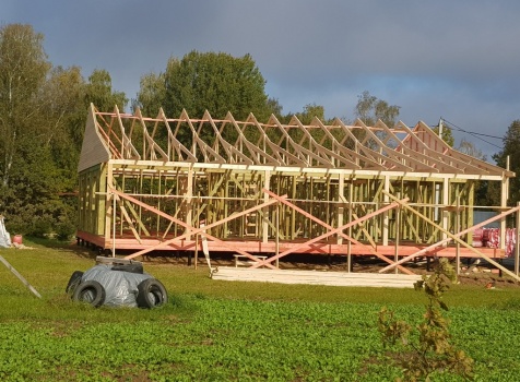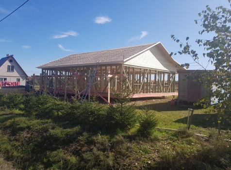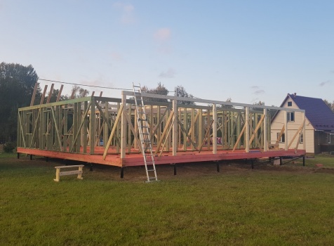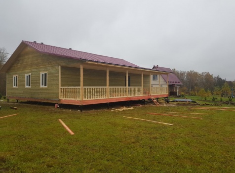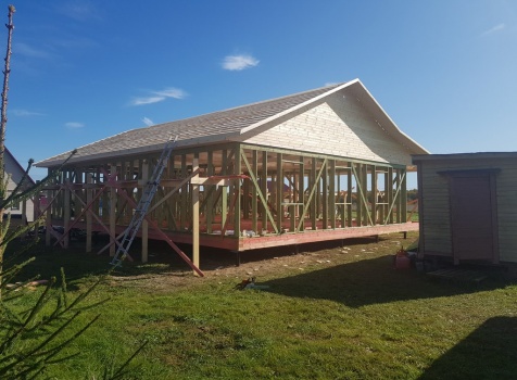 Одноэтажный дом, общими размерами 14.0*12.50 (10.0*14.0 каркасно-щитовой, камерной сушки,под двухскатной крышей и 2.50*14.0 открытая терраса под отдельной односкатной крышей). Построен: Калужская область, Жуковский район, с. Совхоз Чаусово, ул. Пограничная.