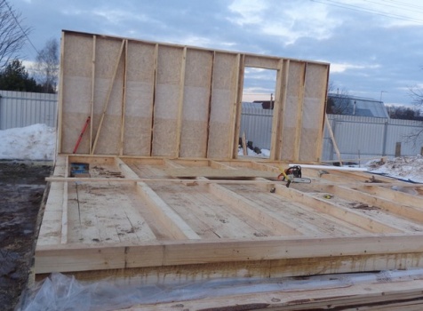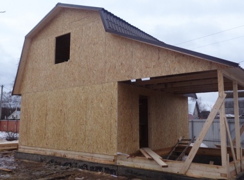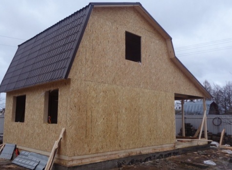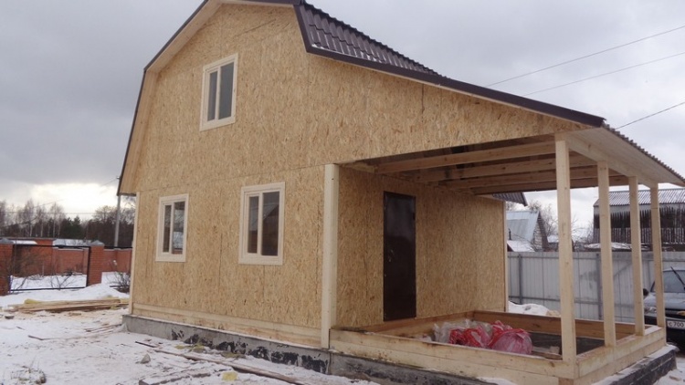 Каркасно-щитовой дом 6х6 м.с утеплением в 150мм (стены) под ломанной крышей и открытой террасой 3.4×4.7 под отдельной крышей. Построен: Тверская область, Конаковский район.