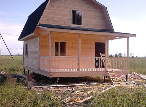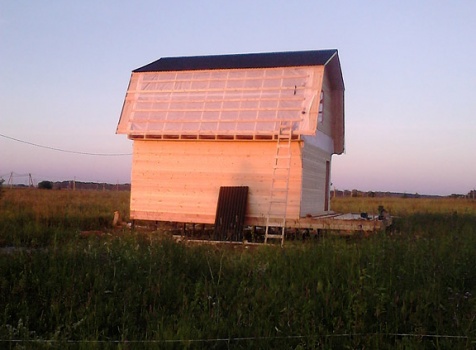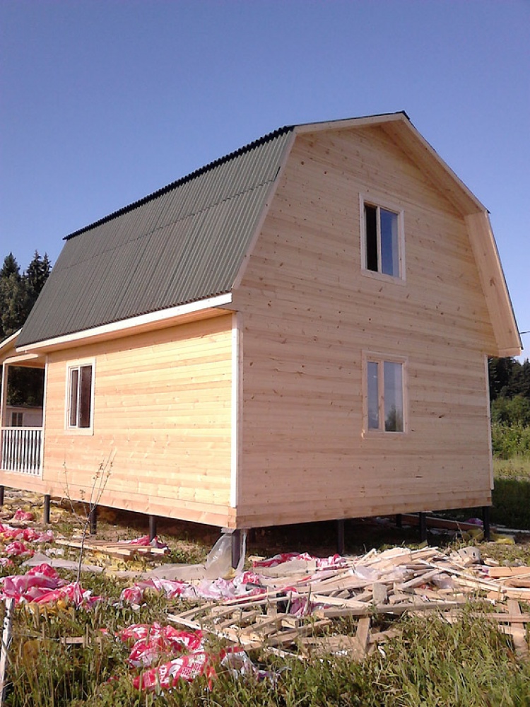Каркасно-щитовой дом 6,0х6,0 и открытая терраса 2,5х6,0 под отдельной крышей. На сайте типовой проект каркасного дома "Матвей". Построен в Ленинградской области, Ломоносовский район, д. Аропаккузи.