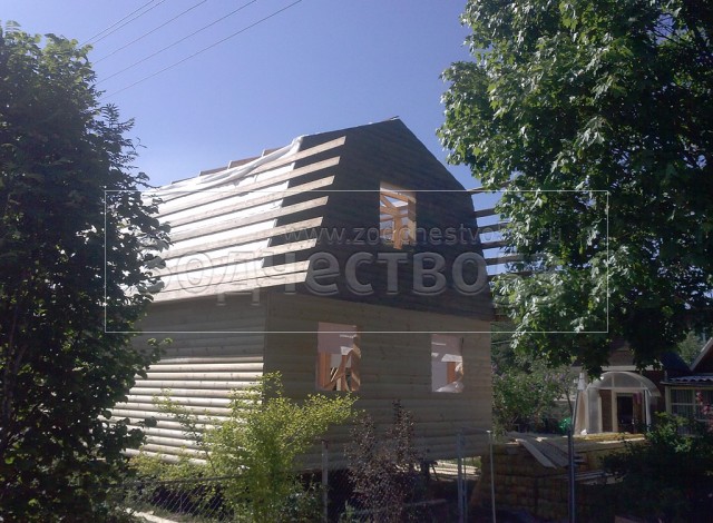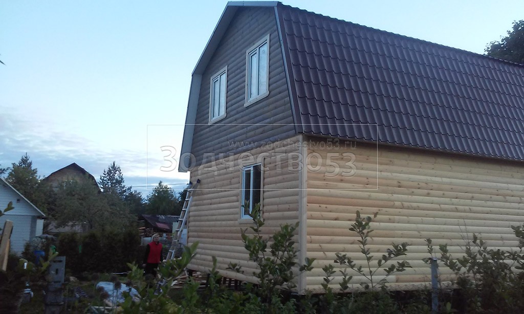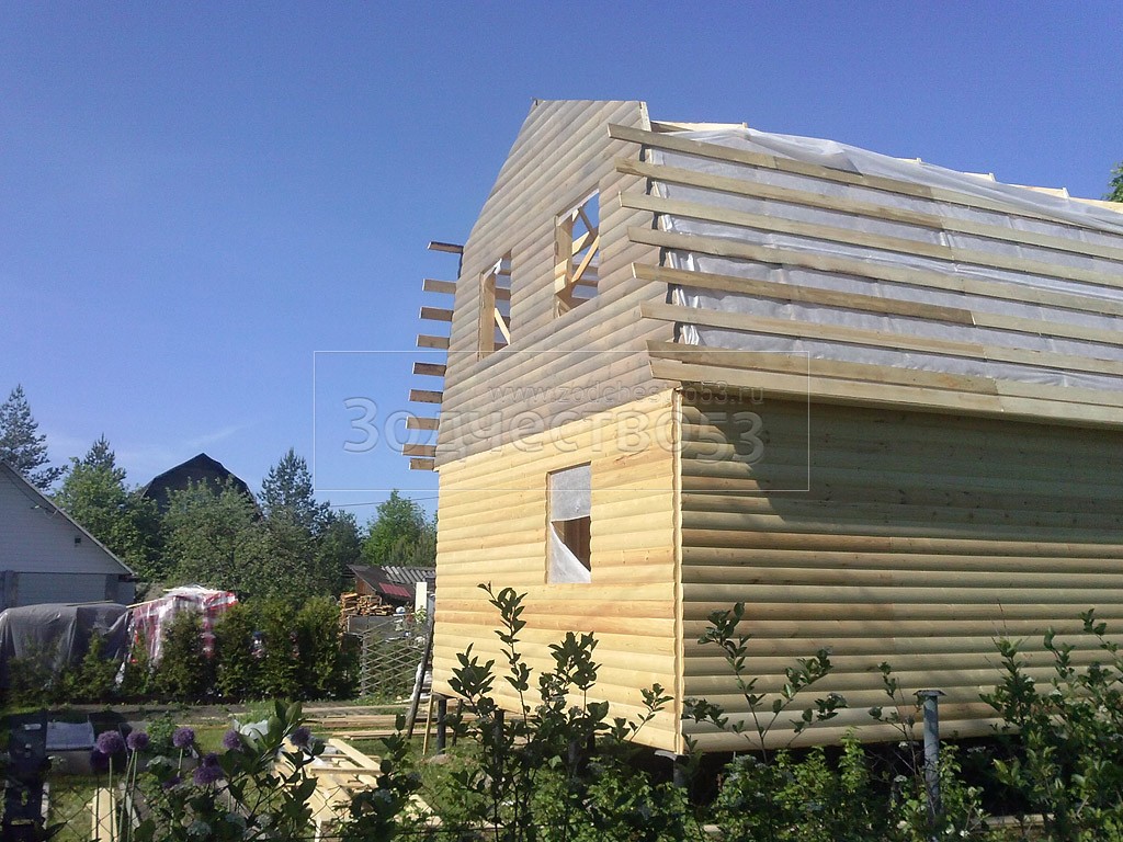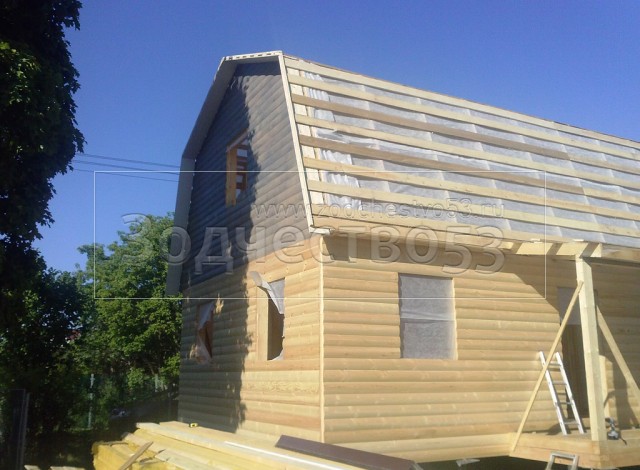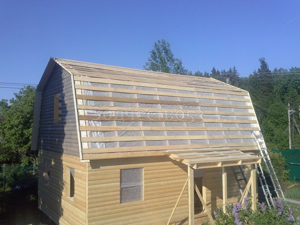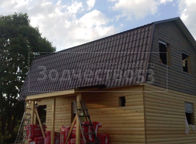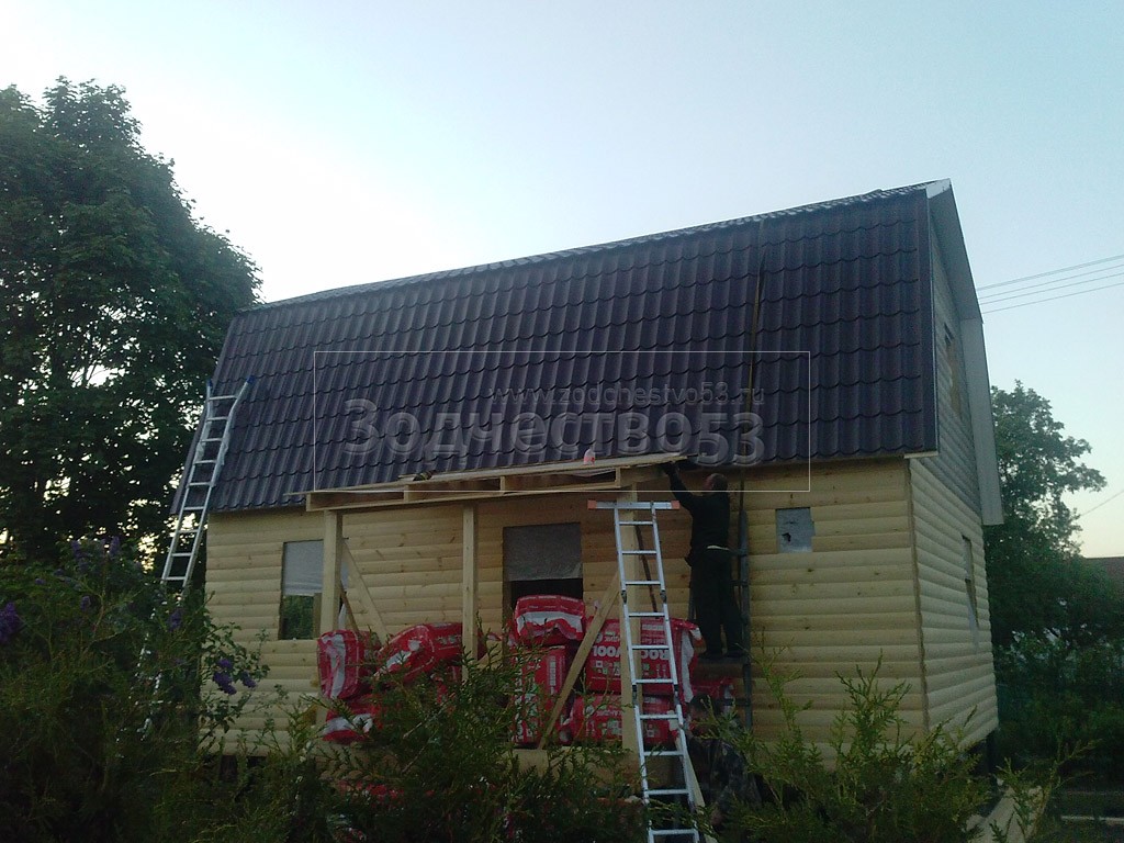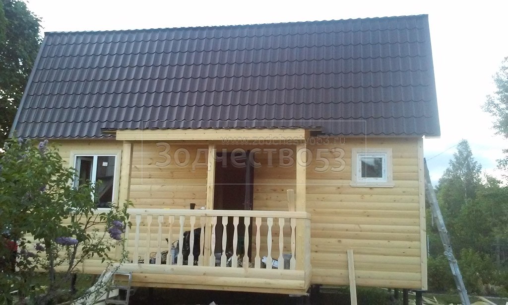 Каркасно-щитовой дом 6,0×8,0 под ломаной крышей, плюс крыльцо 2,0×1,5 под отдельной крышей. Построен в Ленинградской области, Гатчинский р-н, СНТ «Кобрино»