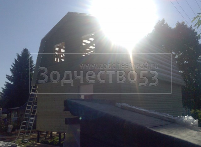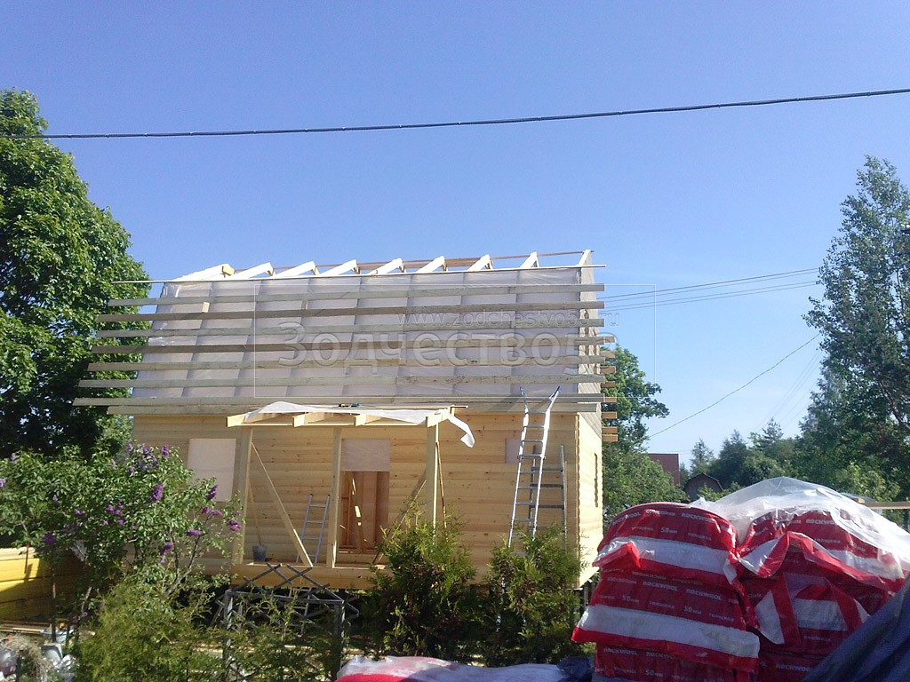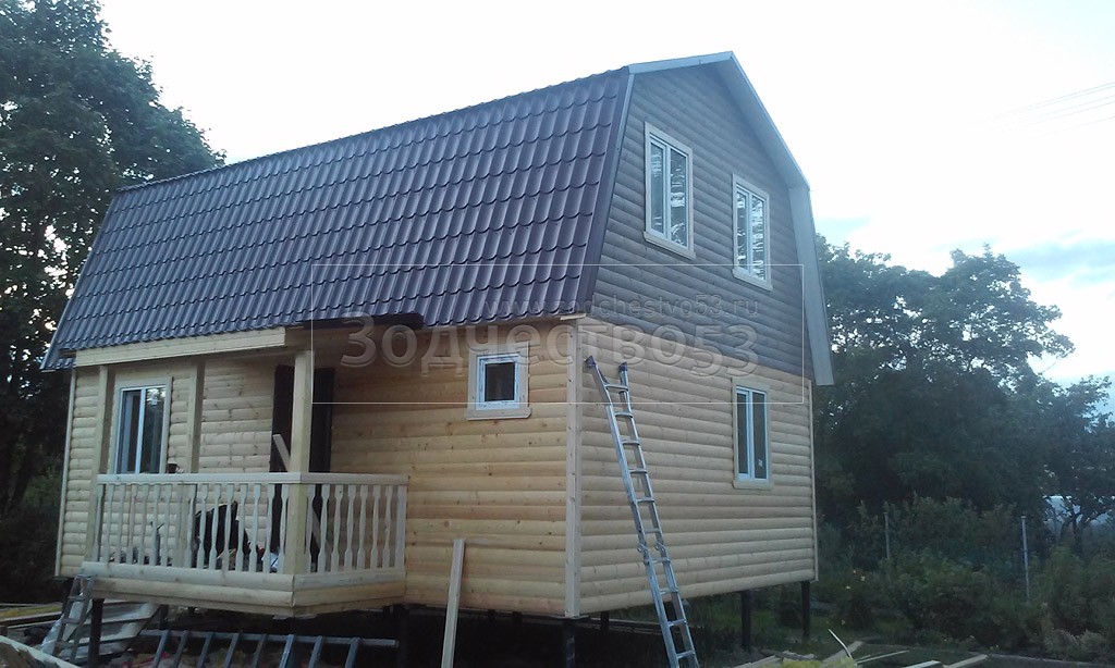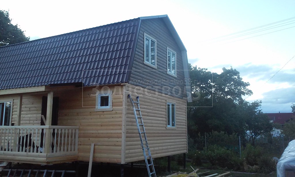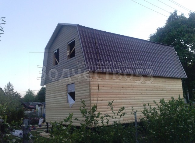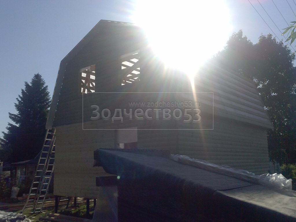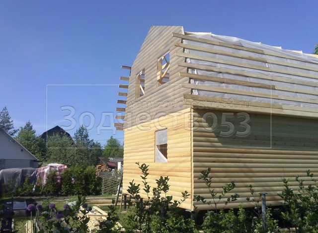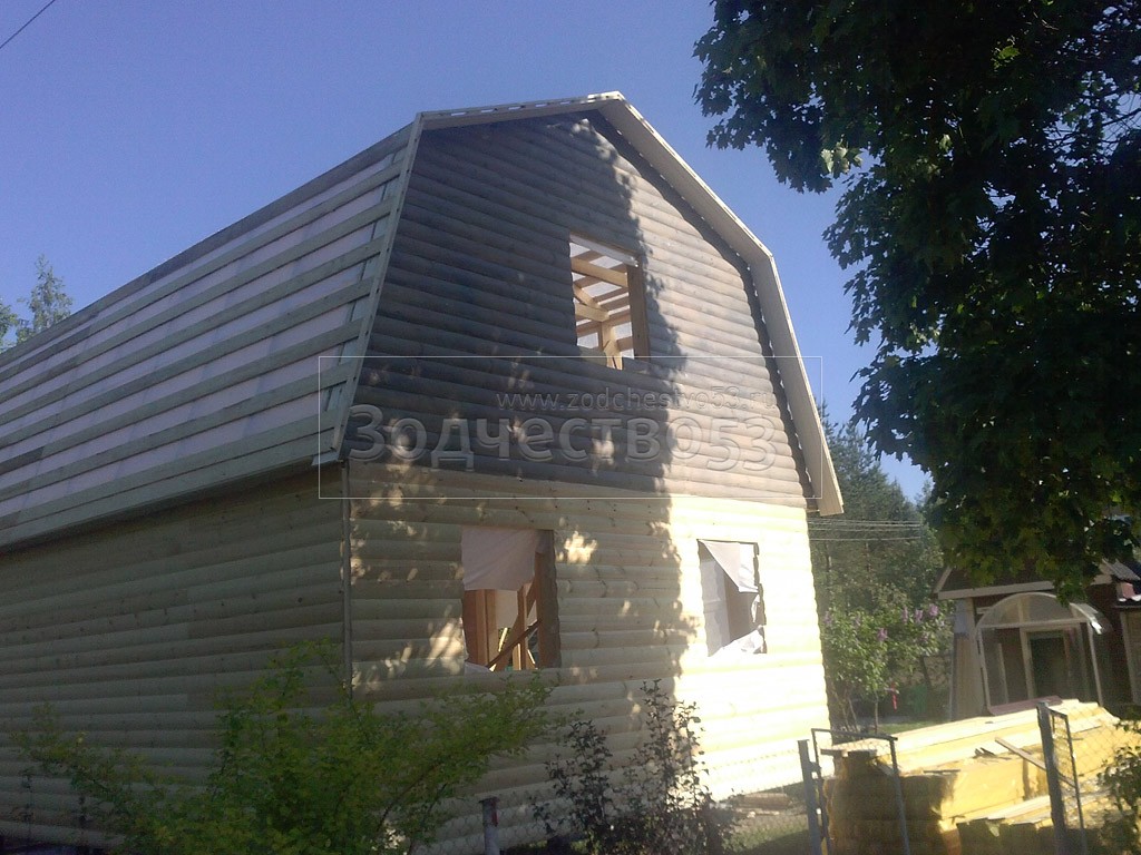 Каркасно-щитовой дом 6,0×8,0 под ломаной крышей, плюс крыльцо 2,0×1,5 под отдельной крышей. Построен в Ленинградской области, Гатчинский р-н, СНТ «Кобрино»
