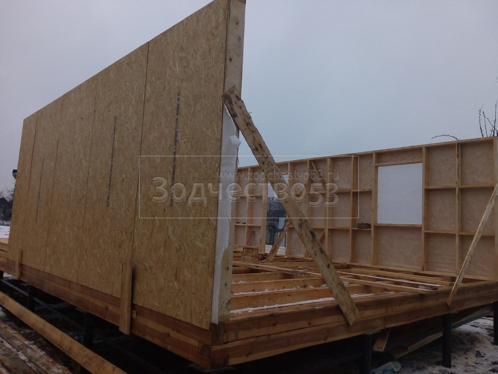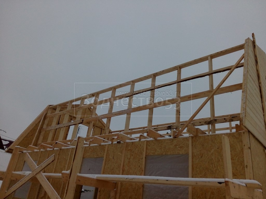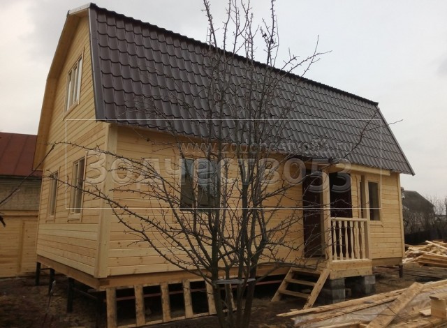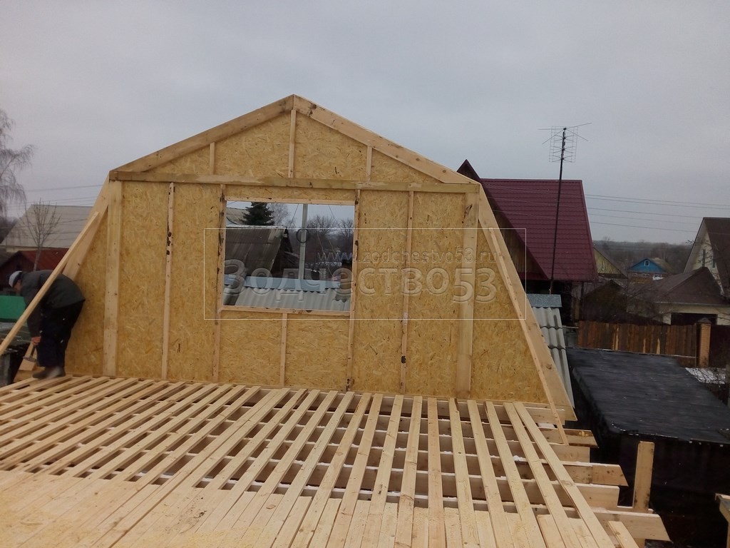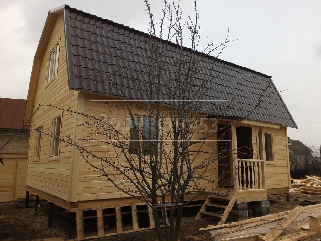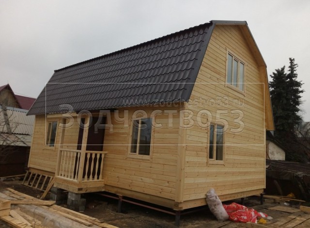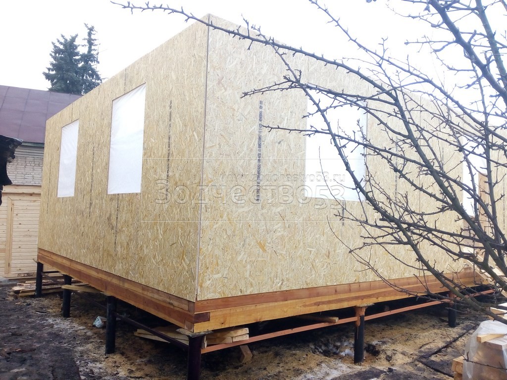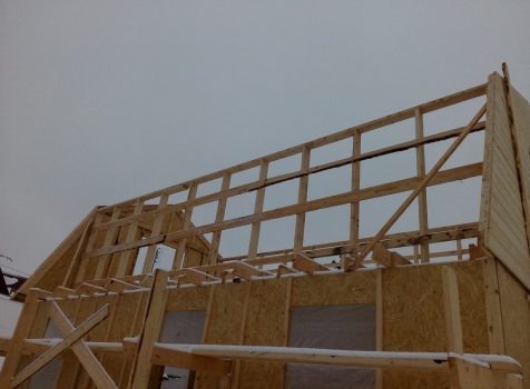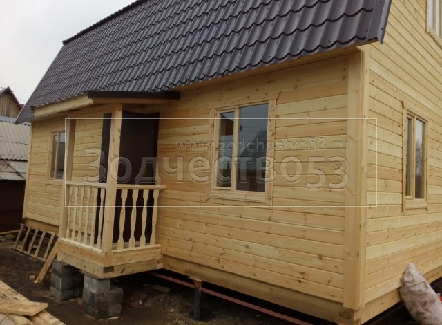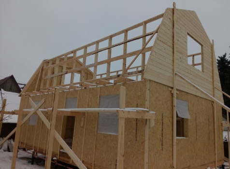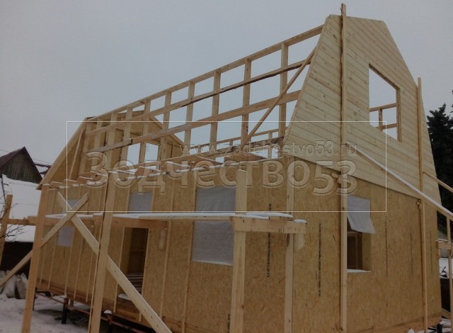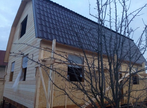 Каркасно-щитовой дом 6,0х9,0 под ломаной крышей и крыльцо 1,0х1,5 под отдельной крышей. Построен в Тамбовской области, г. Мичуринск.