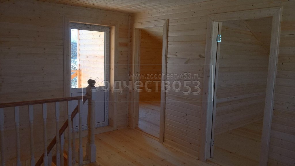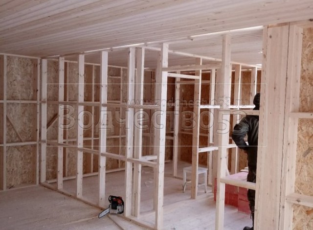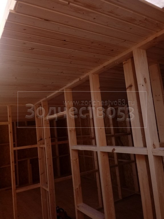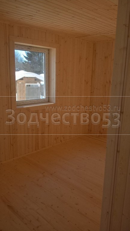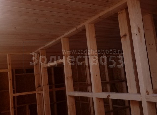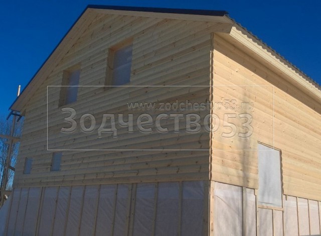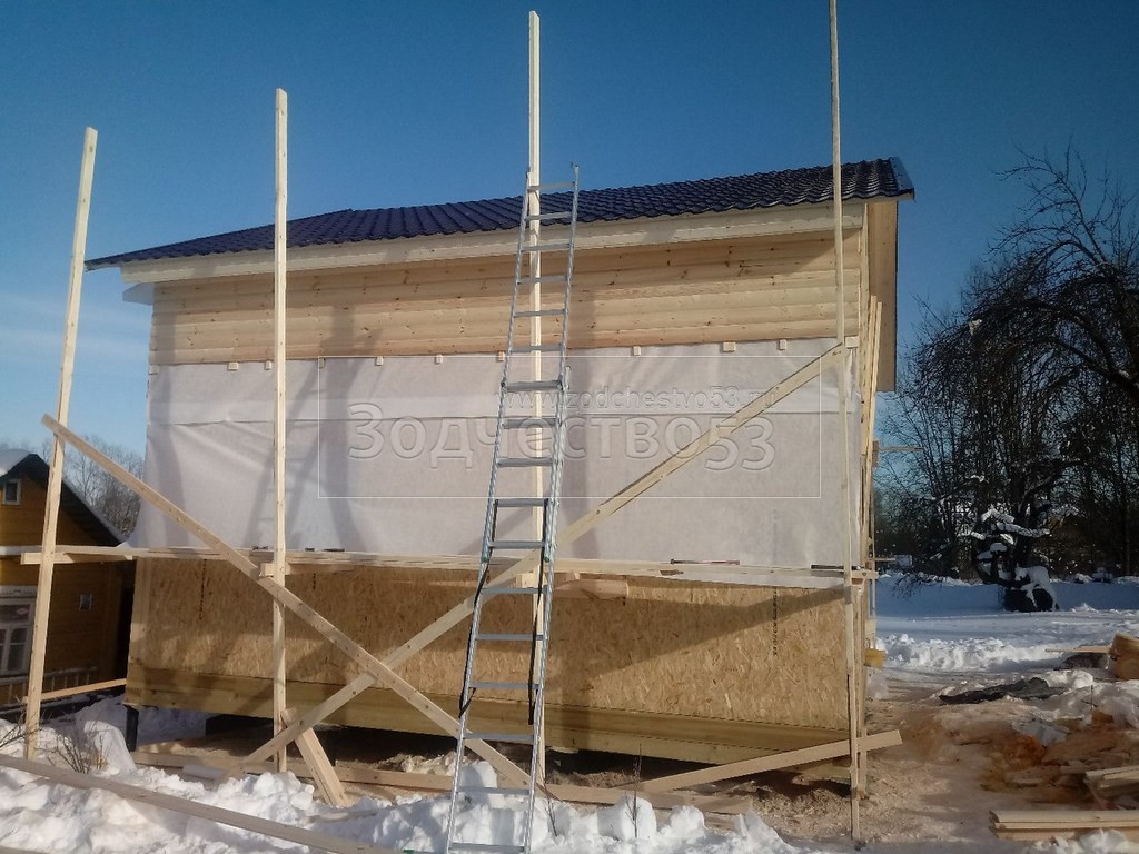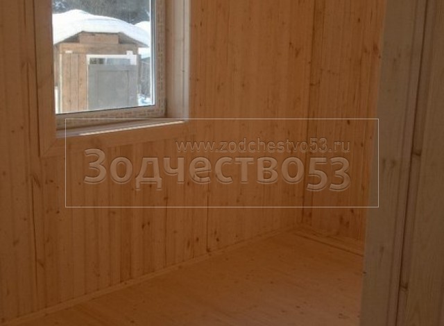 - стены каркасно-щитовые 40×200 обшиты внутри по каркасу фанерой OSB, а снаружи — блок-хаусом