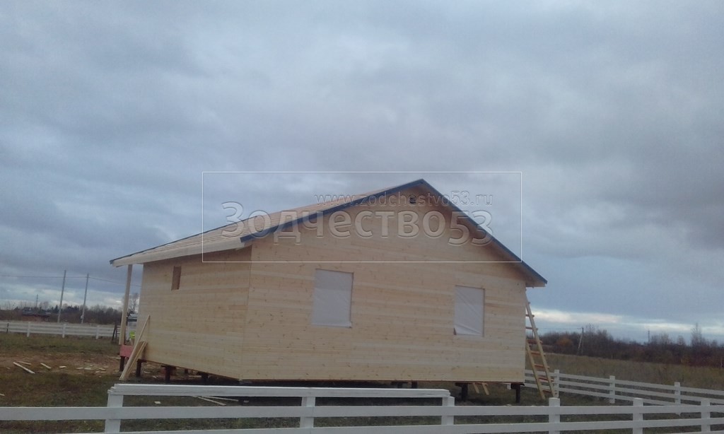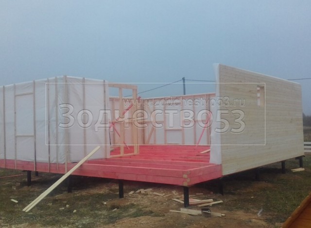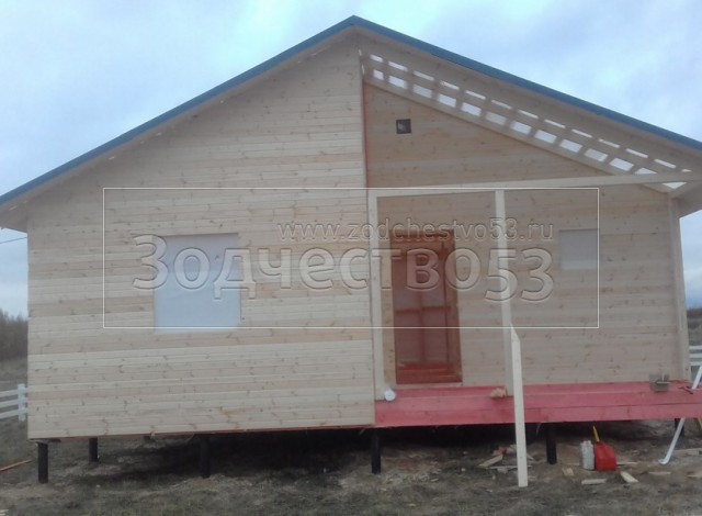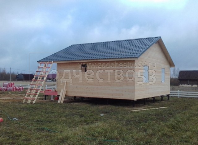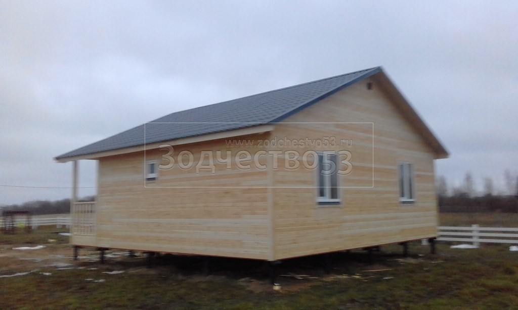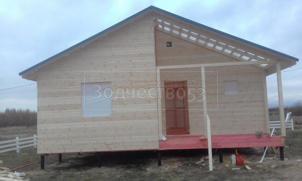 Одноэтажный каркасно-щитовой дом ,общими размерами 8.0*8.0 с утеплением стен в 100мм под двухскатной крышей. Объект построен: Новгородская обл.,с/п Ракомское, д. Васильевское.