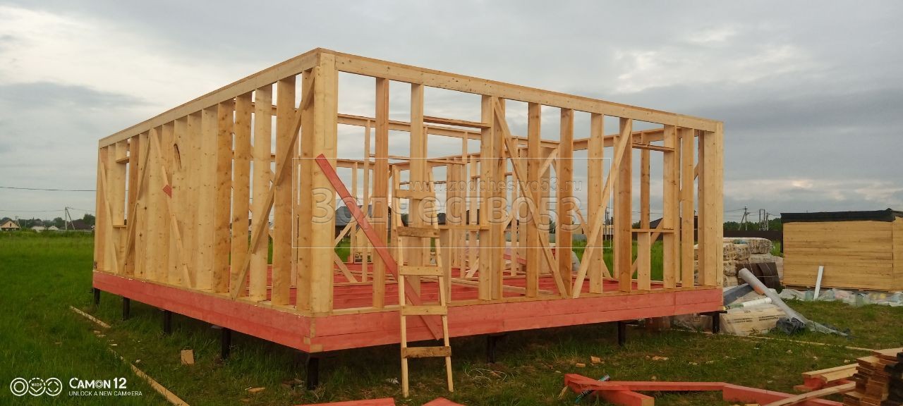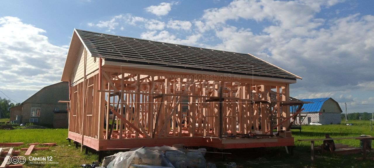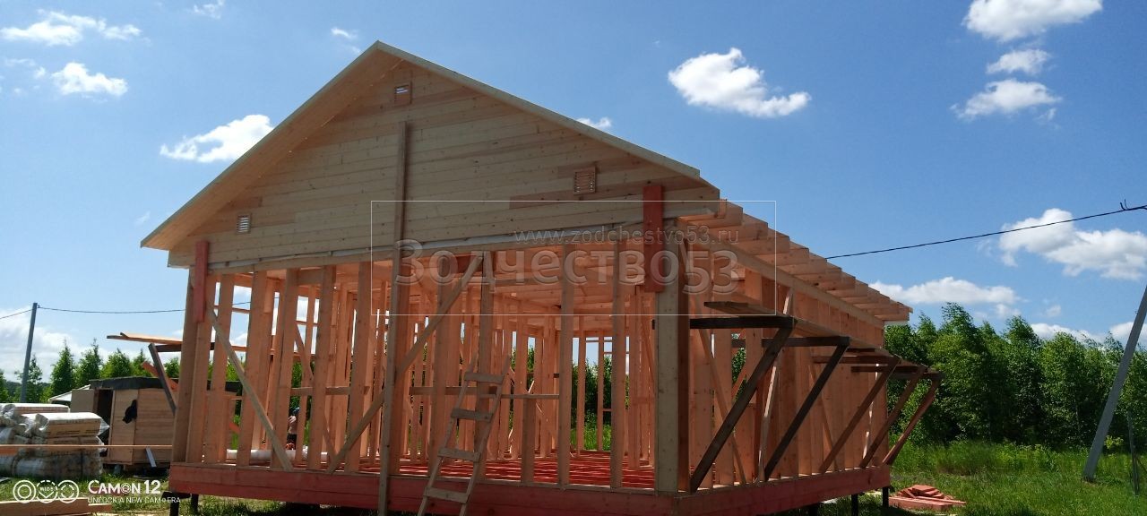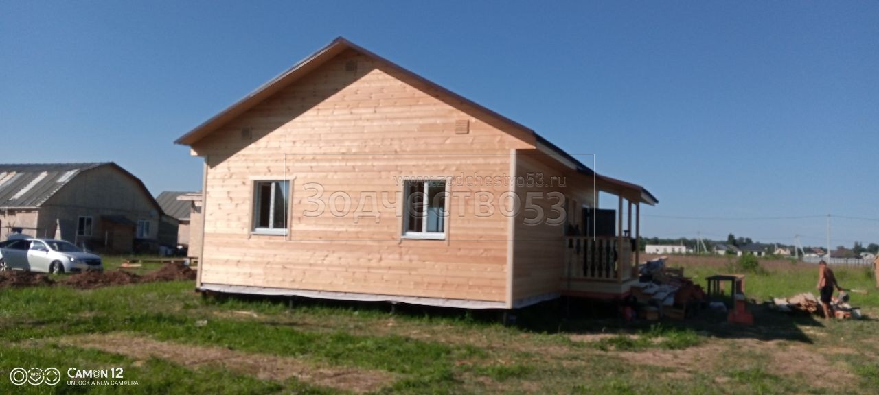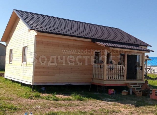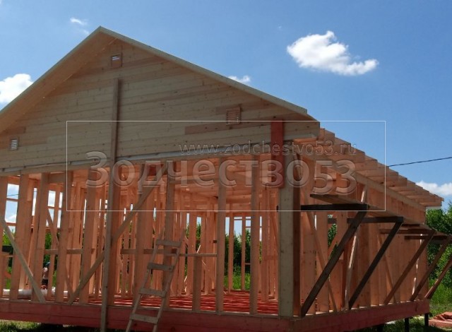 Постройка одноэтажного дома с открытой террасой, общими размерами 10.0×9.0 ( 10.0×7.50 дом ) каркасно-щитовой (Камерной сушки) с утеплением в 200 мм (стены) под двухскатной крышей и ( 4.0×1.50 открытая терраса ) под отдельной односкатной крышей: https://zodchestvo53.ru/dzhamilya