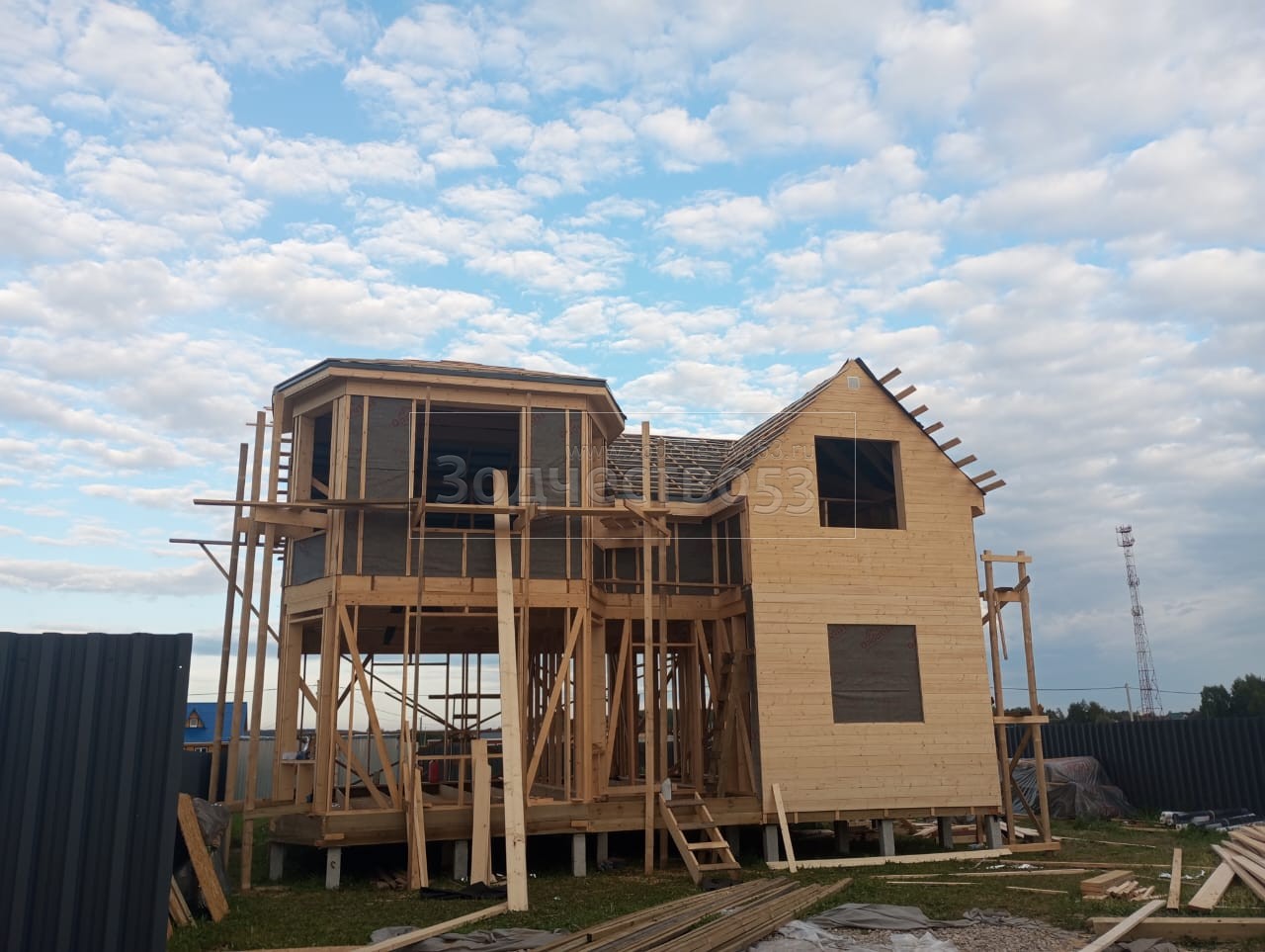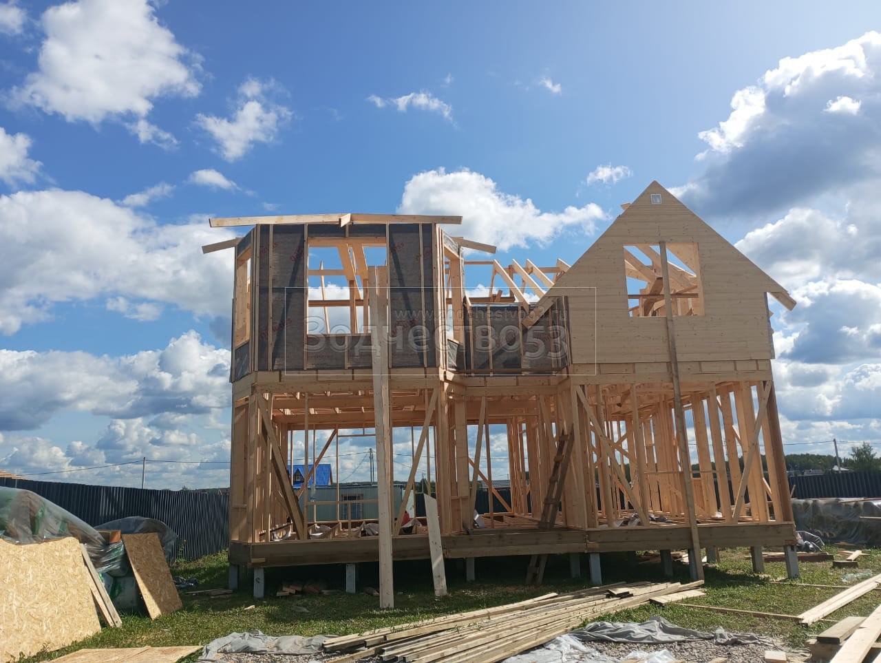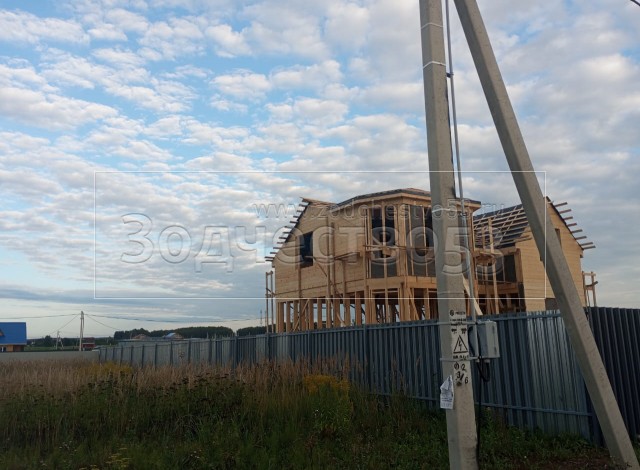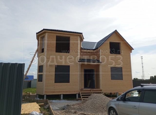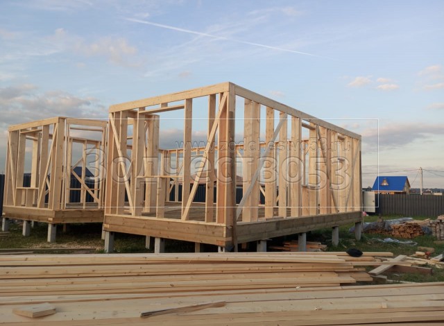 Постройка двухэтажного дома с эркером и открытой террасой, общими размерами 11.50х8.50 ( 9.50х7.50 и 2.0х1.0 дом с эркером ) каркасно-щитовой (Камерной сушки) с утеплением в 200 мм (стены) под односкатной крышей и (2.0х5.0 открытая терраса) под отдельной односкатной крышей
