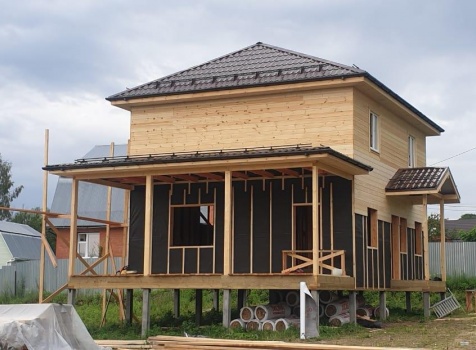 Постройка двухэтажного дома с открытой террасой и открытым крыльцом общими размерами 11.50х8.70 ( 8.50х7.50 дом ) каркасно-щитовой Камерной сушки с утеплением в 200 мм (стены) под четырёхскатной крышей (тип конвертом ) и ( 3.0х7.50 открытая терраса ) под отдельной односкатной крышей ( с вальмами лучами ) плюс ( 2.50х1.20 открытое крыльцо ) под отдельной двухскатной крышей