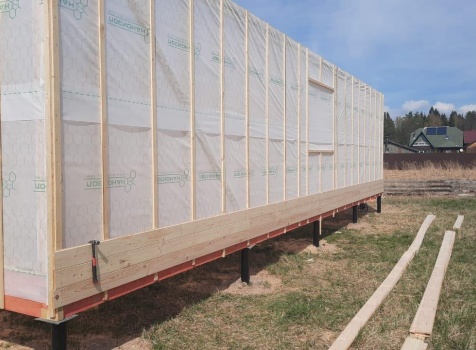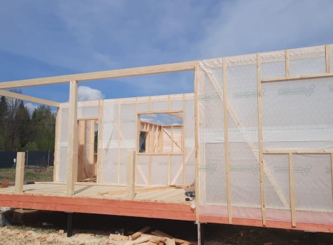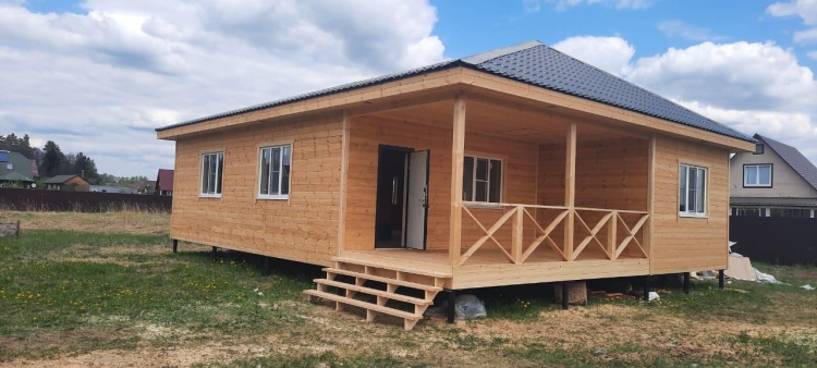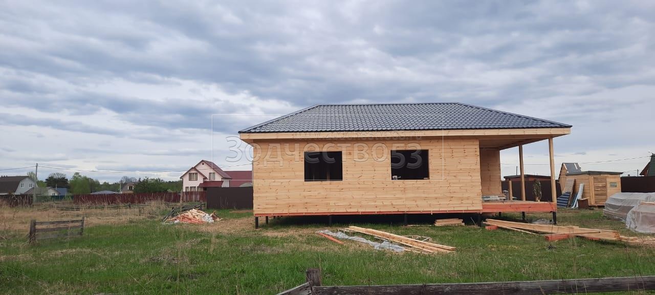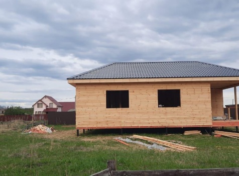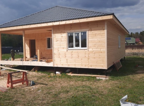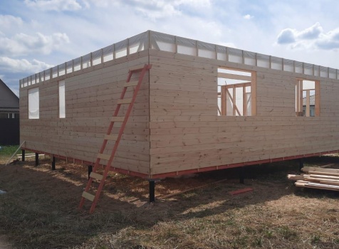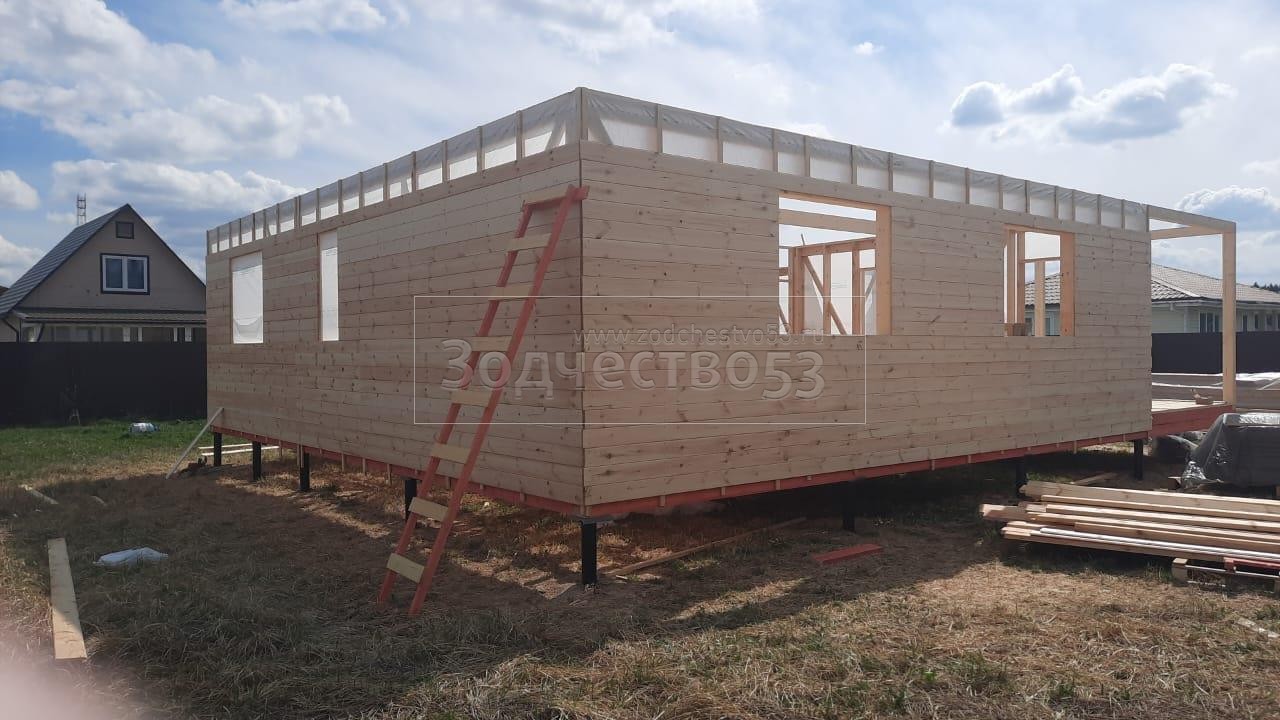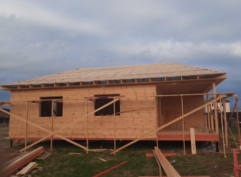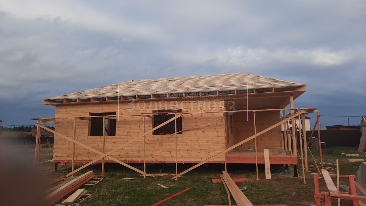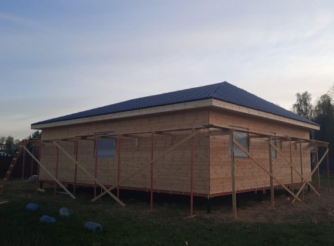 Постройка одноэтажного дома с открытой террасой общими размерами ( 12.0×10.0 каркасно-щитовой Камерной сушки с утеплением в 150 мм (стены) под четырёхскатной крышей (тип конвертом)