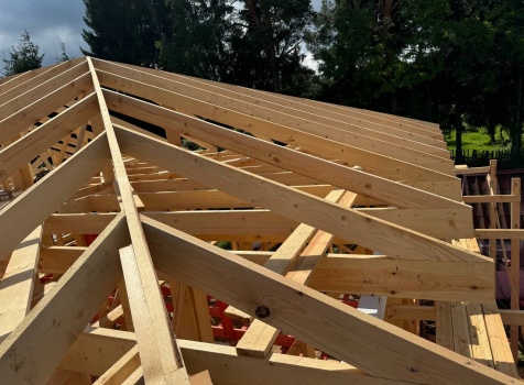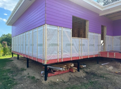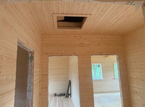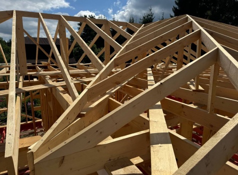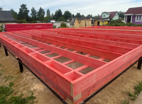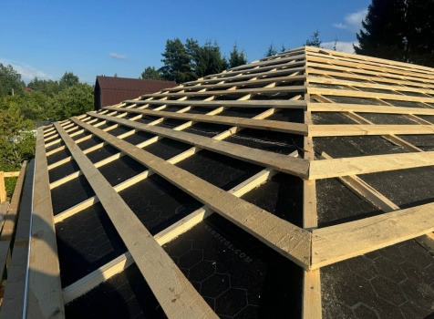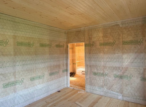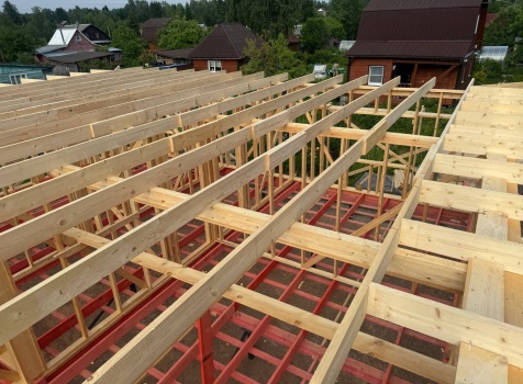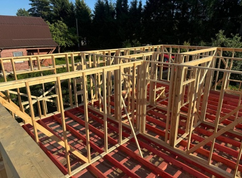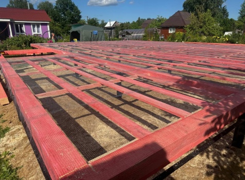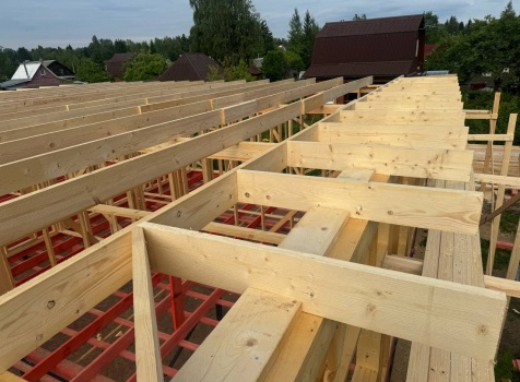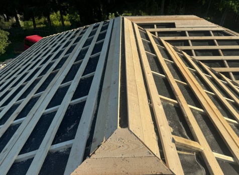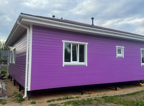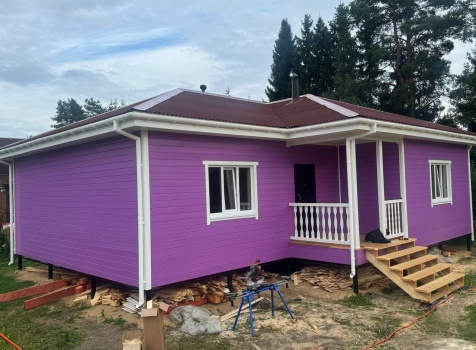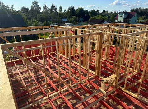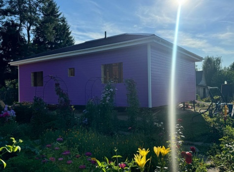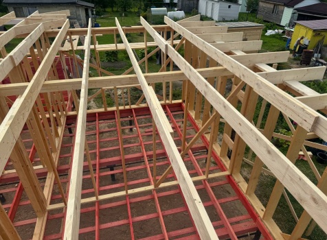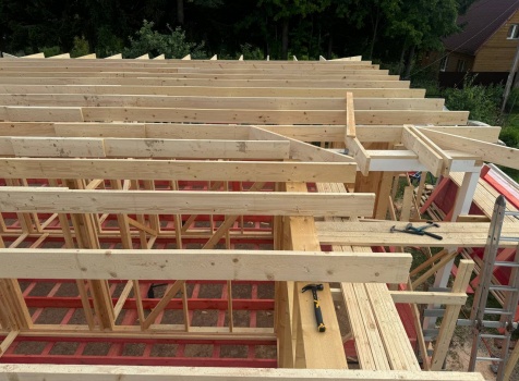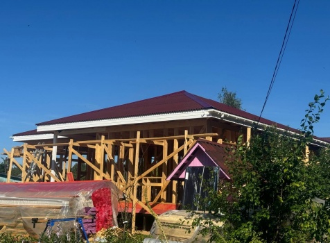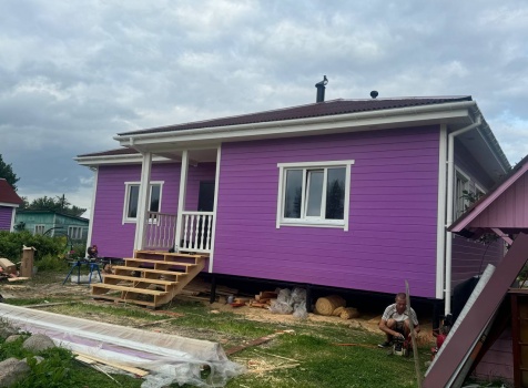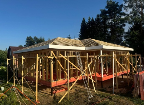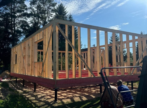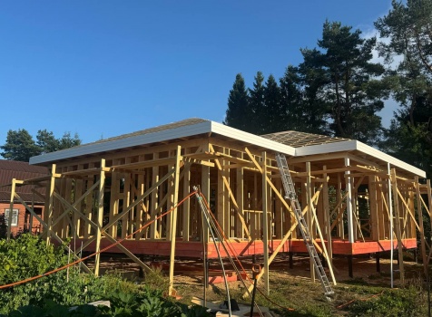 Постройка одноэтажного дома с открытой террасой общими размерами 12.0×10.0 ( 12.0×8.0 и 5.0×2.0 дом ) каркасно-щитовой Камерной сушки с утеплением в 200 мм (стены) и ( 2.50×2.0 открытая терраса ) под общей четырёхскатной крышей буквой Г ( тип конвертом ) по проекту: https://zodchestvo53.ru/greta