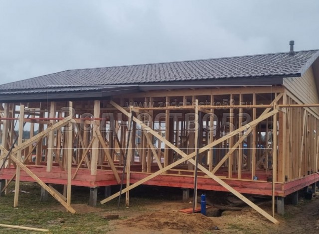 Постройка одноэтажного дома с открытой террасой и крыльцом, общими размерами 12.0×13.50 ( 12.0×10.0 дом ) каркасный (Камерной сушки) с утеплением в 200 мм (стены) под двухскатной крышей плюс ( 4.0×2.0 открытая терраса ) под отдельной односкатной крышей и ( 2.0×1.50 открытое крыльцо ) под отдельной односкатной крышей .