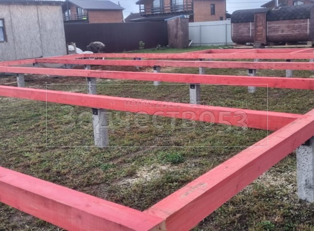 - Обвязка: из обрезного бруса 150×150 первый ряд , 50×200 второй ряд ( на ребро )