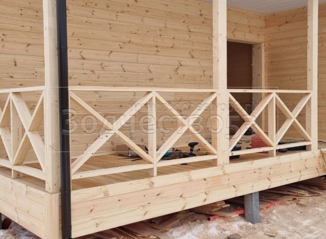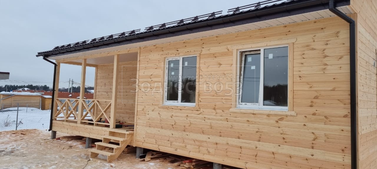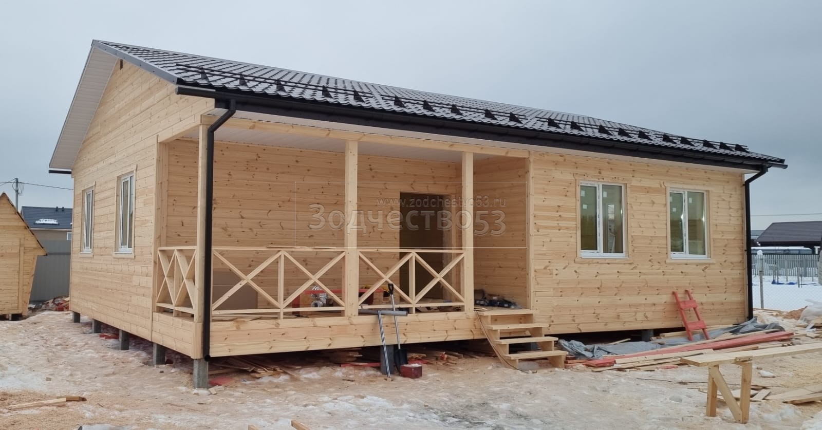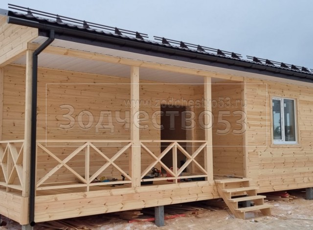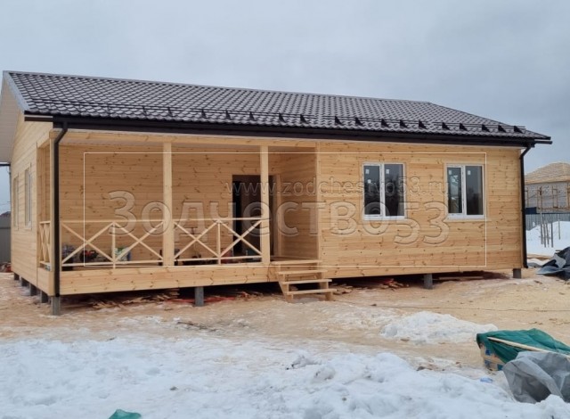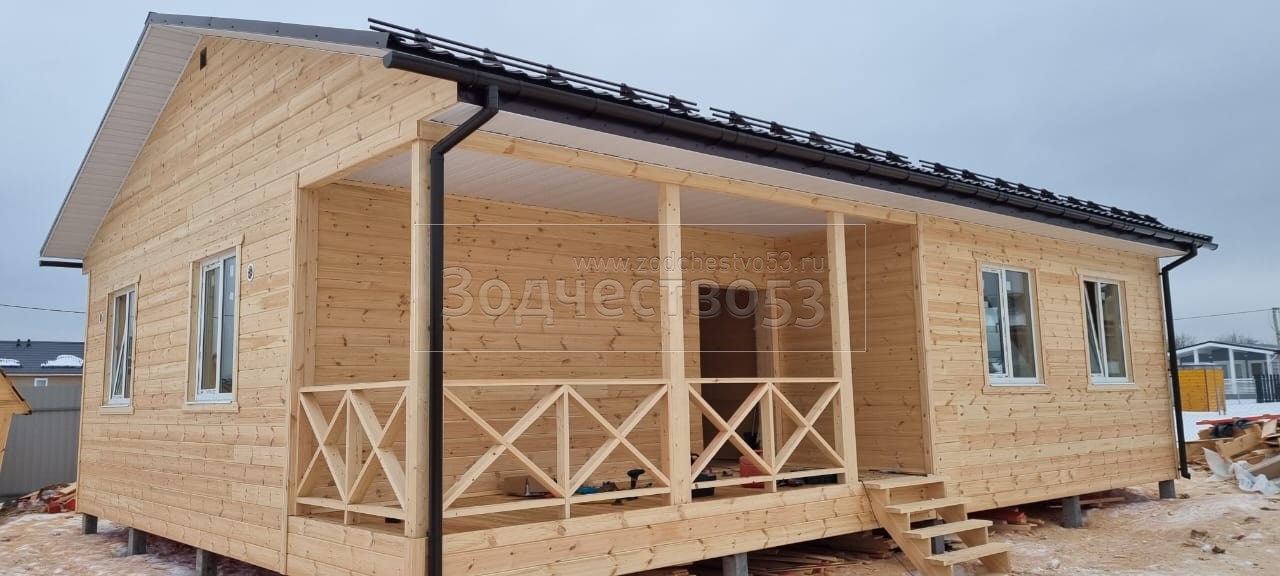 Постройка одноэтажного дома с открытой террасой общими размерами 12.0х9.0, каркасный, камерной сушки с утеплением в 200мм (стены) под общей двухскатной крышей.