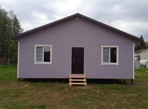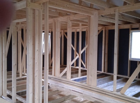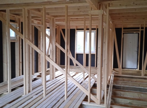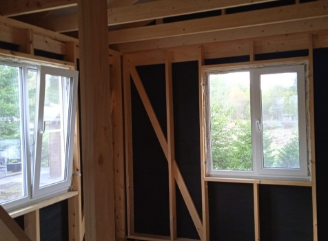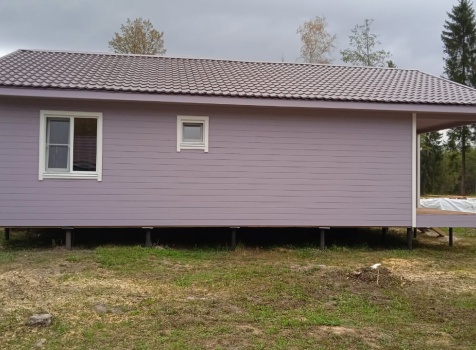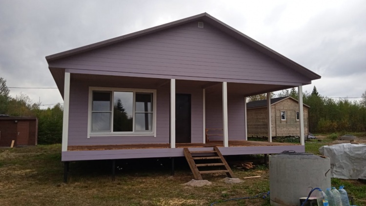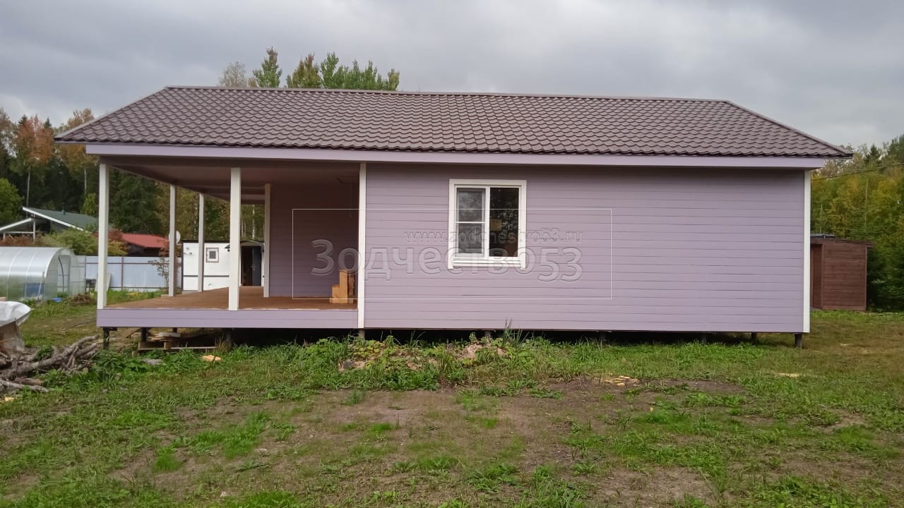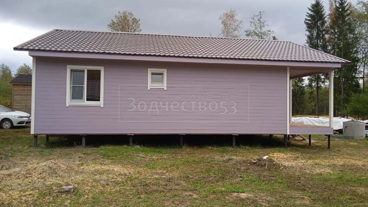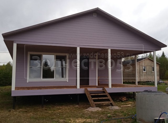Постройка одноэтажного дома с Г образной открытой террасой с частичной отделкой дома общими размерами 12.0×9.0 каркасный Камерной сушки без утепления под общей двухскатной крышей .