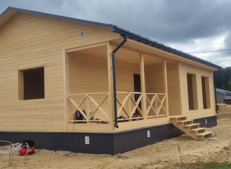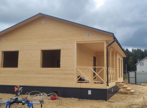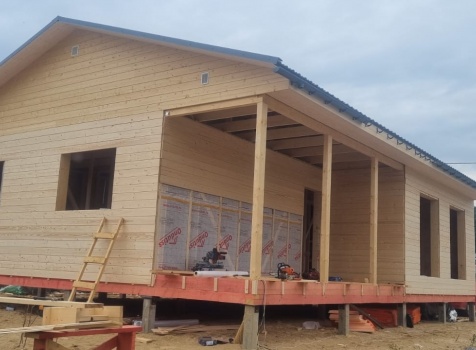 Постройка одноэтажного дома с открытой террасой общими размерами 12.0×9.0 каркасный (Камерной сушки) с утеплением в 200мм (стены) под общей двухскатной крышей