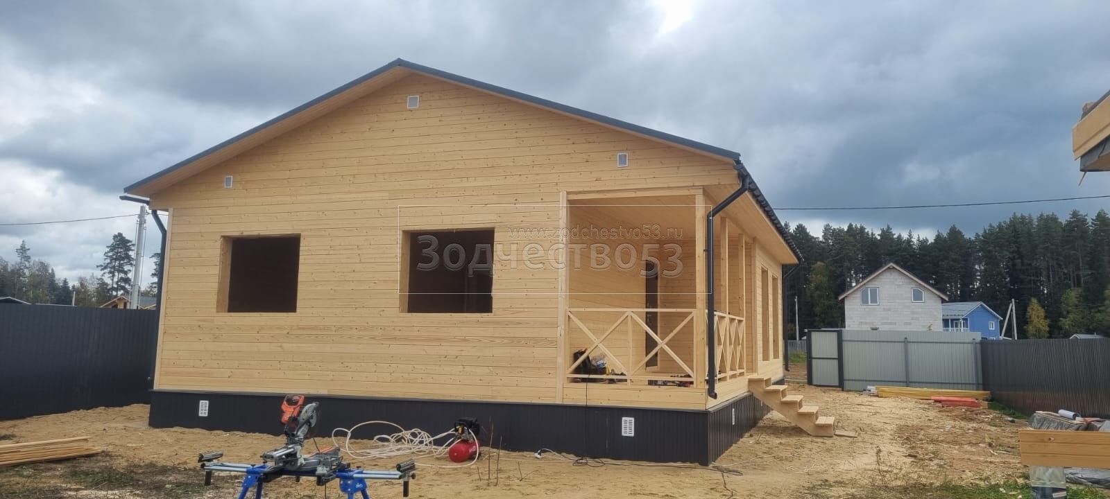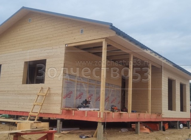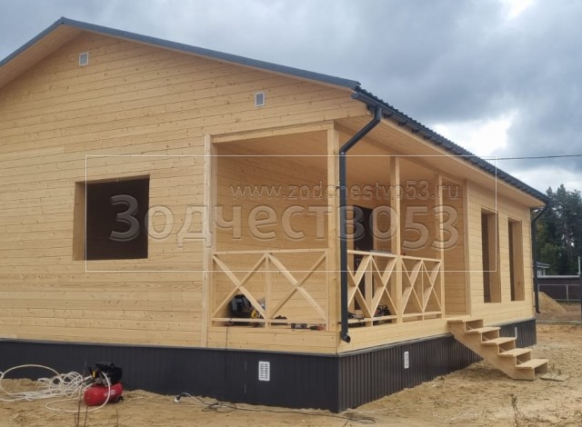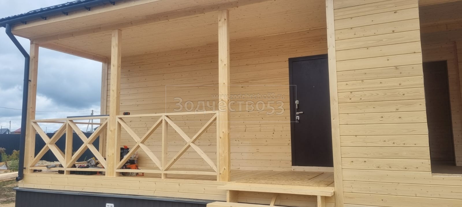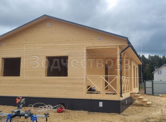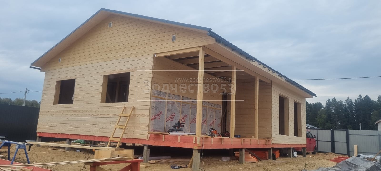 Постройка одноэтажного дома с открытой террасой общими размерами 12.0×9.0 каркасный (Камерной сушки) с утеплением в 200мм (стены) под общей двухскатной крышей