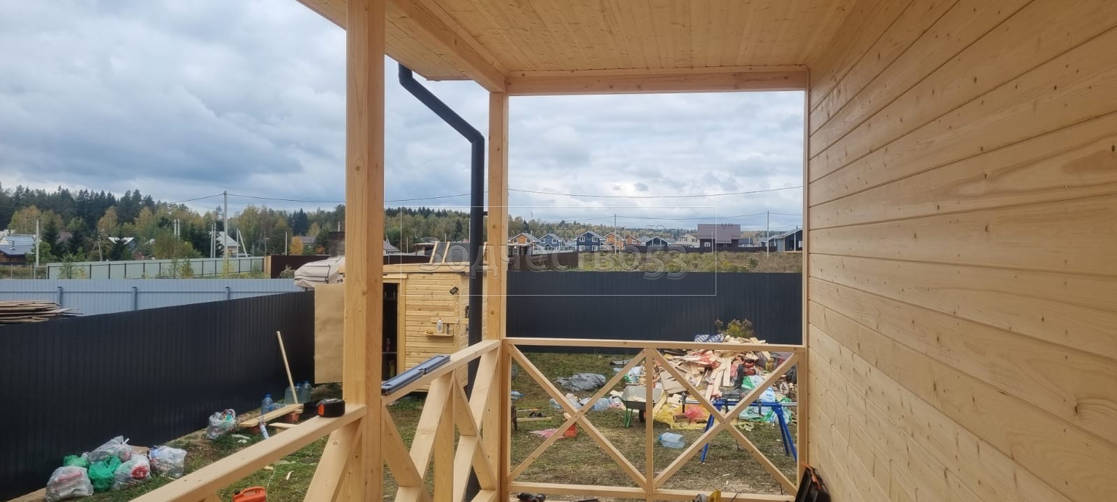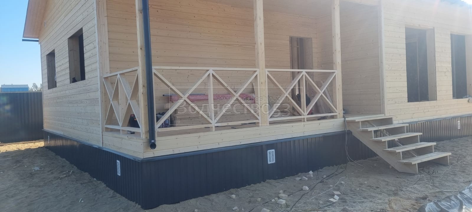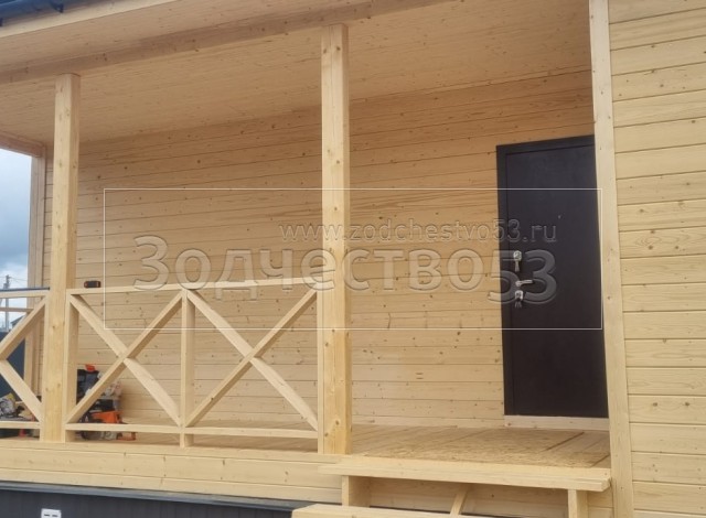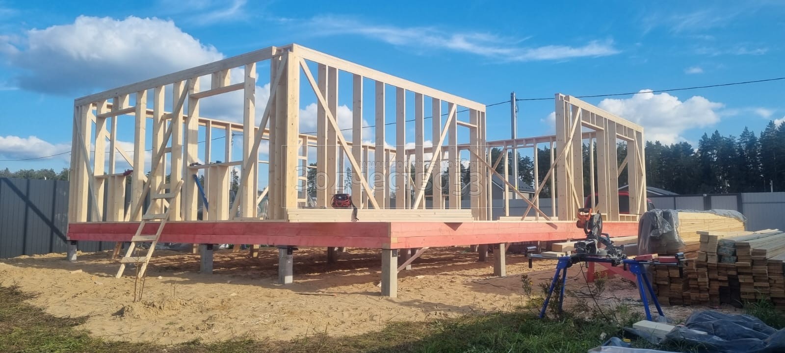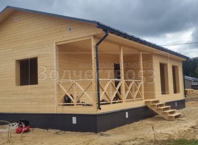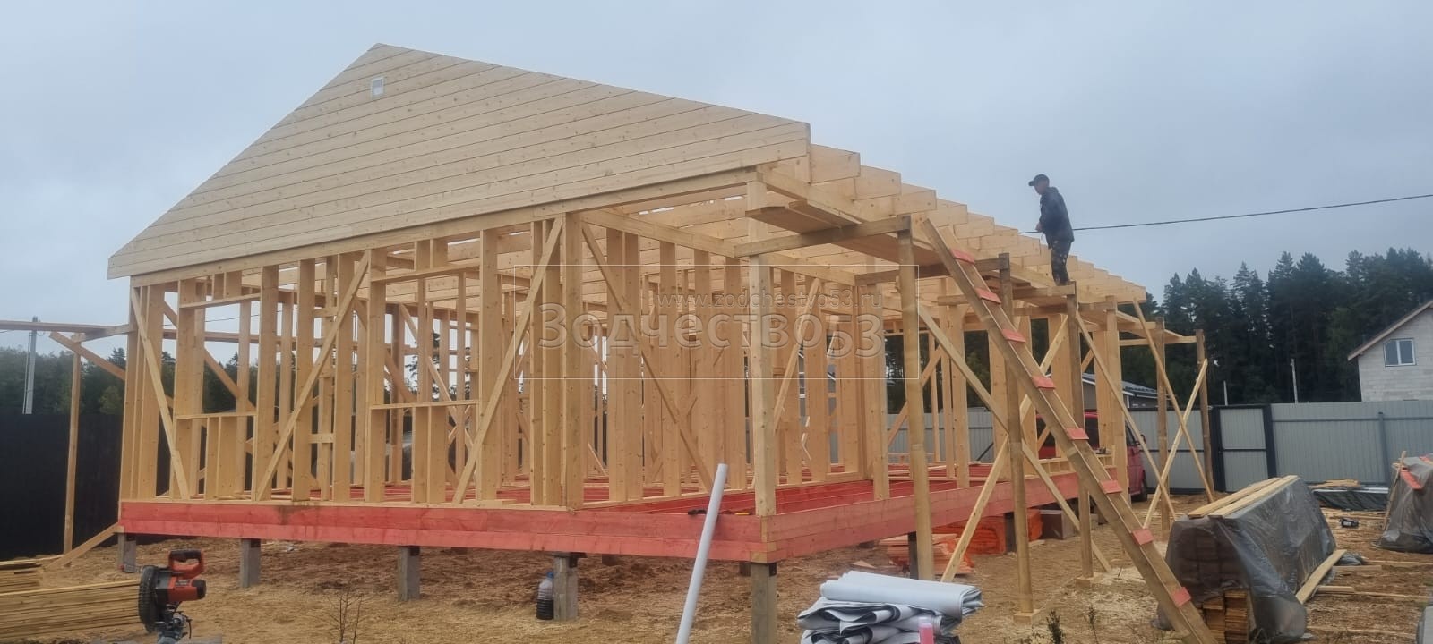Постройка одноэтажного дома с открытой террасой общими размерами 12.0×9.0 каркасный (Камерной сушки) с утеплением в 200мм (стены) под общей двухскатной крышей