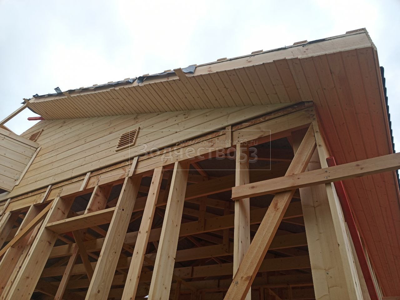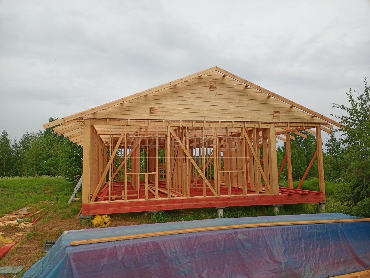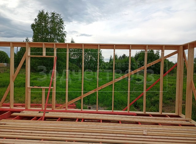 - Фронтоны по 9.0 метрам : каркасно-щитовые, обшиваются Влагостойкой фанерой ОСБ и Имитацией бруса класса