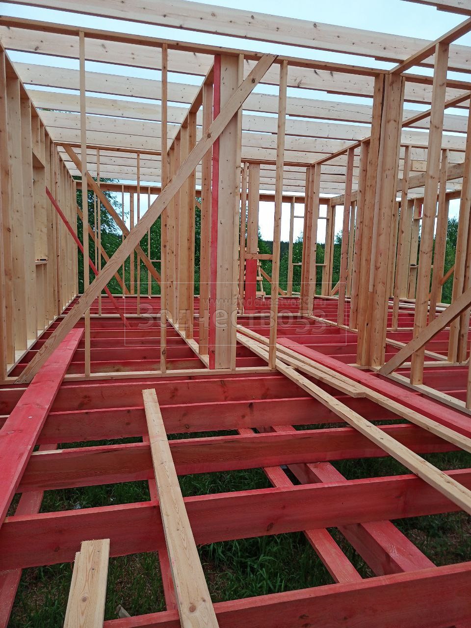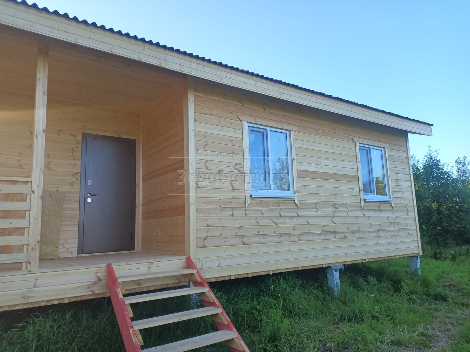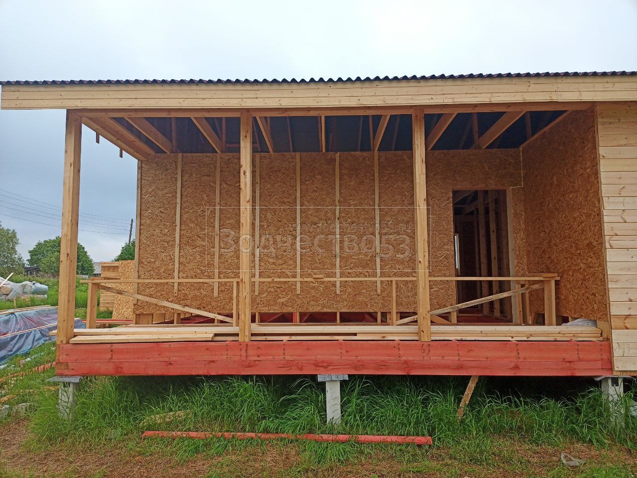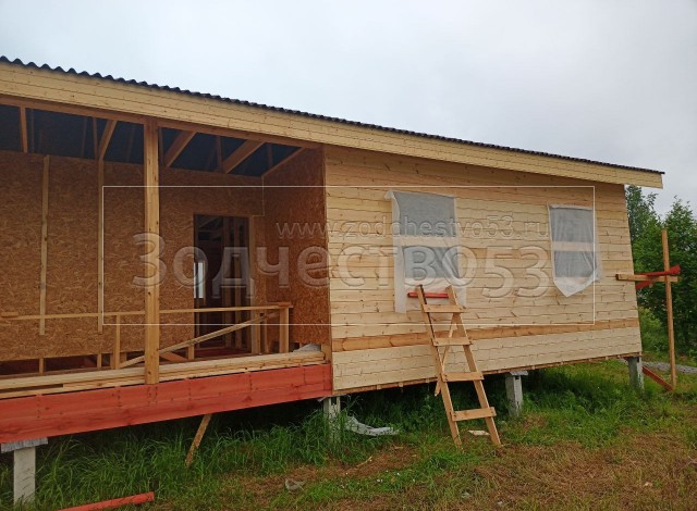 Постройка одноэтажного дома с открытой террасой общими размерами 12.0×9.0 каркасный (Камерной сушки) с утеплением в 200 мм ( стены ) под общей двухскатной крышей : https://zodchestvo53.ru/dzhenna