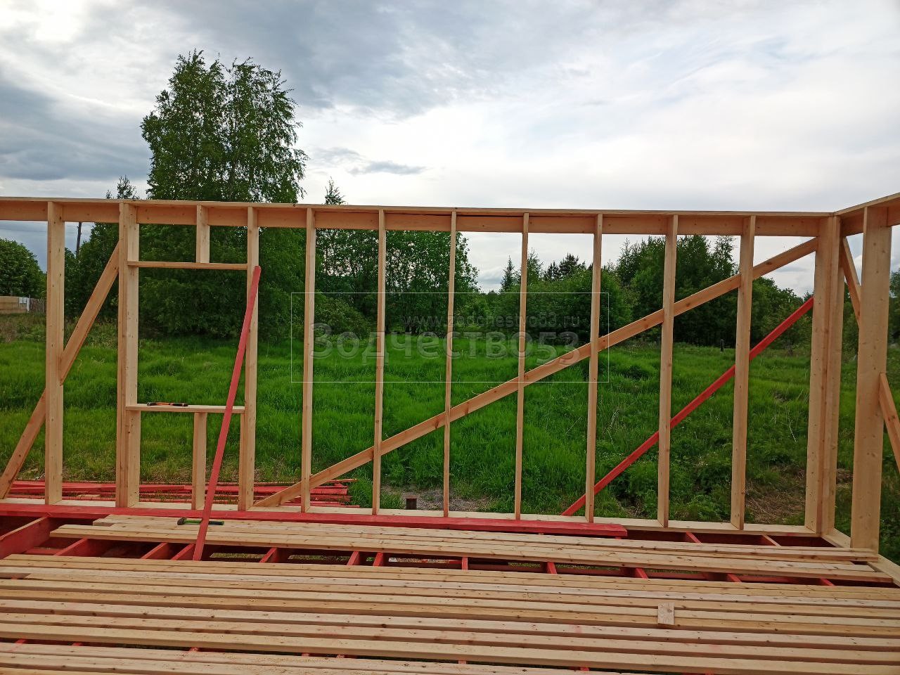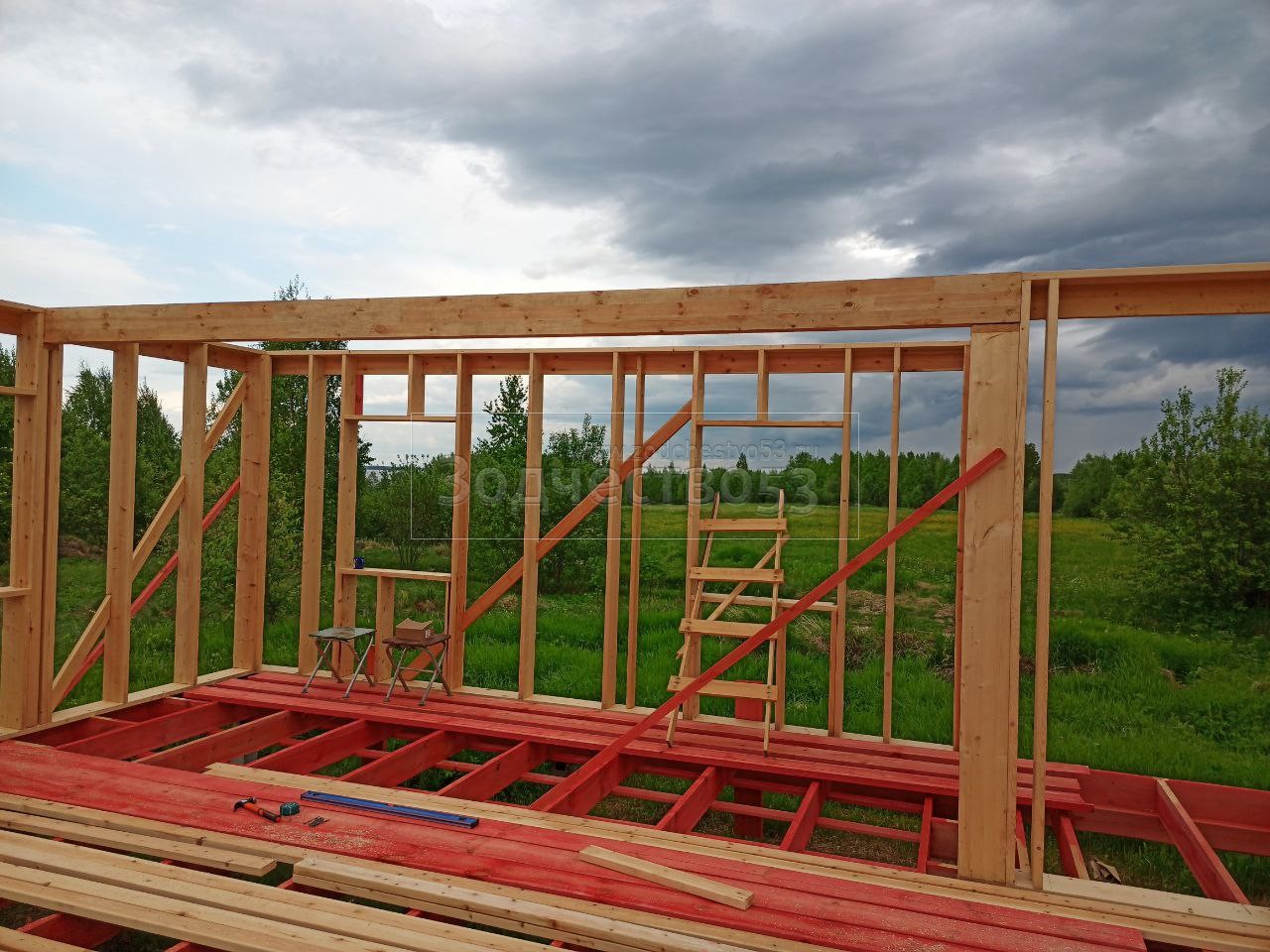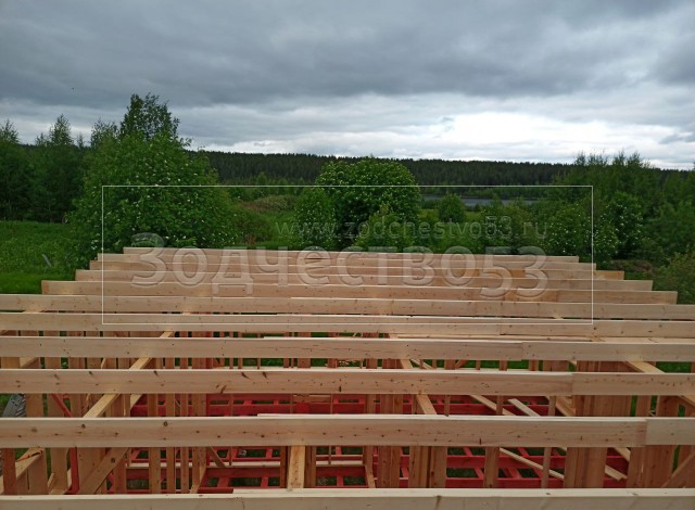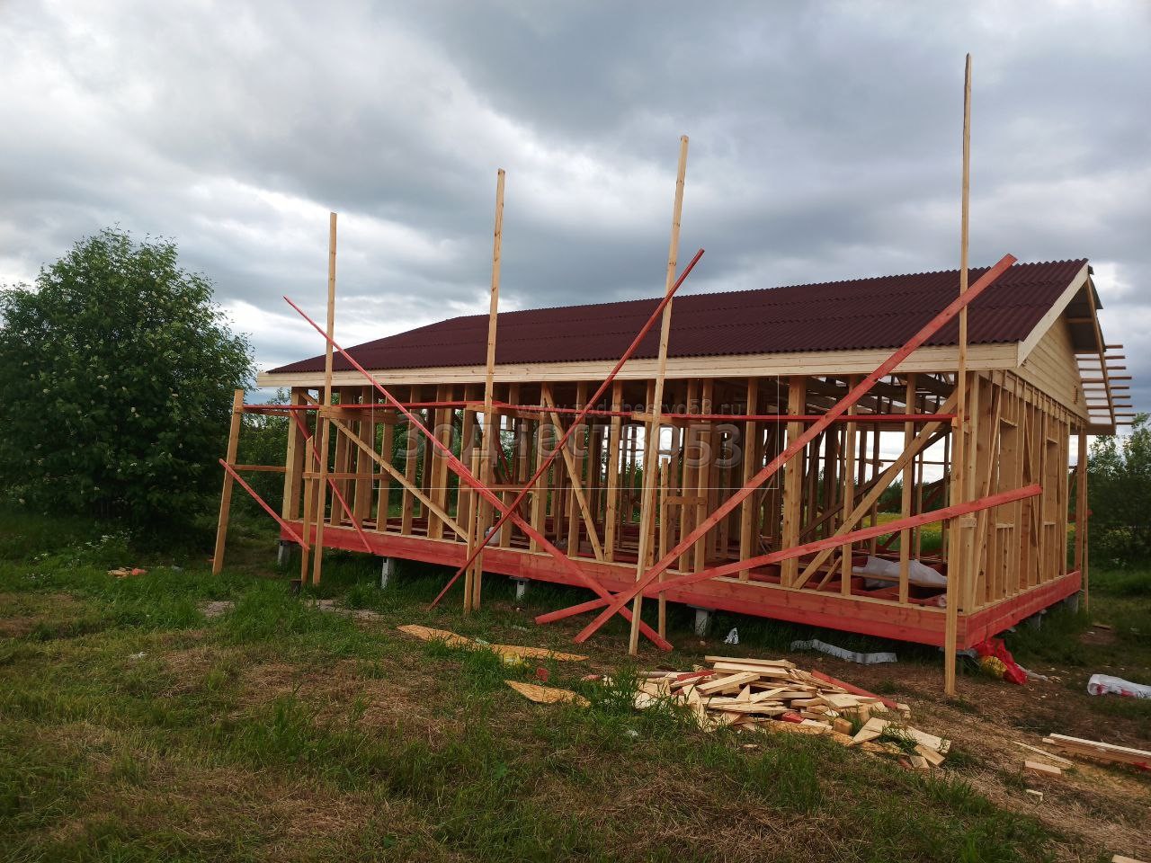 Постройка одноэтажного дома с открытой террасой общими размерами 12.0×9.0 каркасный (Камерной сушки) с утеплением в 200 мм ( стены ) под общей двухскатной крышей : https://zodchestvo53.ru/dzhenna