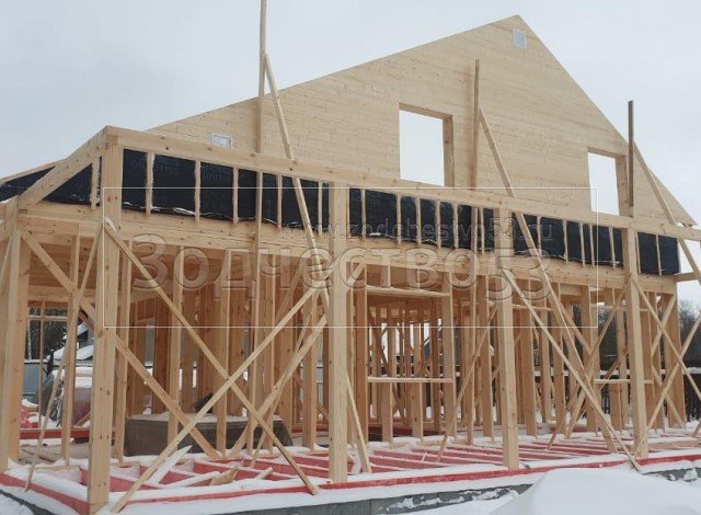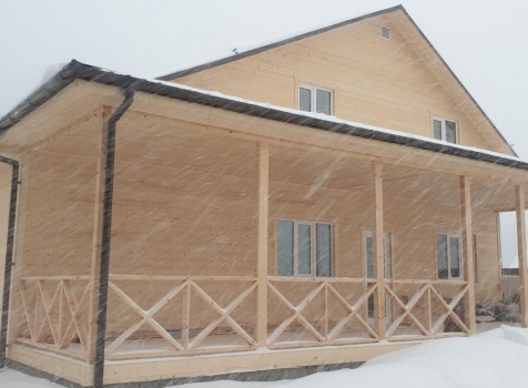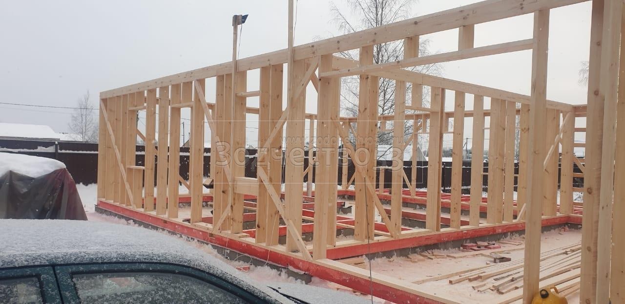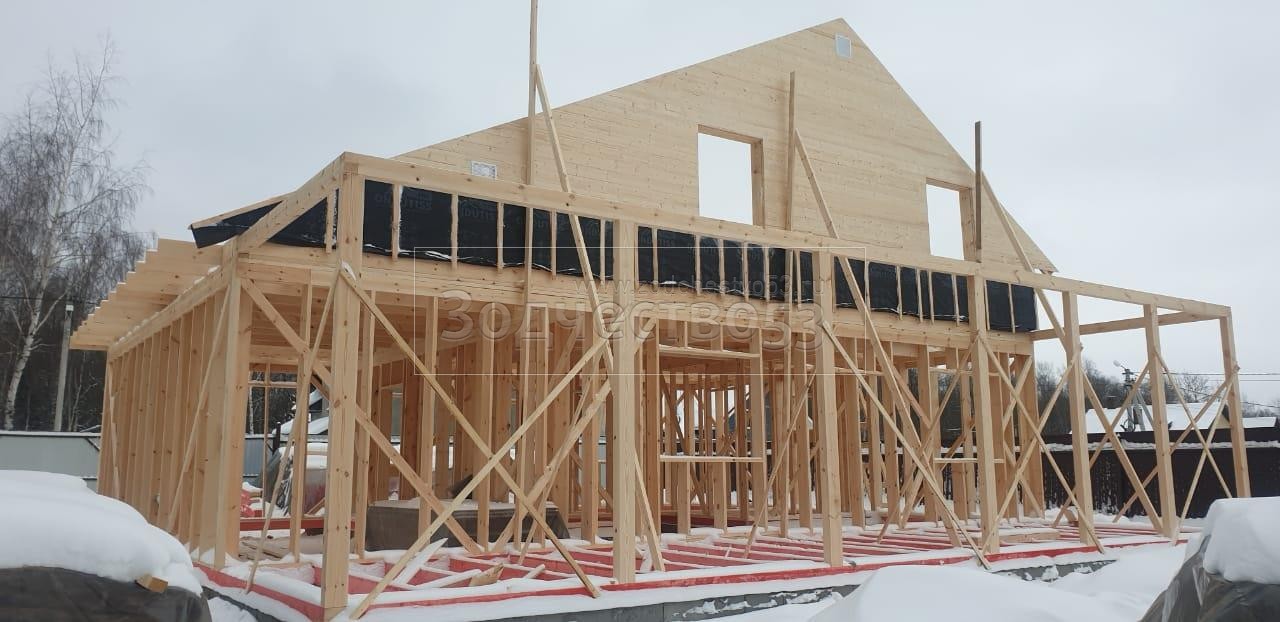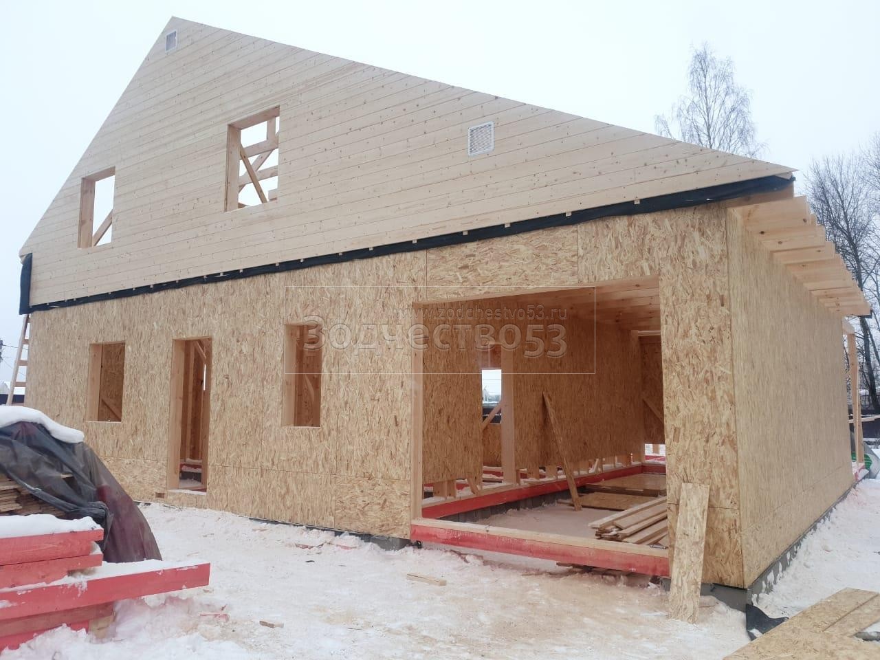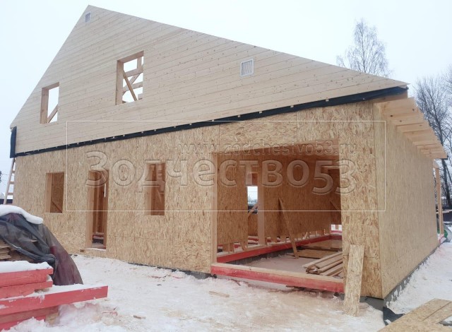 Постройка полутораэтажного дома с гаражом, открытой террасой и крыльцом общими размерами 13.20×11.70 ( 8.70×11.70 дом с гаражом ) каркасно-щитовой (Камерной сушки) с утеплением в 200 мм (стены) под двухскатной крышей ( один скат длиннее ) и ( 1.50×2.0 крыльцо ) под отдельной двухскатной крышей и ( 3.0×11.70 открытая терраса ) под отдельной односкатной крышей ( вальмами ).