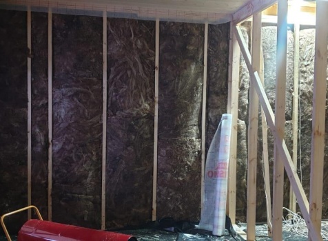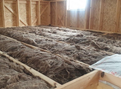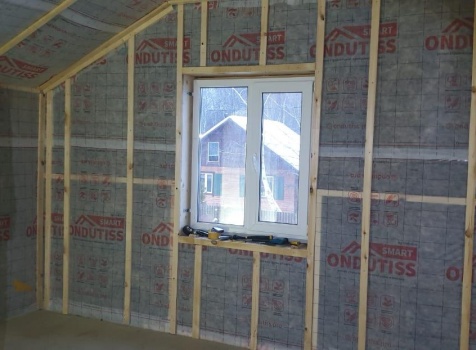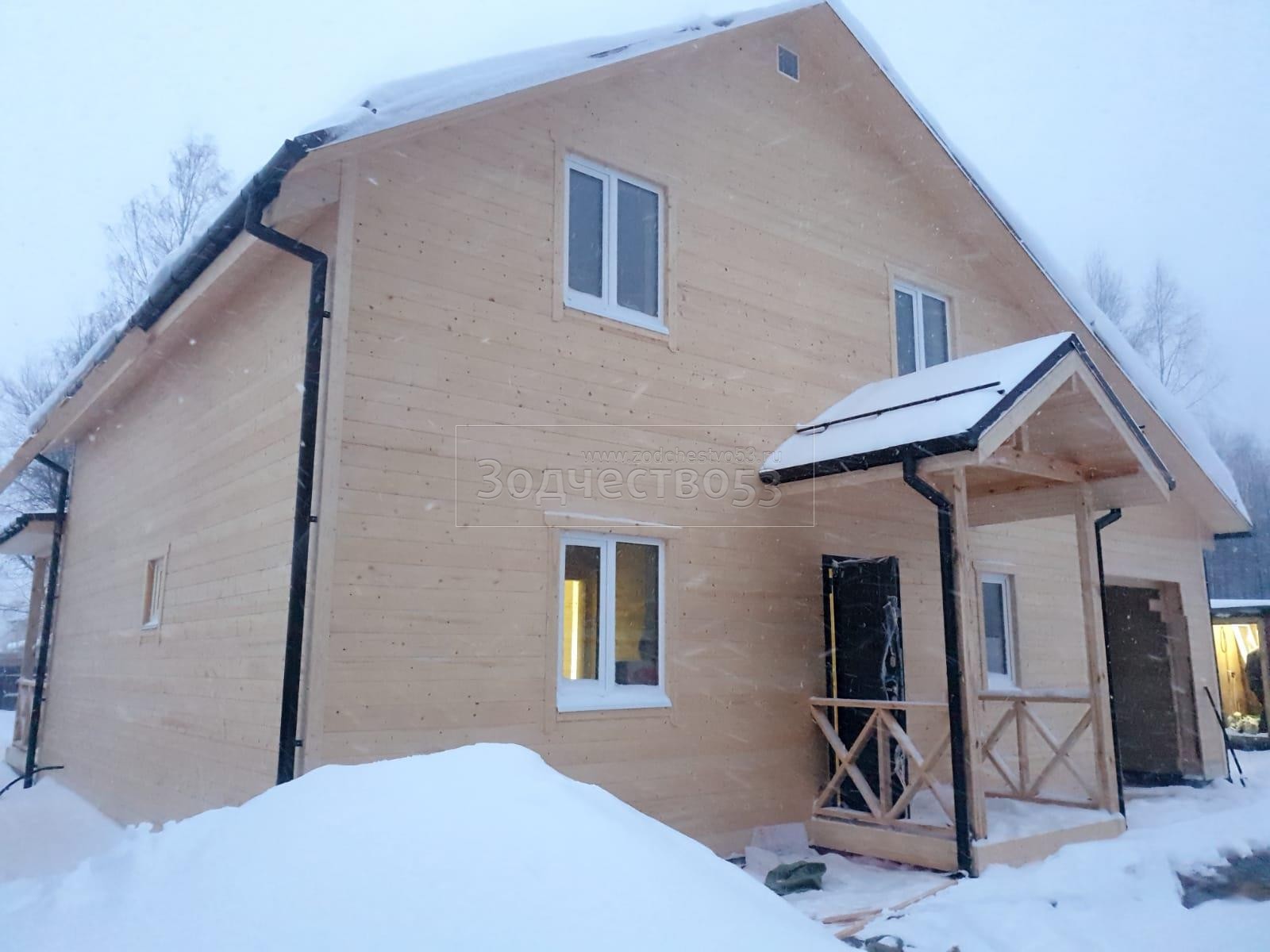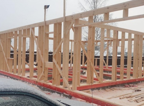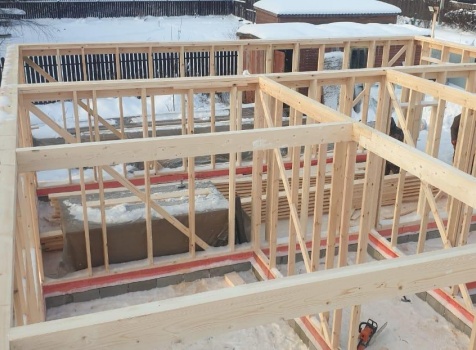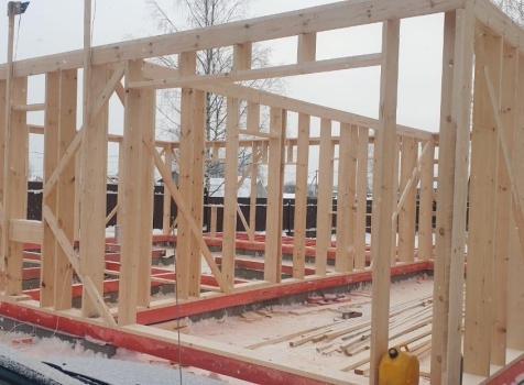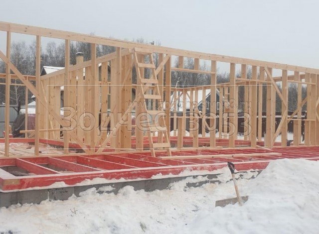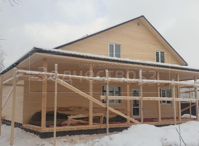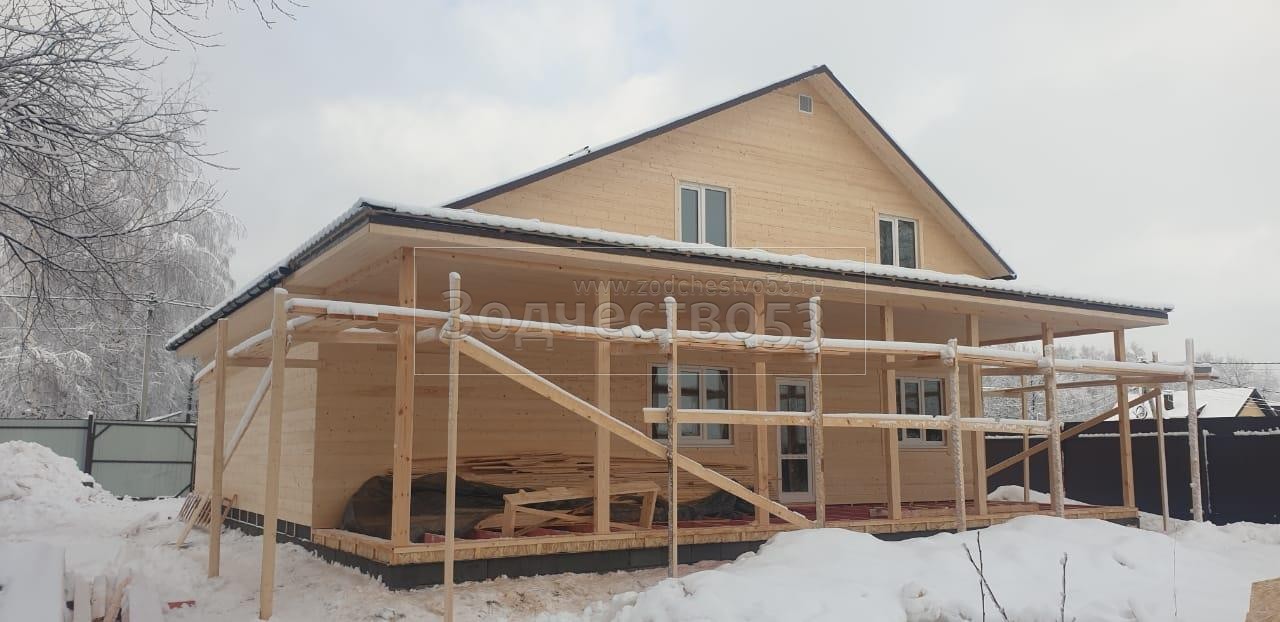 Постройка полутораэтажного дома с гаражом, открытой террасой и крыльцом общими размерами 13.20×11.70 ( 8.70×11.70 дом с гаражом ) каркасно-щитовой (Камерной сушки) с утеплением в 200 мм (стены) под двухскатной крышей ( один скат длиннее ) и ( 1.50×2.0 крыльцо ) под отдельной двухскатной крышей и ( 3.0×11.70 открытая терраса ) под отдельной односкатной крышей ( вальмами ).