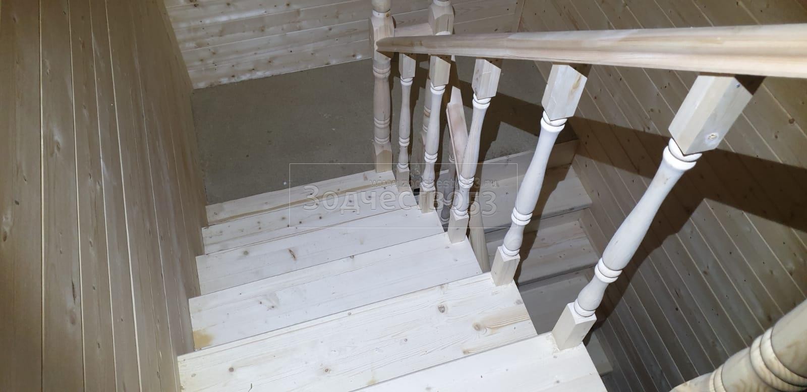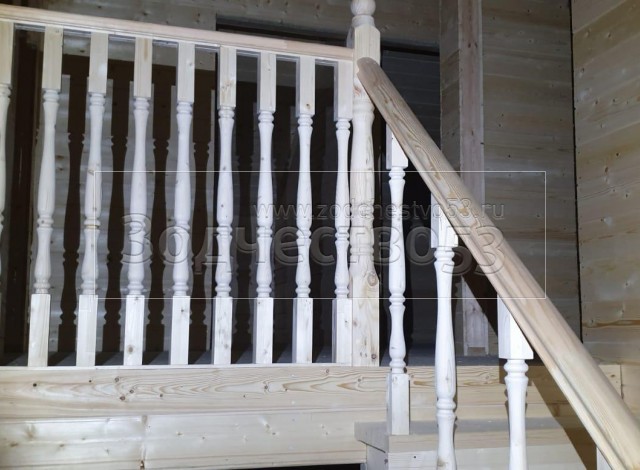 - Лестница : двухмаршевая с площадкой, точеными балясинами , стартовыми столбами и перилами .