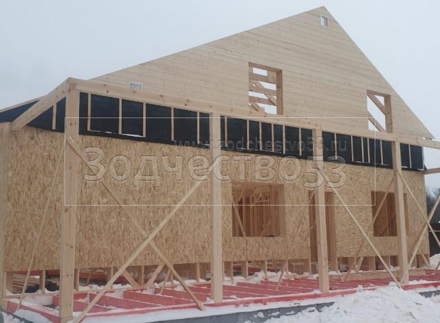 - Фронтоны на дому с гаражом 11.70 по лицевой стороне : каркасно-щитовые, обшиваются Влагостойкой фанерой ОСБ и сухой Имитацией бруса