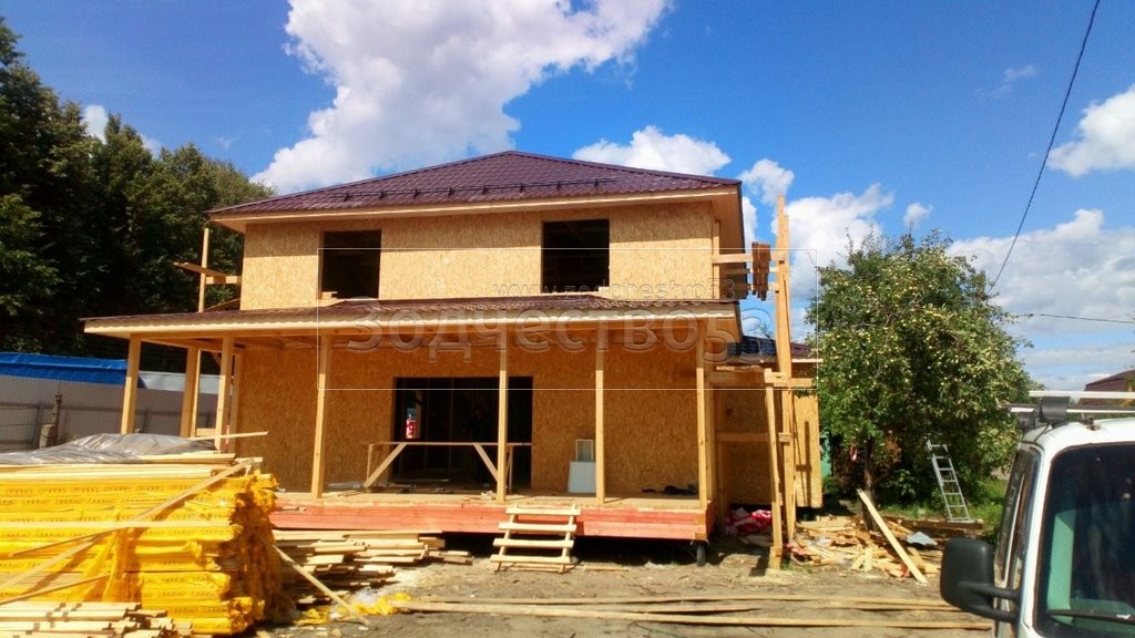Двухэтажный каркасный дом общими размерами 13.50*11.50(10.50*9.50 каркасно щитовой под четырехскатной крышей),открытая терраса 3.0*9.50 под отдельной односкатной крышей со скошенными краями и открытое крыльцо 2.0*6.50 под отдельной односкатной крышей со скошенными краями. объект построен: Московская обл.,г. Подольск, мкр Климовск, ул. Мичурина, д.7 СНТ№2 ЦНИИТОЧМАШ, уч.25.