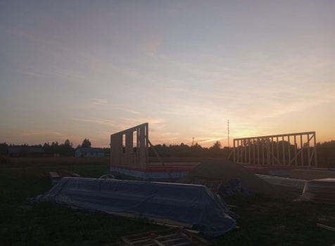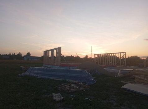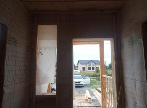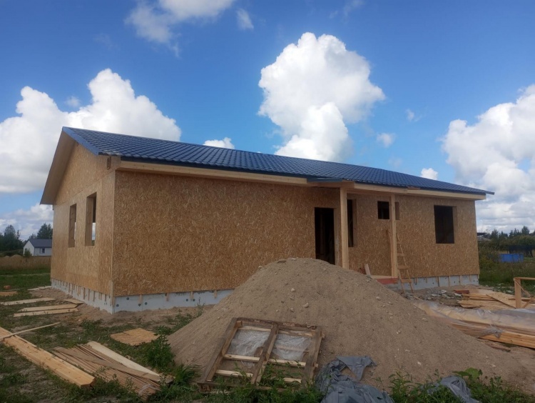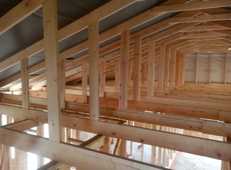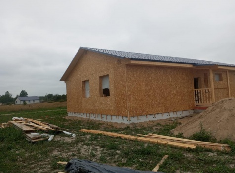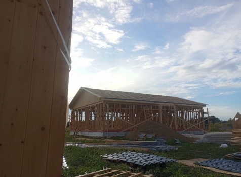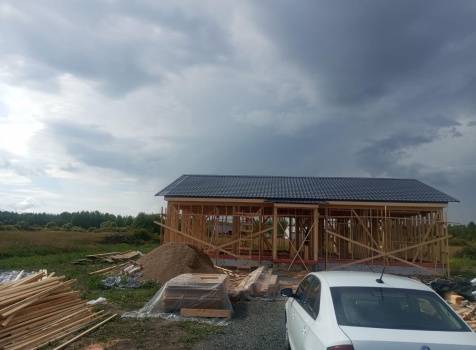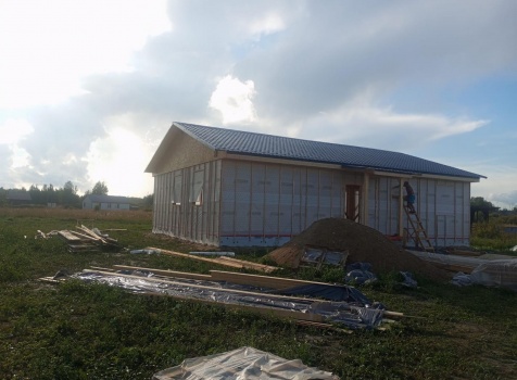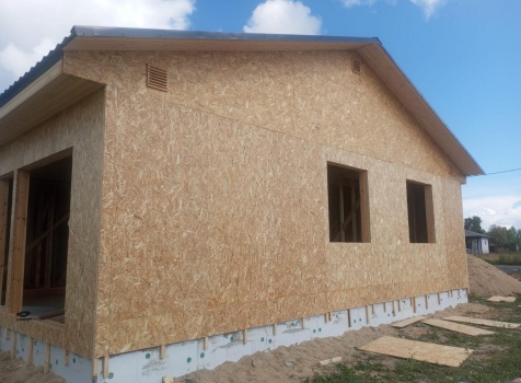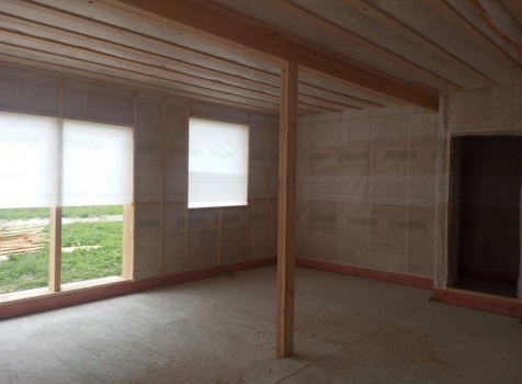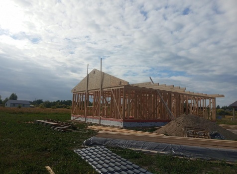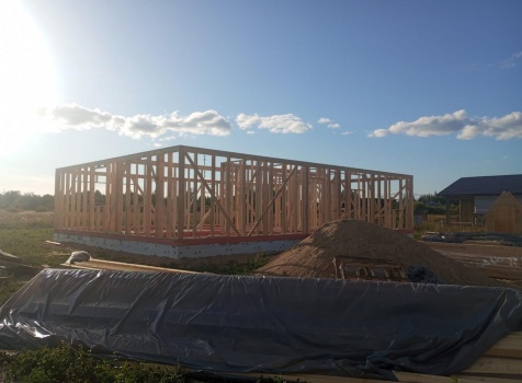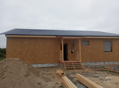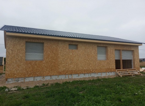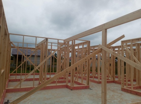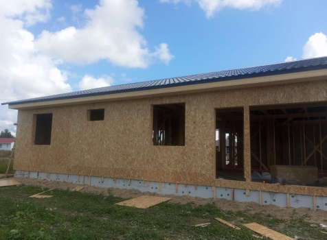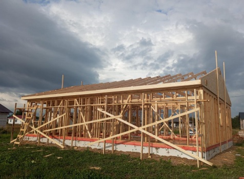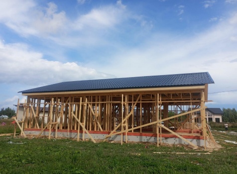 Постройка одноэтажного дома с открытым крыльцом общими размерами 13.50×11.50 ( 13.50×10.0 дом ) каркасно-щитовой Камерной сушки каркас с утеплением стен ( 200 мм перехлест ) под двухскатной крышей и ( 2.0×1.50 открытое крыльцо ) под отдельной односкатной крышей .