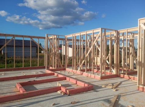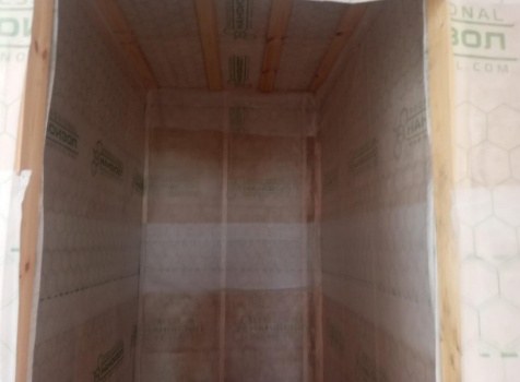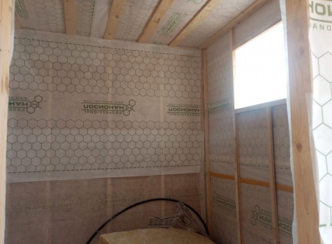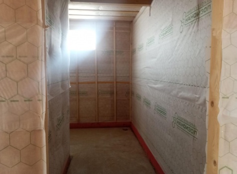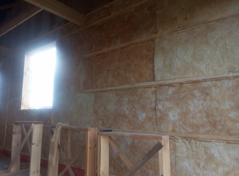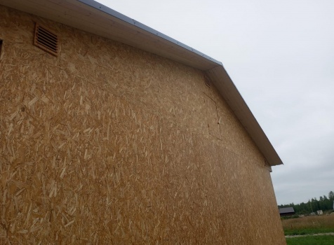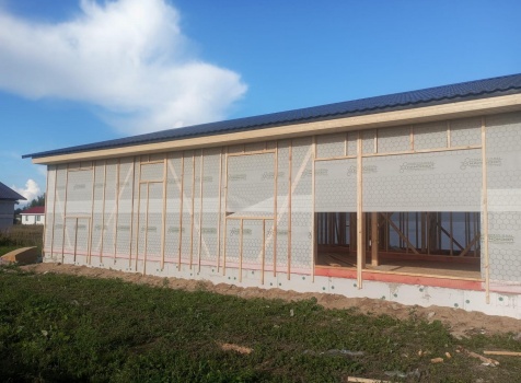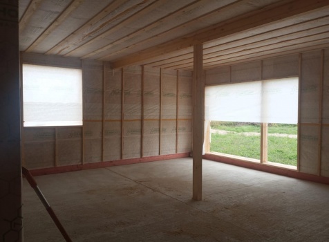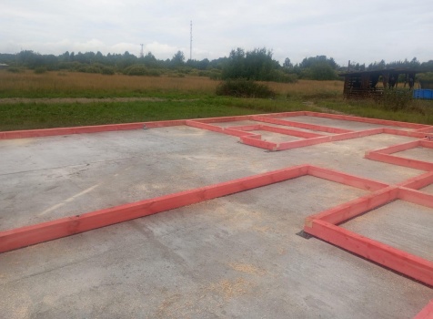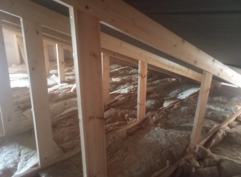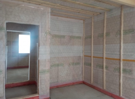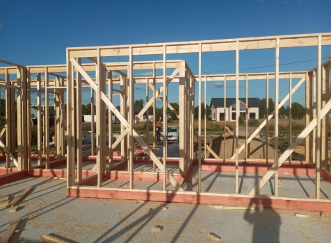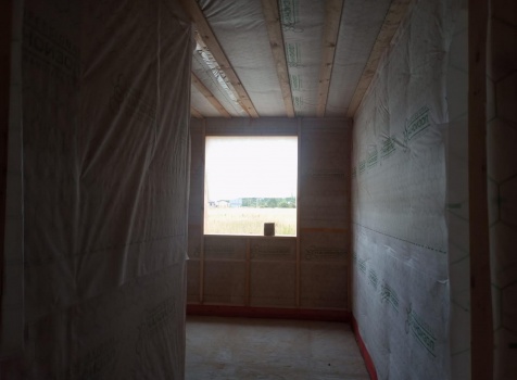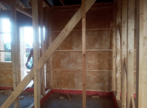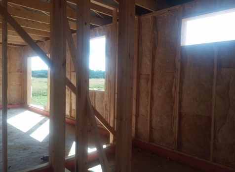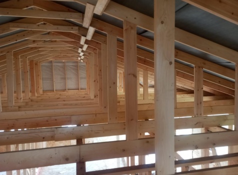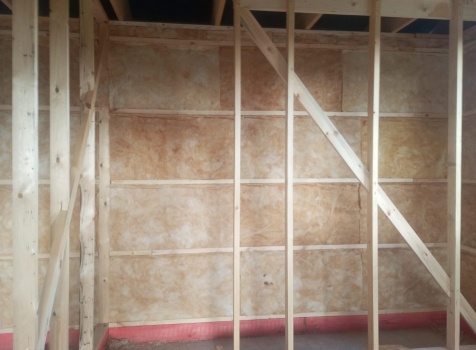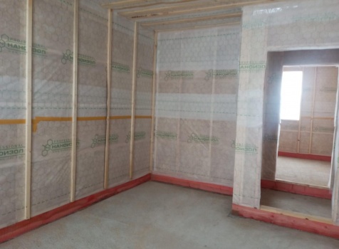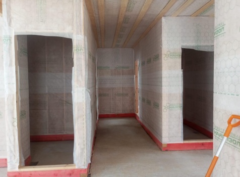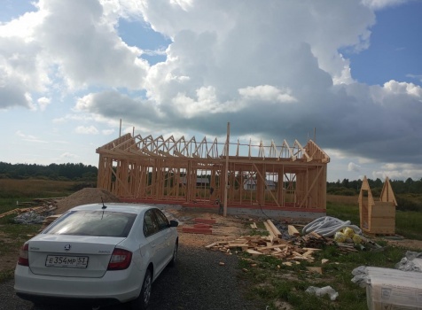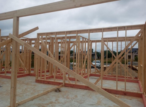 Постройка одноэтажного дома с открытым крыльцом общими размерами 13.50×11.50 ( 13.50×10.0 дом ) каркасно-щитовой Камерной сушки каркас с утеплением стен ( 200 мм перехлест ) под двухскатной крышей и ( 2.0×1.50 открытое крыльцо ) под отдельной односкатной крышей .