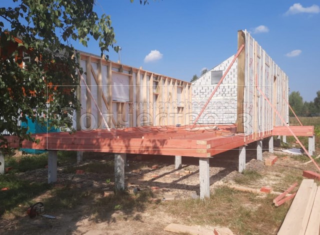 Постройка одноэтажного дома общими размерами 13.50х7.50 (10.50х6.0 каркасно –щитовой Камерной сушки каркас в 200 мм) и открытая терасса 3.0х6.0 под общей двухскатной крышей плюс крыльцо 2.0х1.50 под отдельной двухскатной крышей .