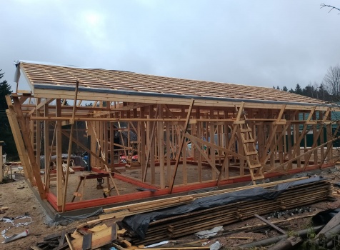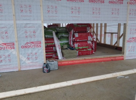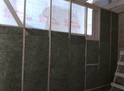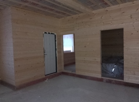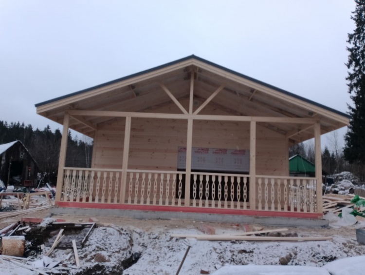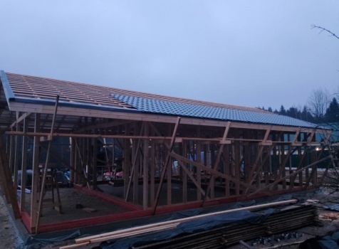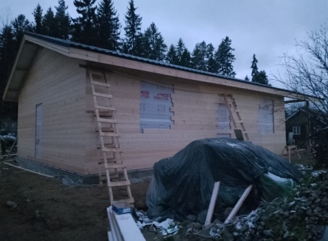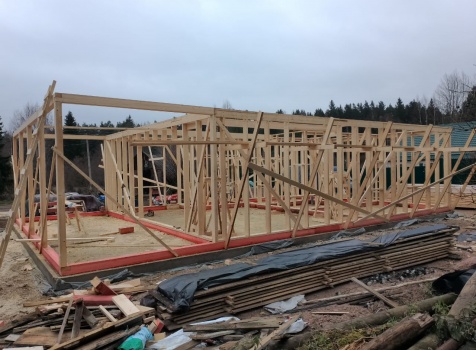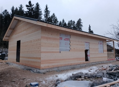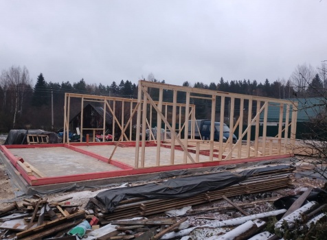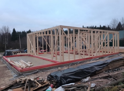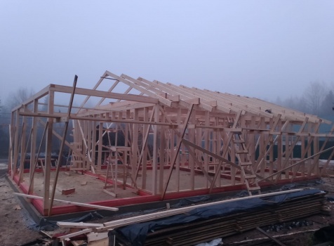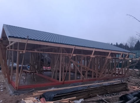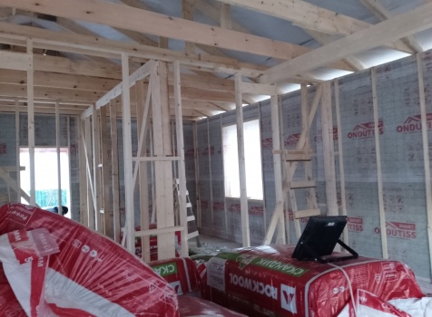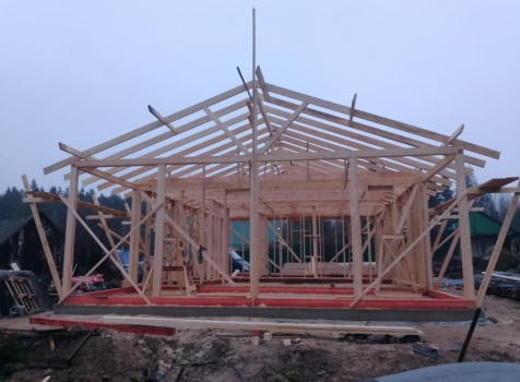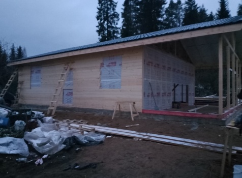 Постройка одноэтажного дома общими размерами 13.0×8.0 (10.0×8.0 дом ) каркасно-щитовой (Камерной сушки каркас ) с утеплением стен 150 мм и ( 3.0×8.0 открытая терраса ) под общей двухскатной крышей.