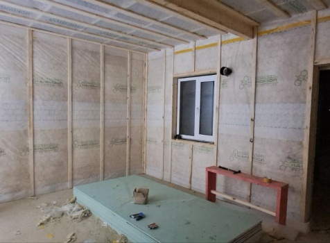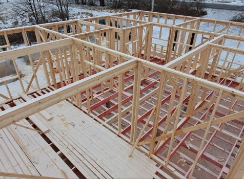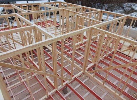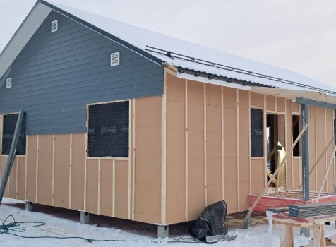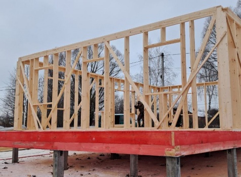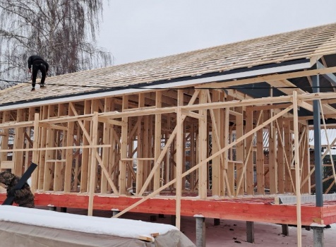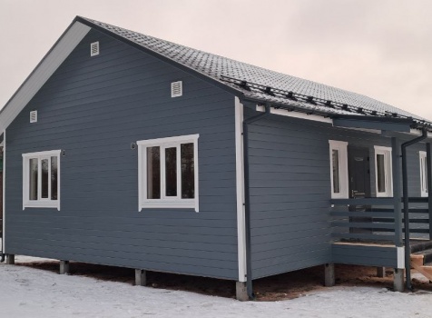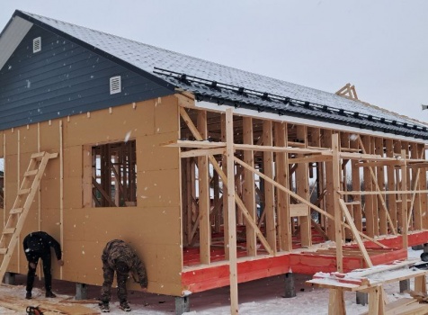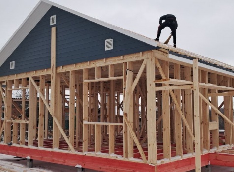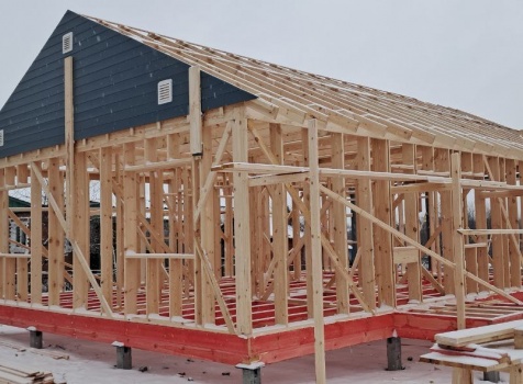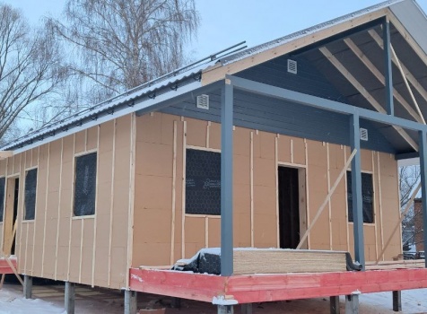 Постройка одноэтажного дома с открытой террасой и открытым крыльцом общими размерами 13.0×9.50 ( 10.50×8.0 дом ) каркасно-щитовой ( Камерной сушки ) с утеплением в 200 мм ( стены ) и ( 2.50×8.0 открытая терраса ) под общей двухскатной крышей и ( 2.0×1.50 открытое крыльцо ) под отдельной односкатной крышей