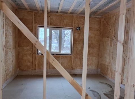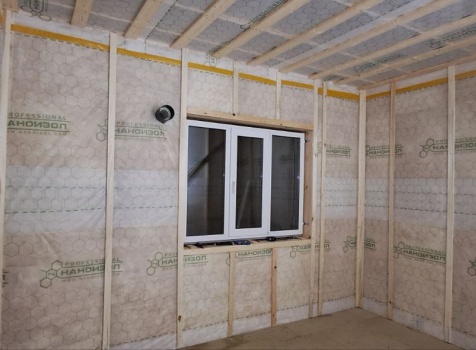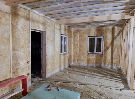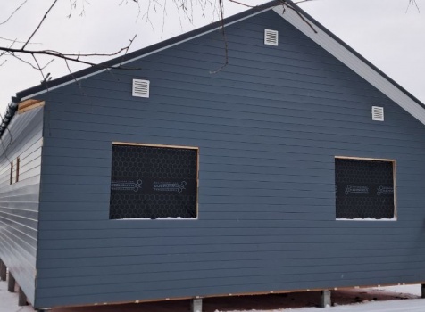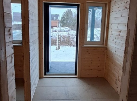 Стены : каркасно-щитовые , каркас снаружи обшивается Белтермо и сухой Имитацией бруса ( Заводская покраска . Цвет — 7031 ), а внутри сухой Имитацией бруса