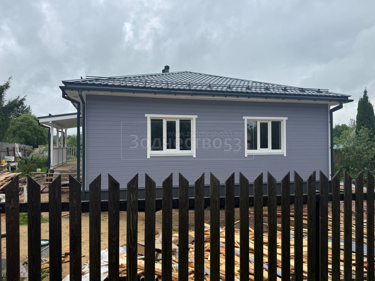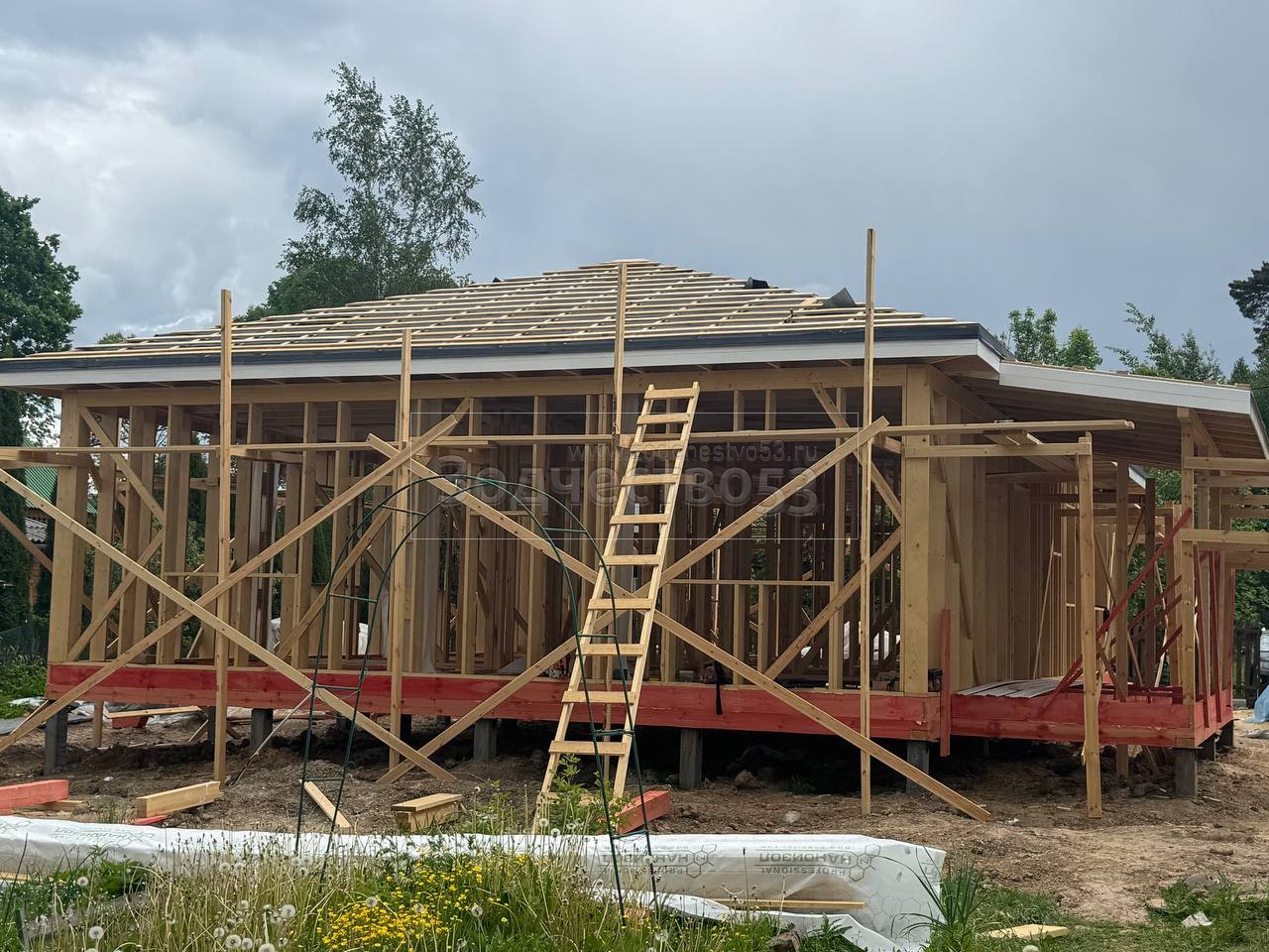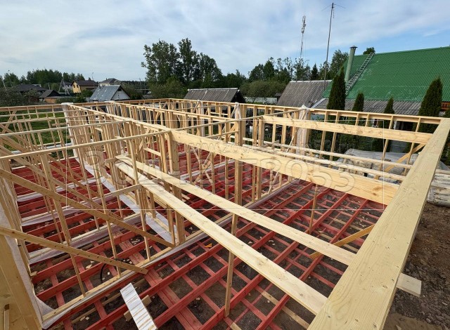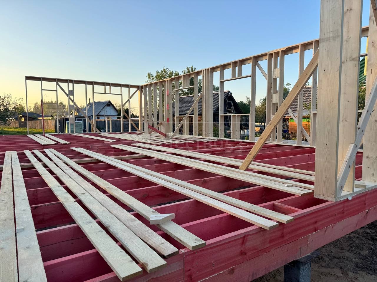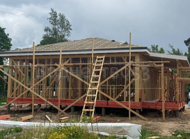 Постройка одноэтажного дома с открытой террасой , общими размерами 14.0×11.0 ( 14.0×9.0 дом ) каркасно-щитовой ( Камерной сушки ) с утеплением в 200 мм ( стены ) под четырёхскатной крышей ( тип конвертом ) и ( 6.0×2.0 открытая терраса ) под отдельной односкатной крышей