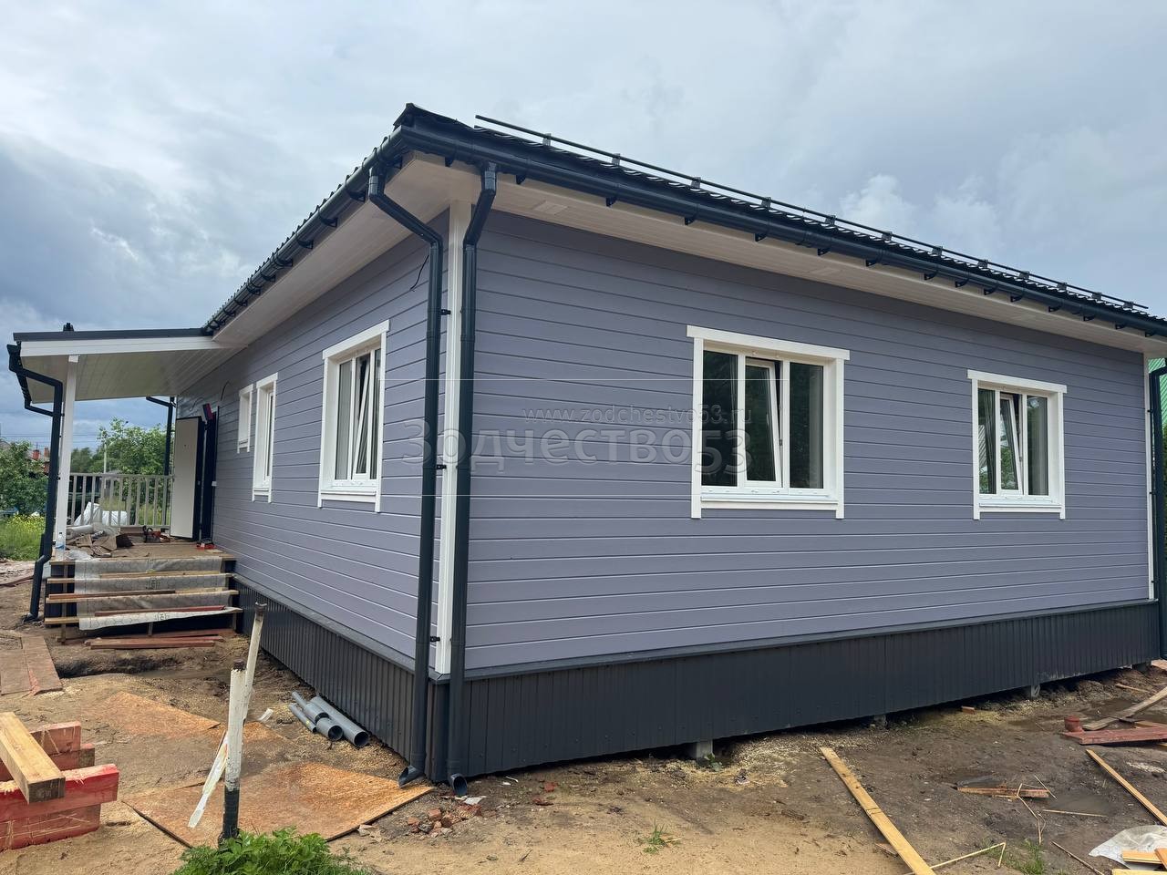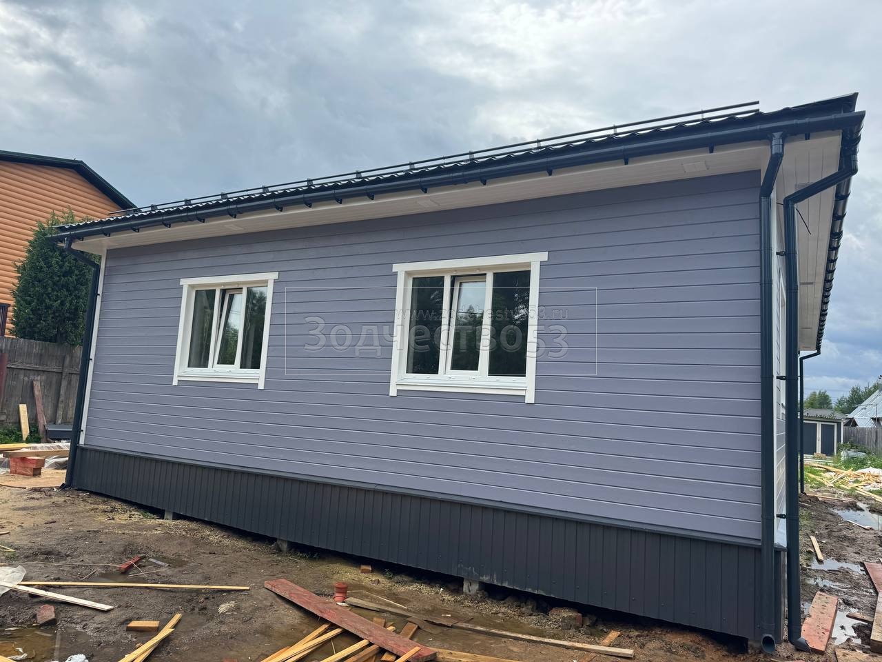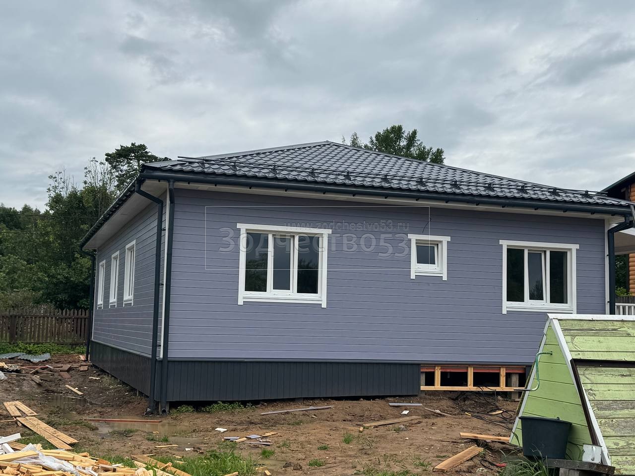 Постройка одноэтажного дома с открытой террасой , общими размерами 14.0×11.0 ( 14.0×9.0 дом ) каркасно-щитовой ( Камерной сушки ) с утеплением в 200 мм ( стены ) под четырёхскатной крышей ( тип конвертом ) и ( 6.0×2.0 открытая терраса ) под отдельной односкатной крышей