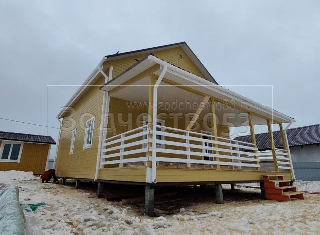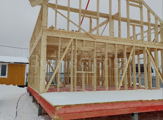 Постройка полутораэтажного дома по проекту Глафира, общими размерами 14.0×8.0 (9.0×8.0 дом) каркасно —щитовой (Камерной сушки) с утеплением в 200 мм (стены) под двухскатной крышей и открытая терраса(3.0×8.0 ) под отдельной односкатной крышей и открытое крыльцо (2.0×2.0) под отдельной односкатной крышей