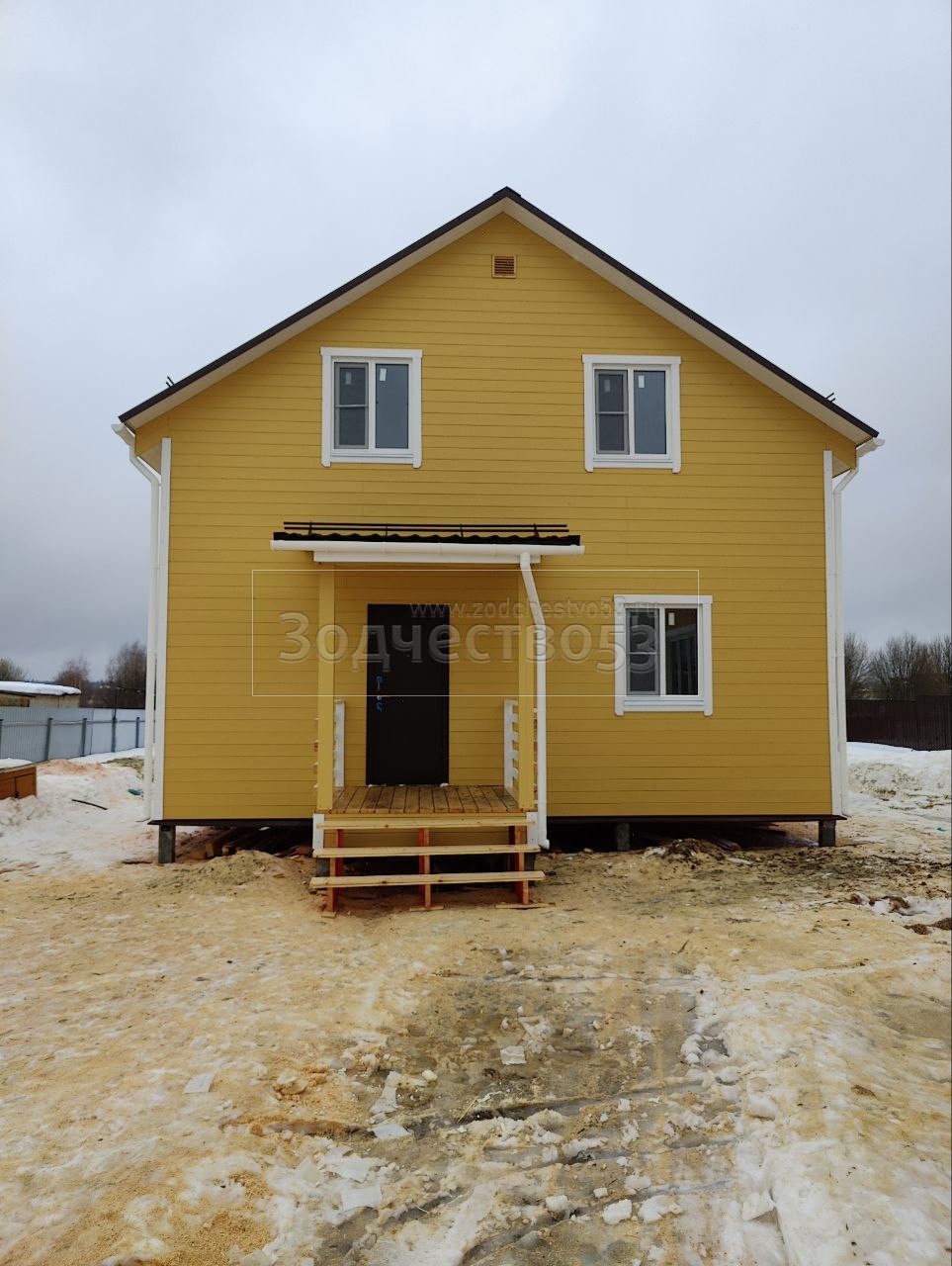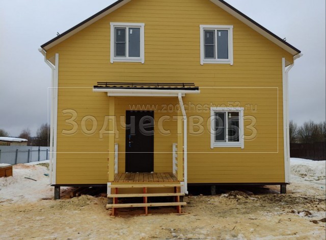 - Фронтоны на дому по 8.0 м стороне: каркасно-щитовые (Камерной сушки) обшиваются Имитацией бруса ( Заводская покраска . Цвет RAL 2673 )