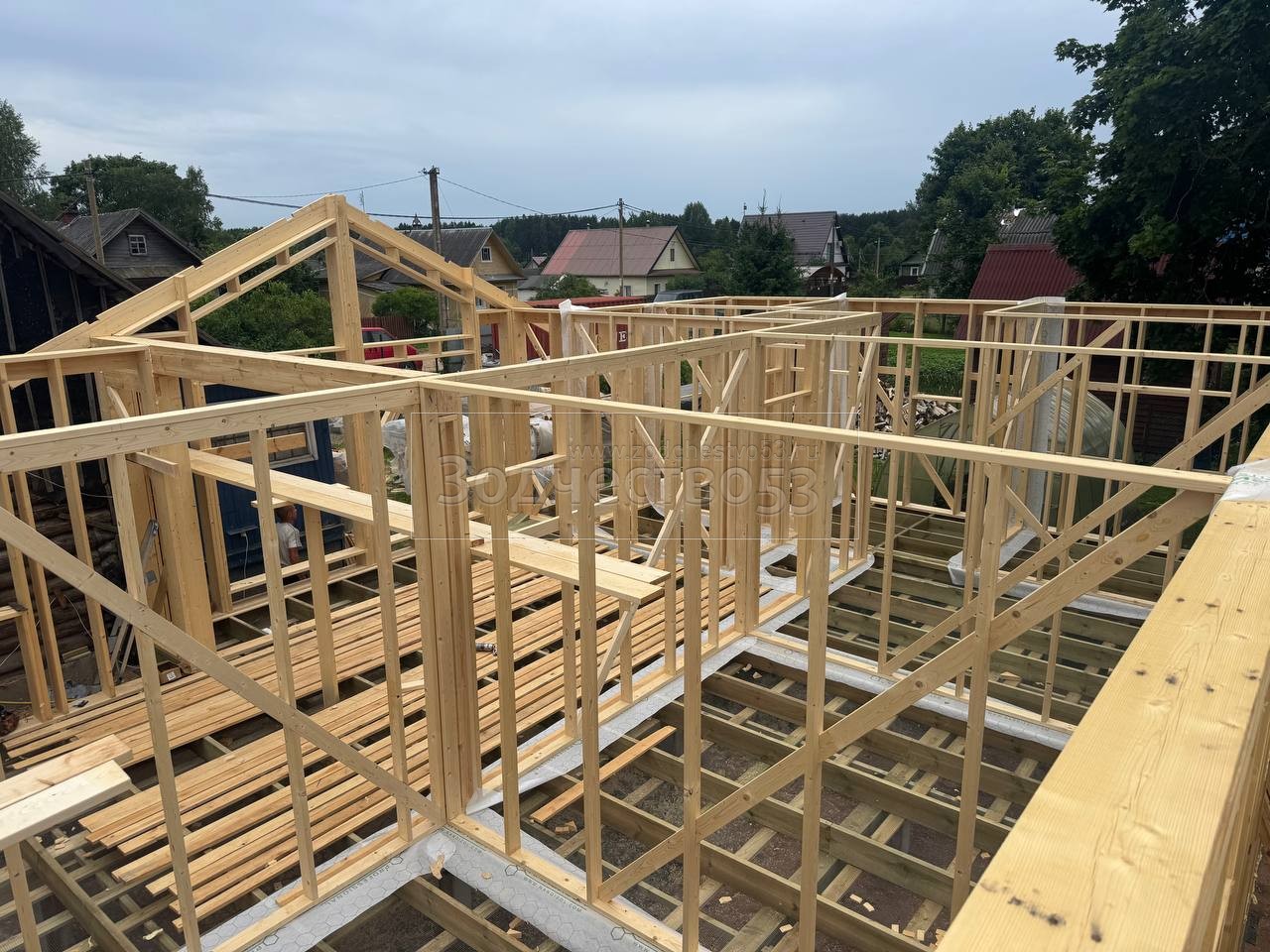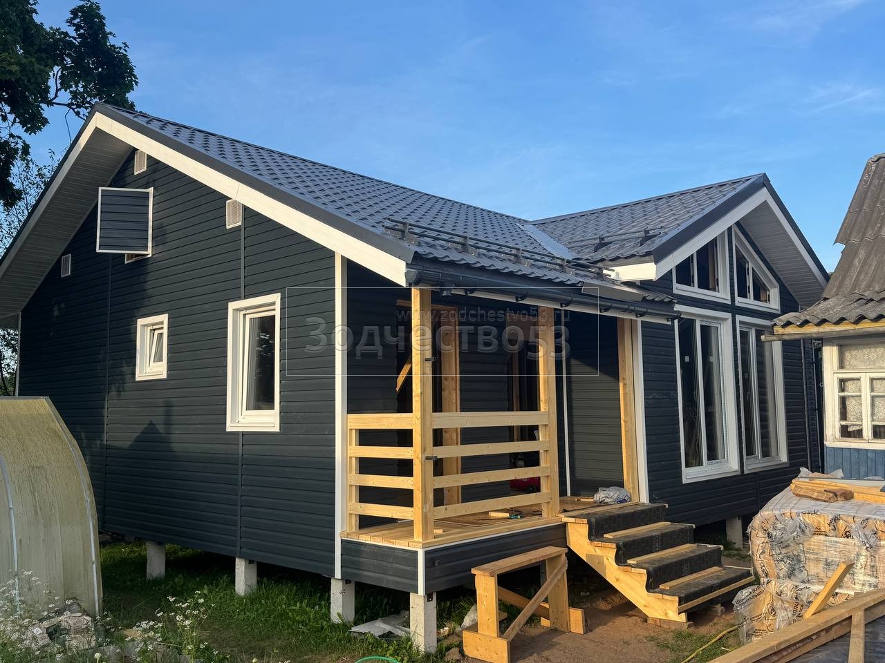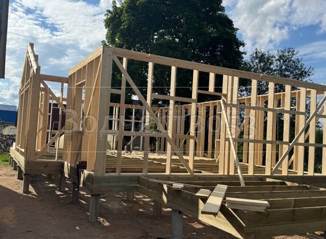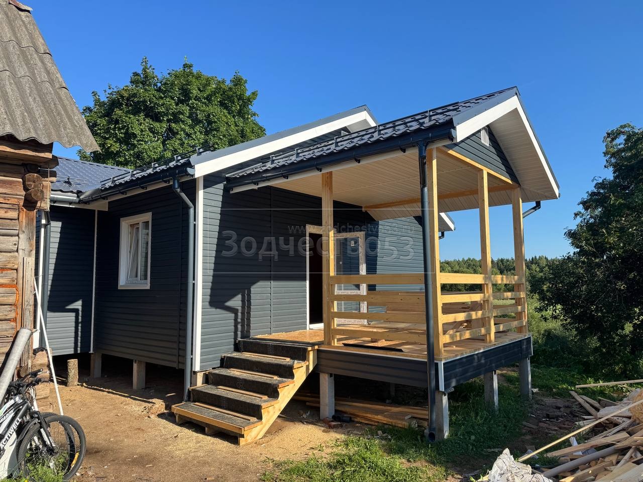Постройка одноэтажного дома с открытой террасой и открытым крыльцом общими размерами 15.50×8.50 ( 12.0×7.50 дом и 3.50×1.0 открытое крыльцо ) каркасный, Камерной сушки, с утеплением в 200 мм ( стены дома ) под общей двухскатной крышей и ( 5.0×1.0 дом ) под отдельной двухскатной крышей 3 Фронтон и ( 3.50×3.50 открытая терраса ) под отдельной двухскатной крышей: https://zodchestvo53.ru/zara